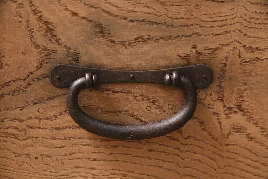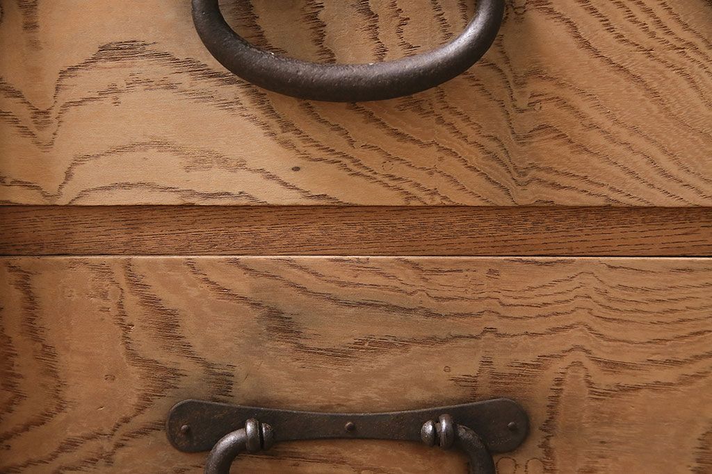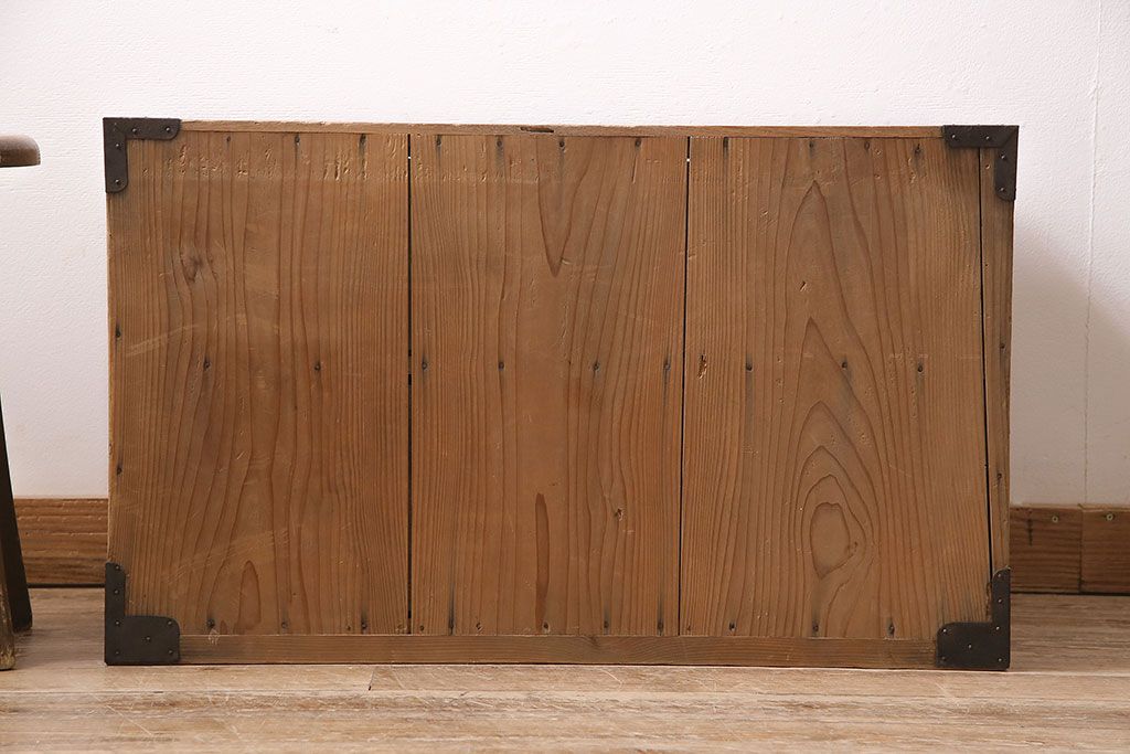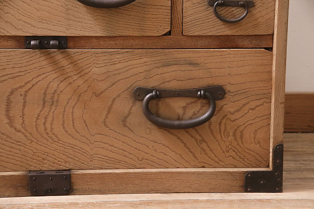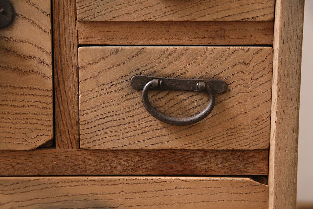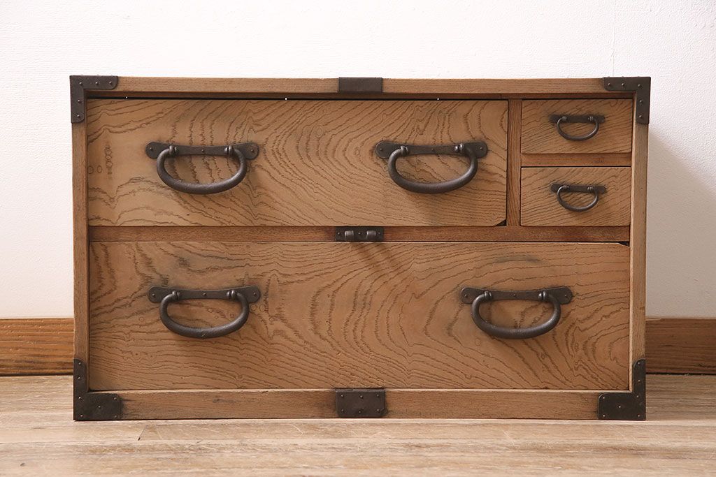 ラフジュ工房> ストリップド(剥離)家具 > アンティーク家具 明治大正期 ストリップド(剥離) 三方ケヤキ材 厚手素材 古い木肌が味わいを感じさせる小タンス(引き出し、テレビ台、リビングボード)(R-046912)