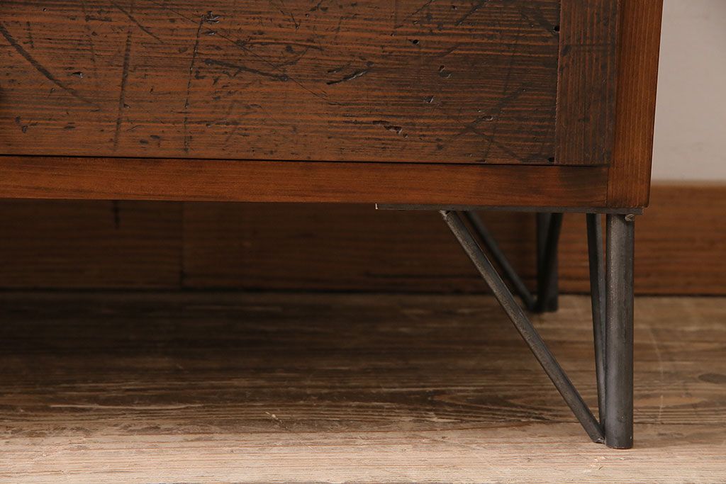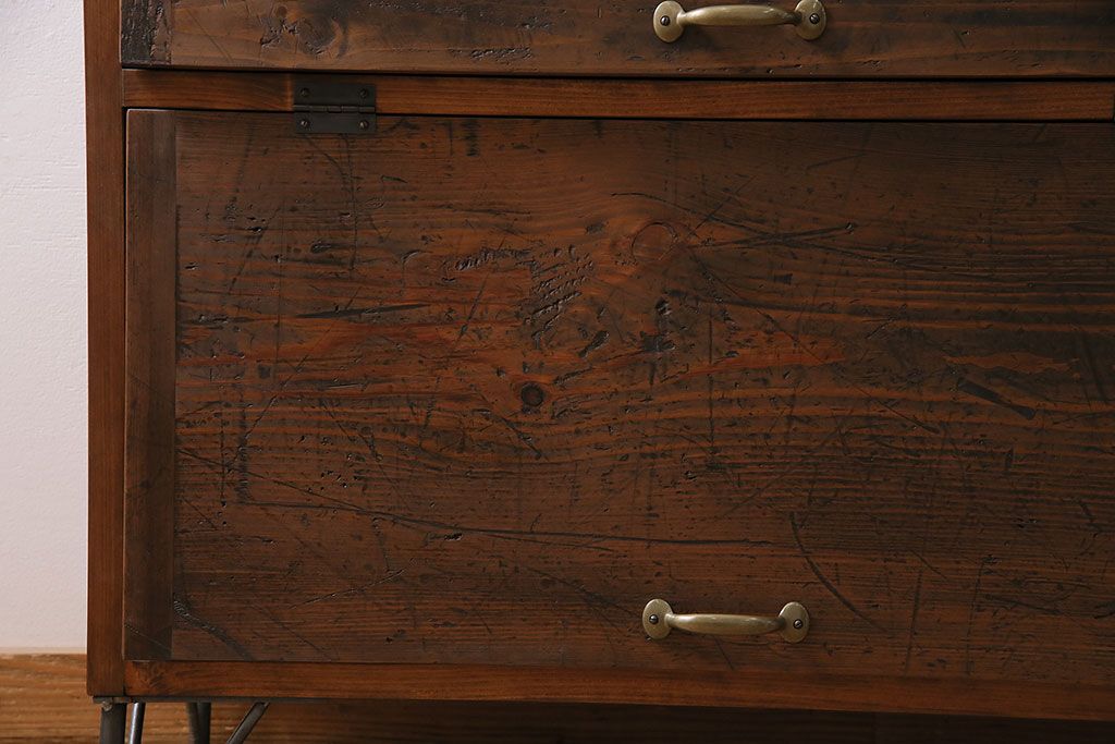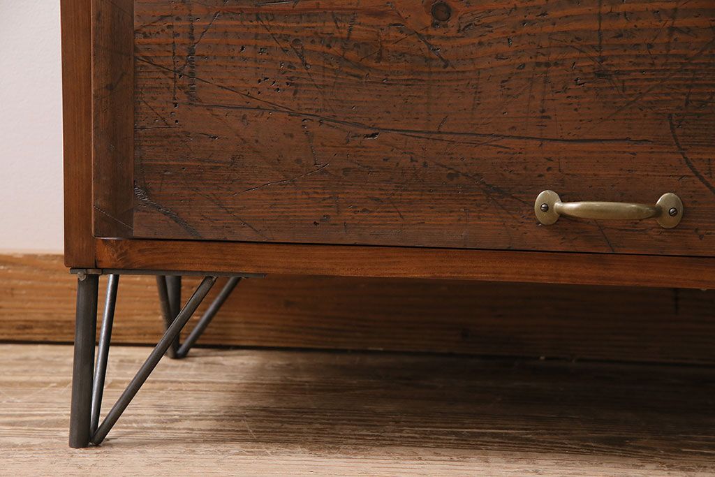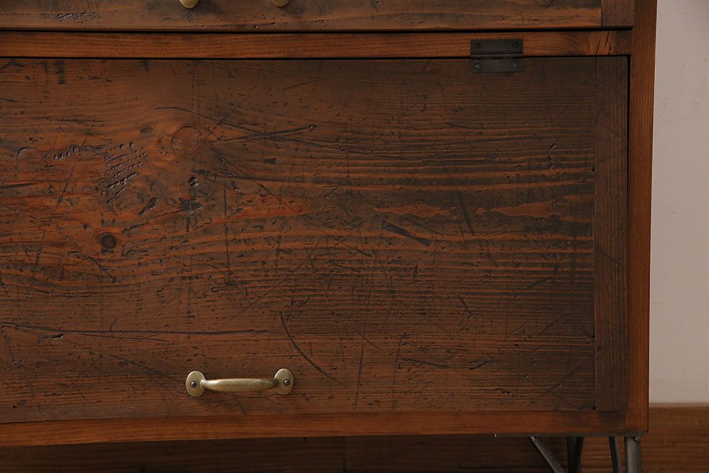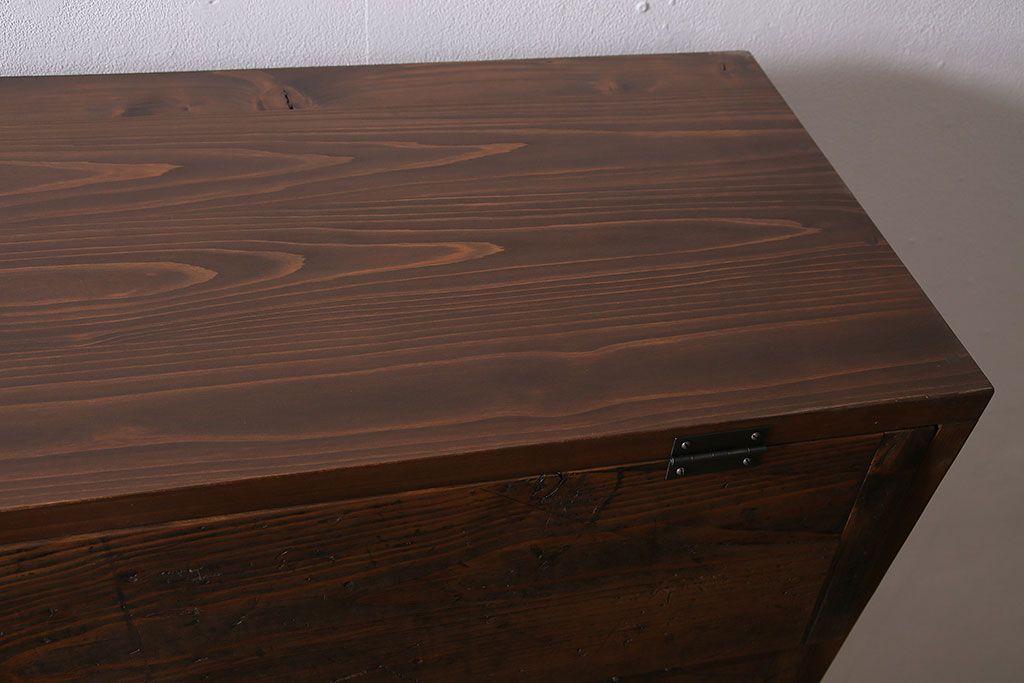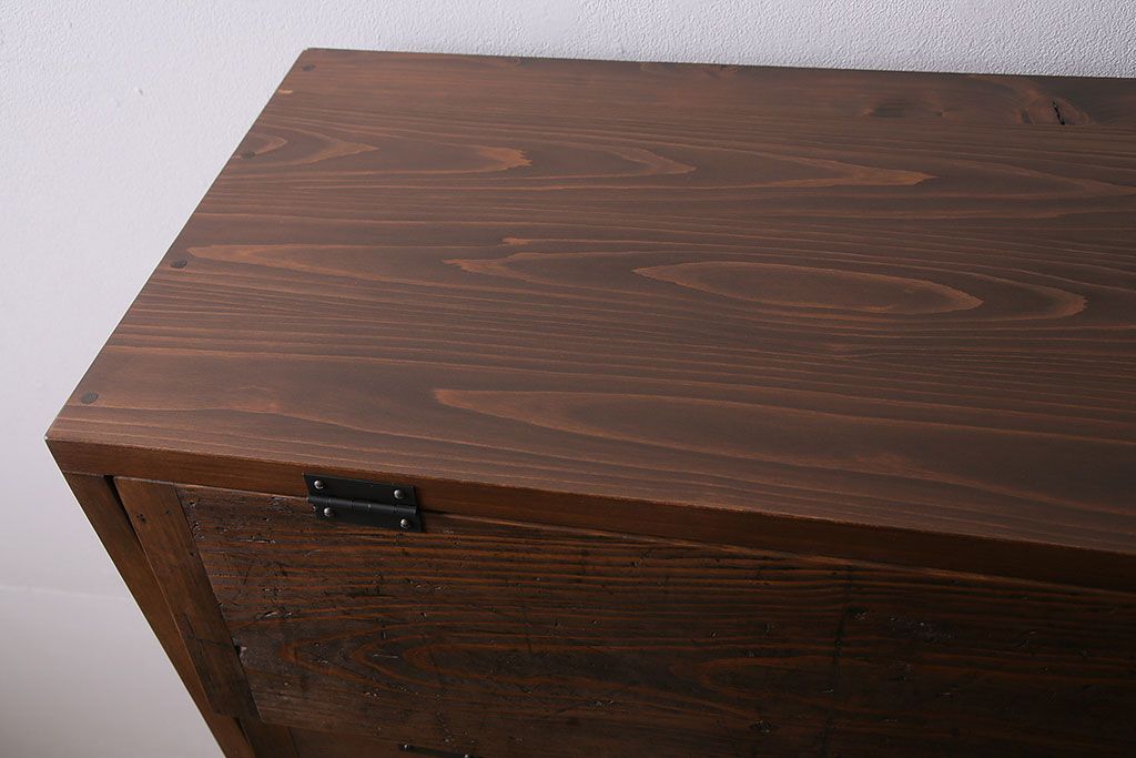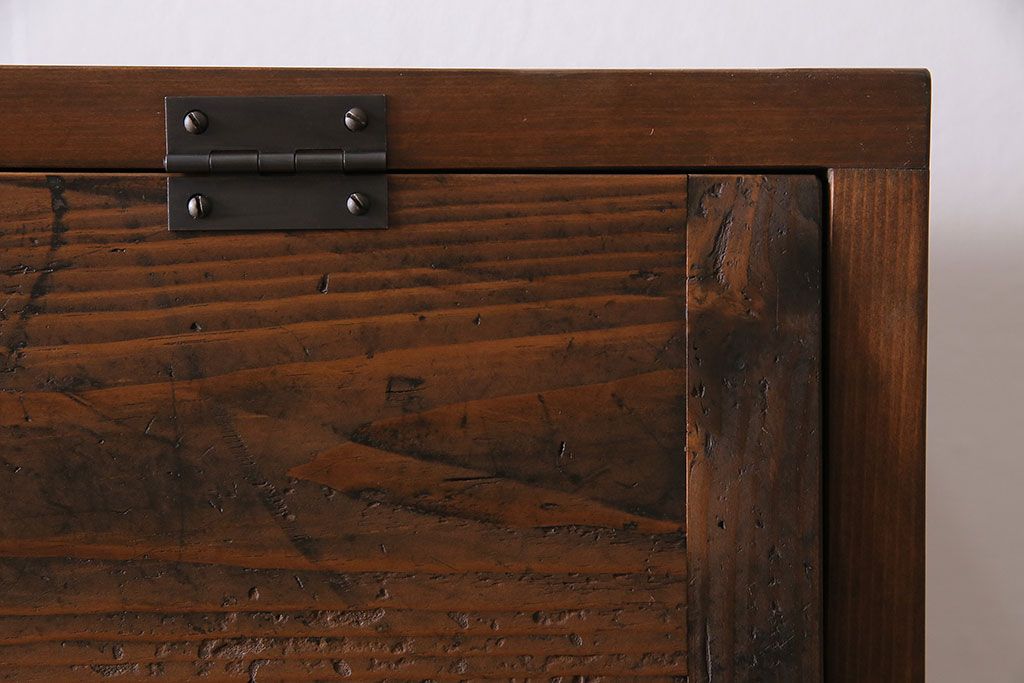 フルオーダー家具実績 > パタパタ扉の下駄箱を新規製作!本体はヒノキ無垢材、前板は古材を使用。鉄脚と取っ手を取り付け。濃い茶色で着色し仕上げ。(収納棚、戸棚、ロッカー)