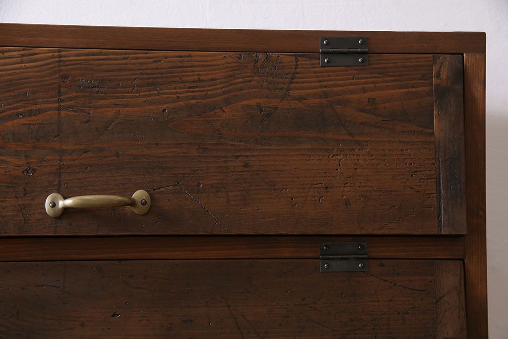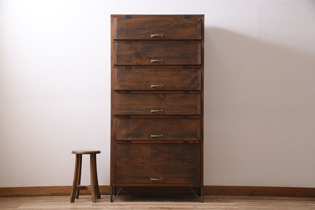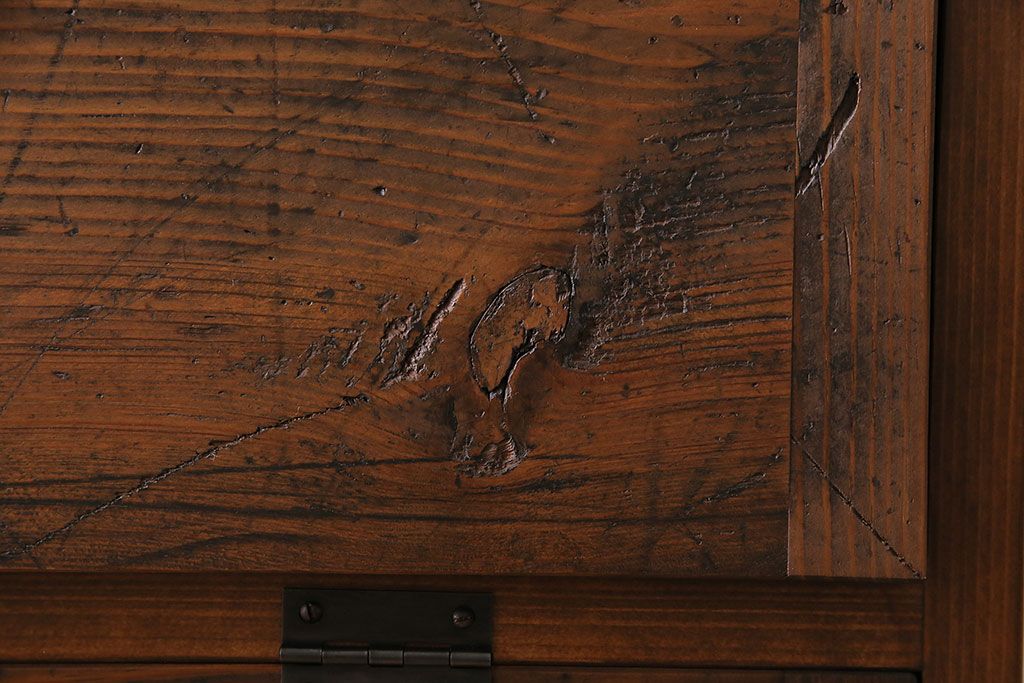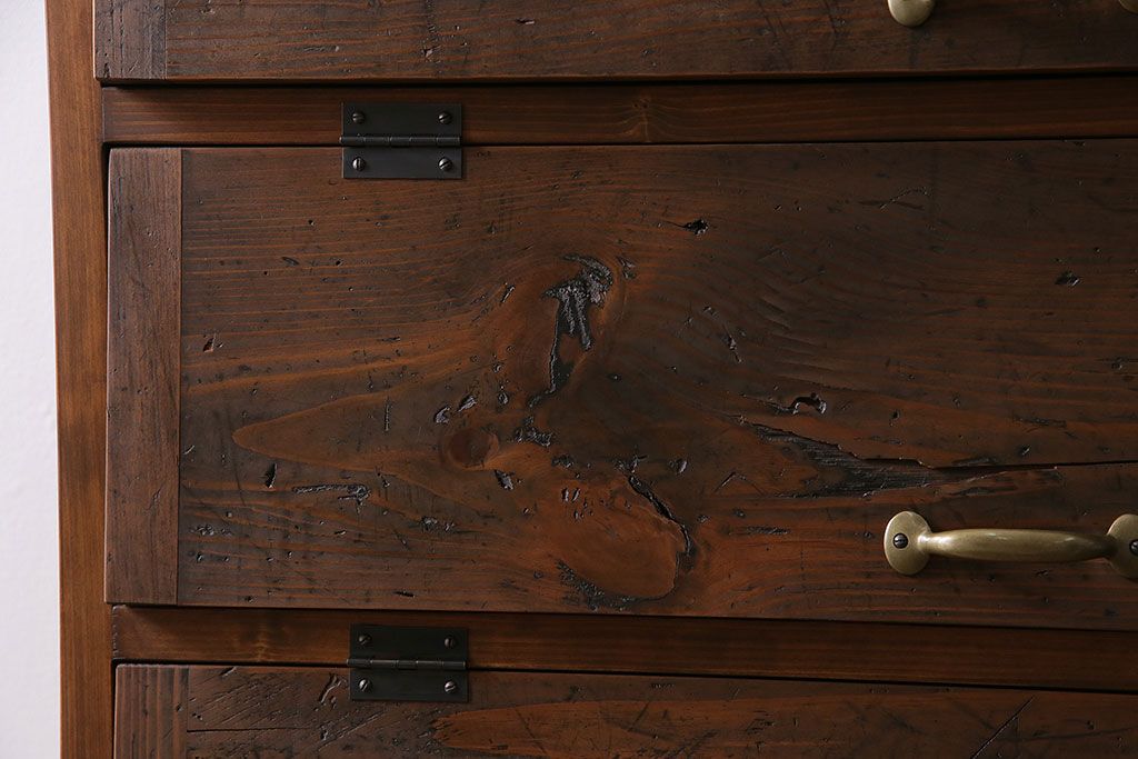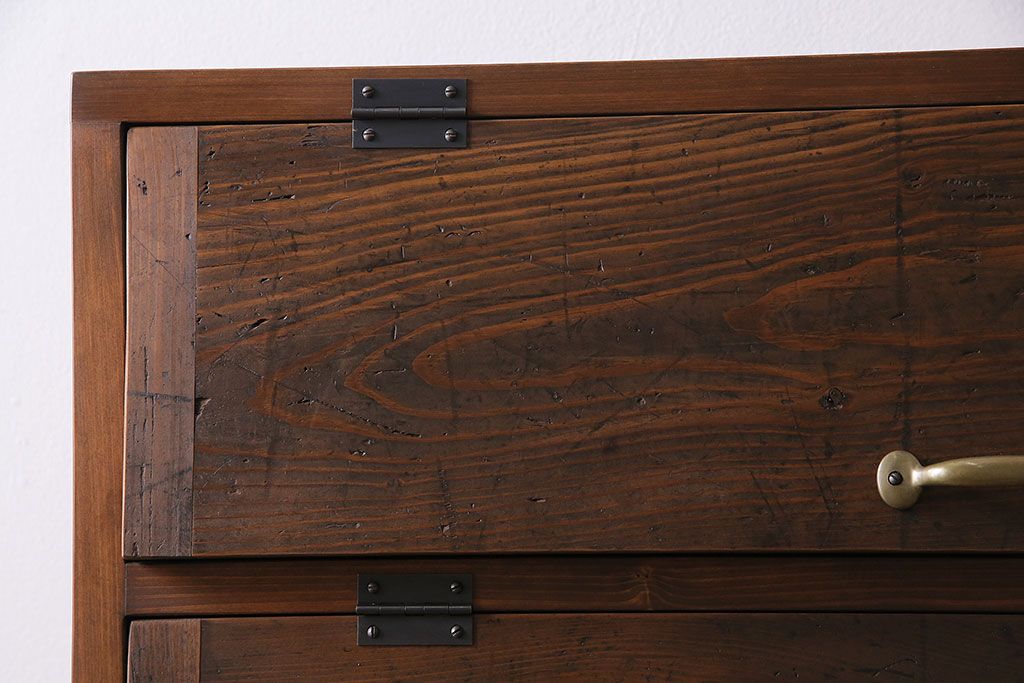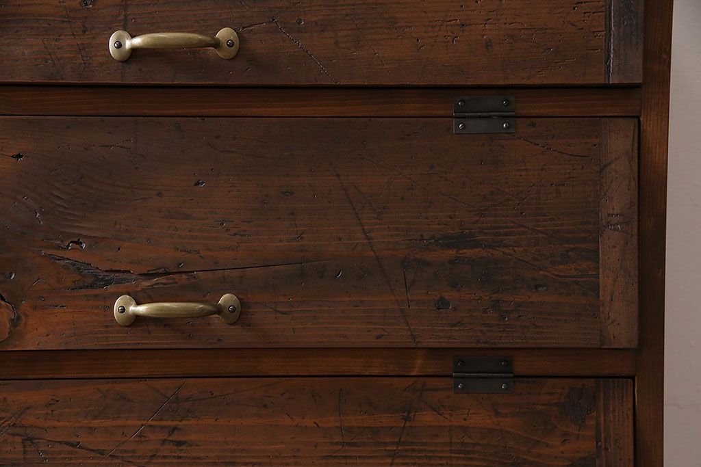 フルオーダー家具実績 > パタパタ扉の下駄箱を新規製作!本体はヒノキ無垢材、前板は古材を使用。鉄脚と取っ手を取り付け。濃い茶色で着色し仕上げ。(収納棚、戸棚、ロッカー)