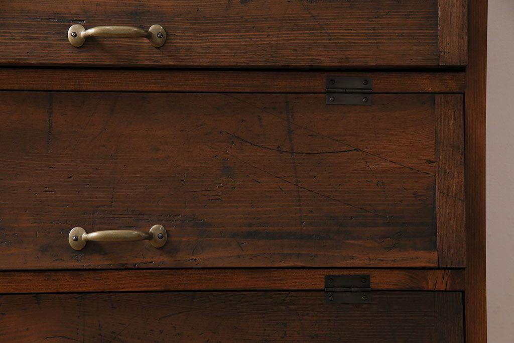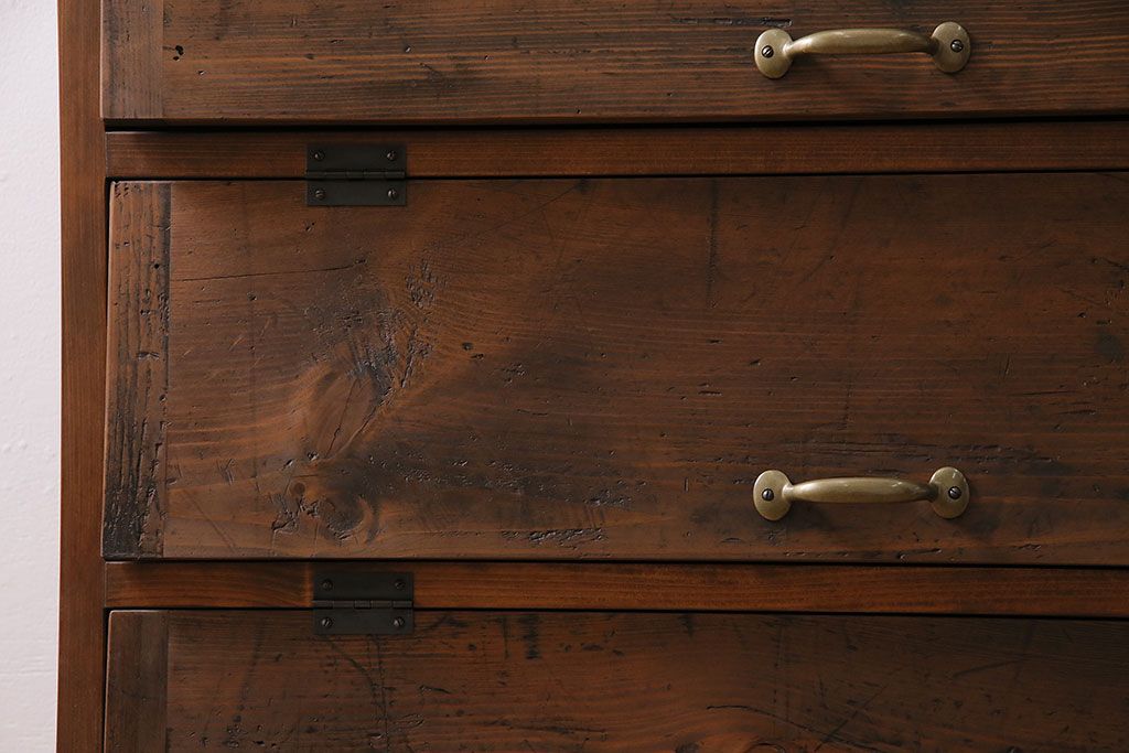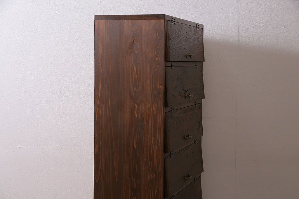 ワードローブ・ロッカー> ロッカー > パタパタ扉の下駄箱を新規製作!本体はヒノキ無垢材、前板は古材を使用。鉄脚と取っ手を取り付け。濃い茶色で着色し仕上げ。(収納棚、戸棚、ロッカー)