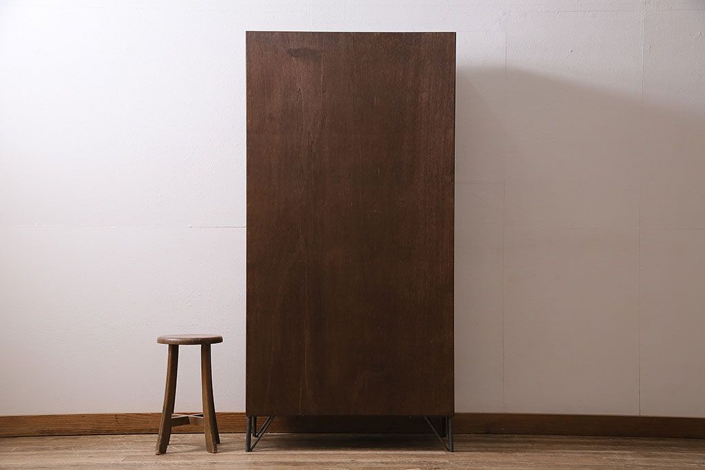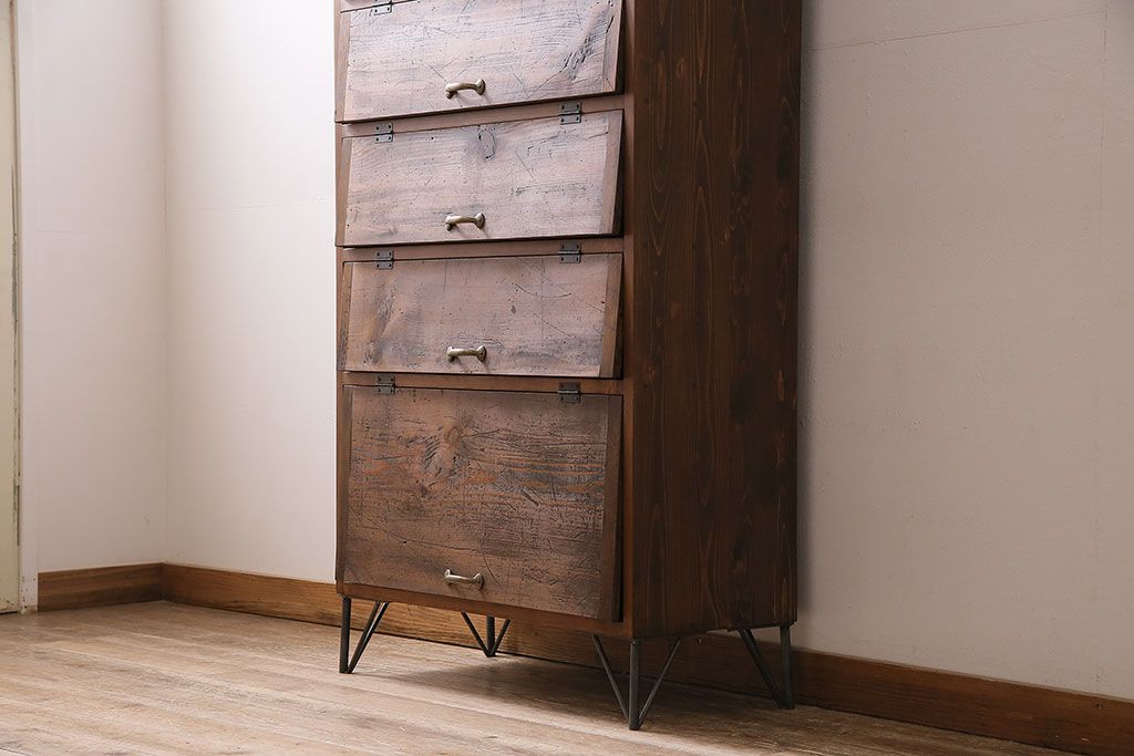 ワードローブ・ロッカー > パタパタ扉の下駄箱を新規製作!本体はヒノキ無垢材、前板は古材を使用。鉄脚と取っ手を取り付け。濃い茶色で着色し仕上げ。(収納棚、戸棚、ロッカー)