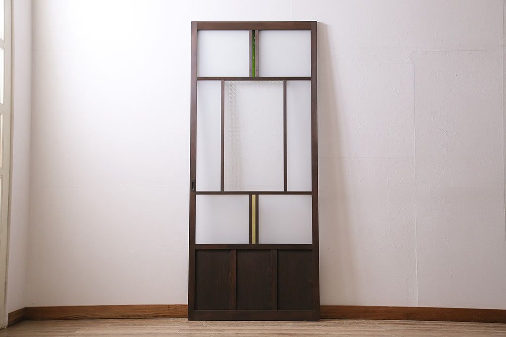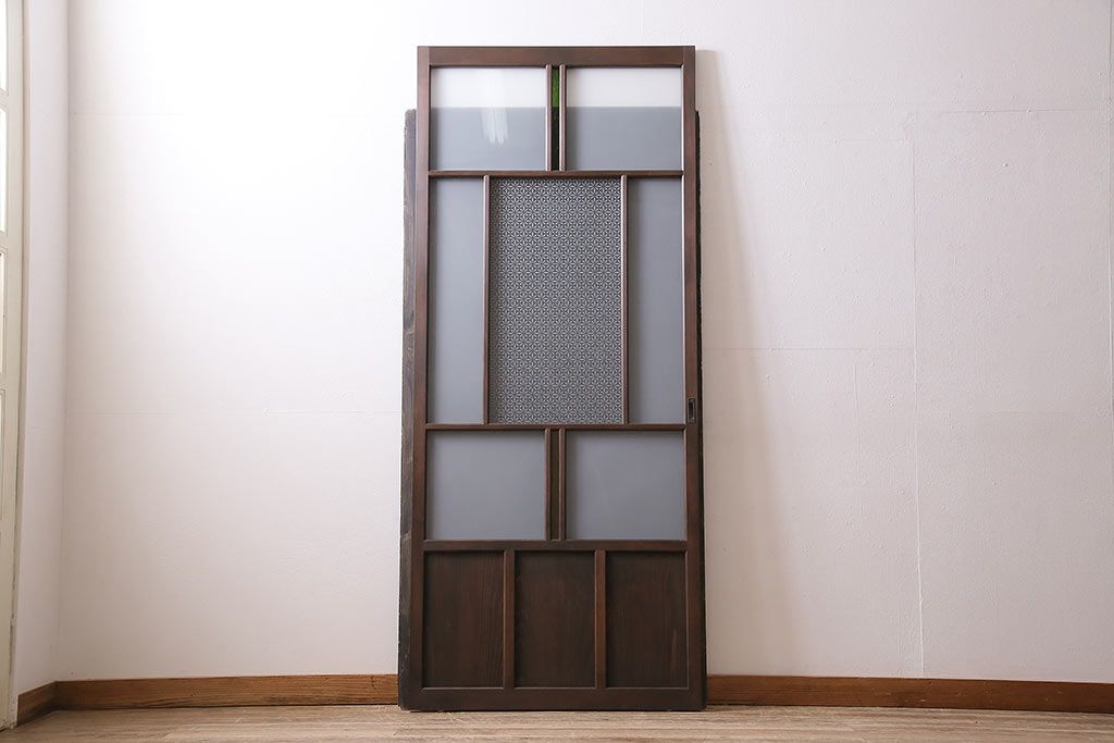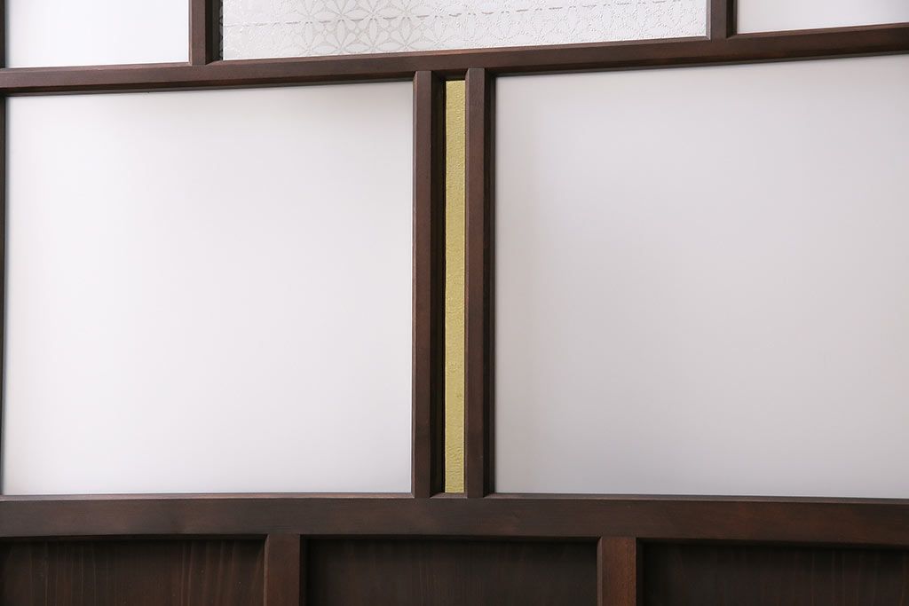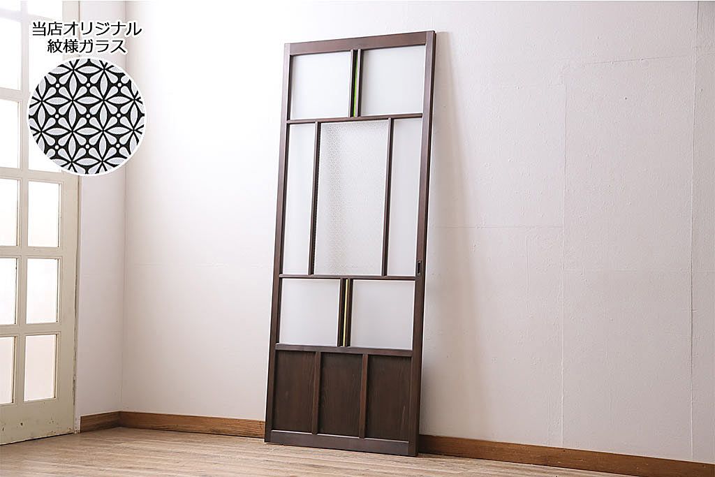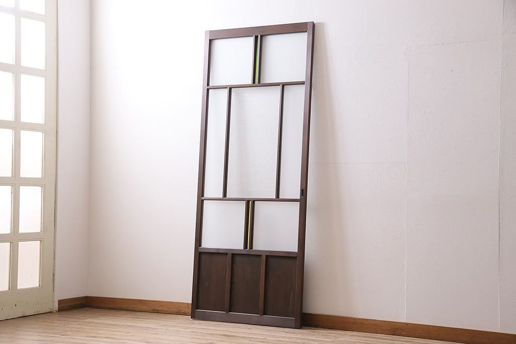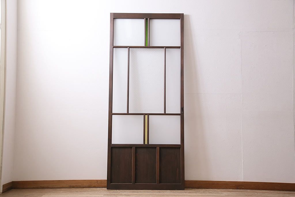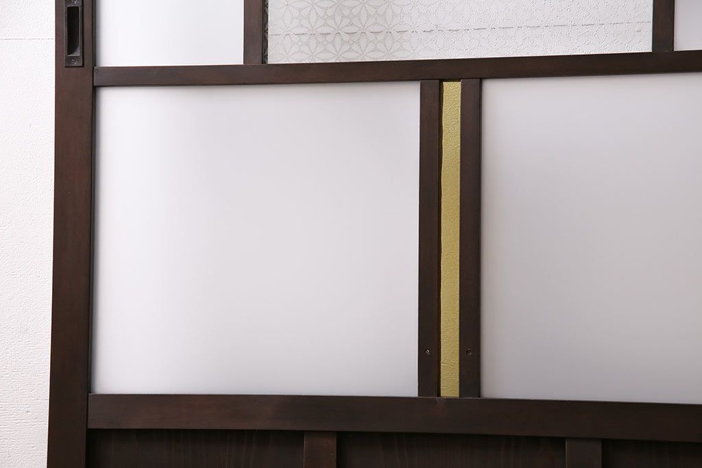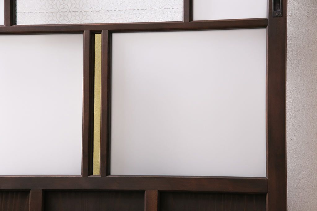 大正ロマンなガラス戸を新規製作!色ガラス、花菱模様ガラス、すりガラスを組み入れ。濃い茶色で着色し仕上げ。(引き戸、建具)