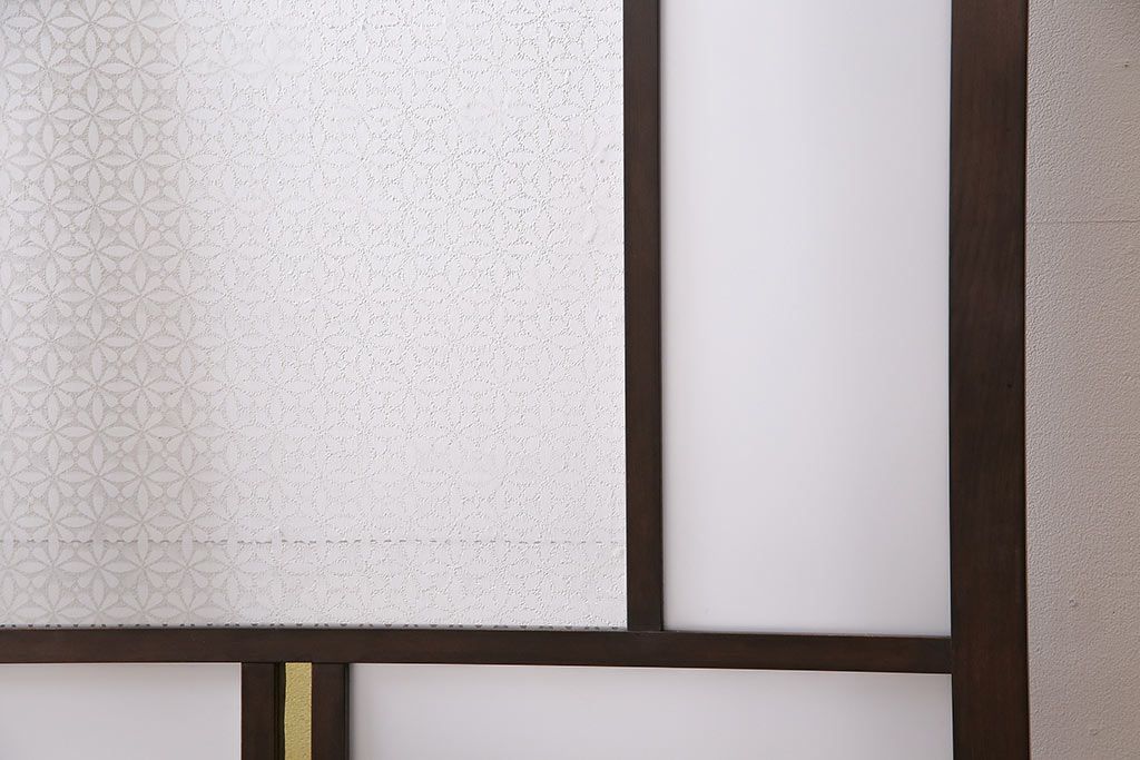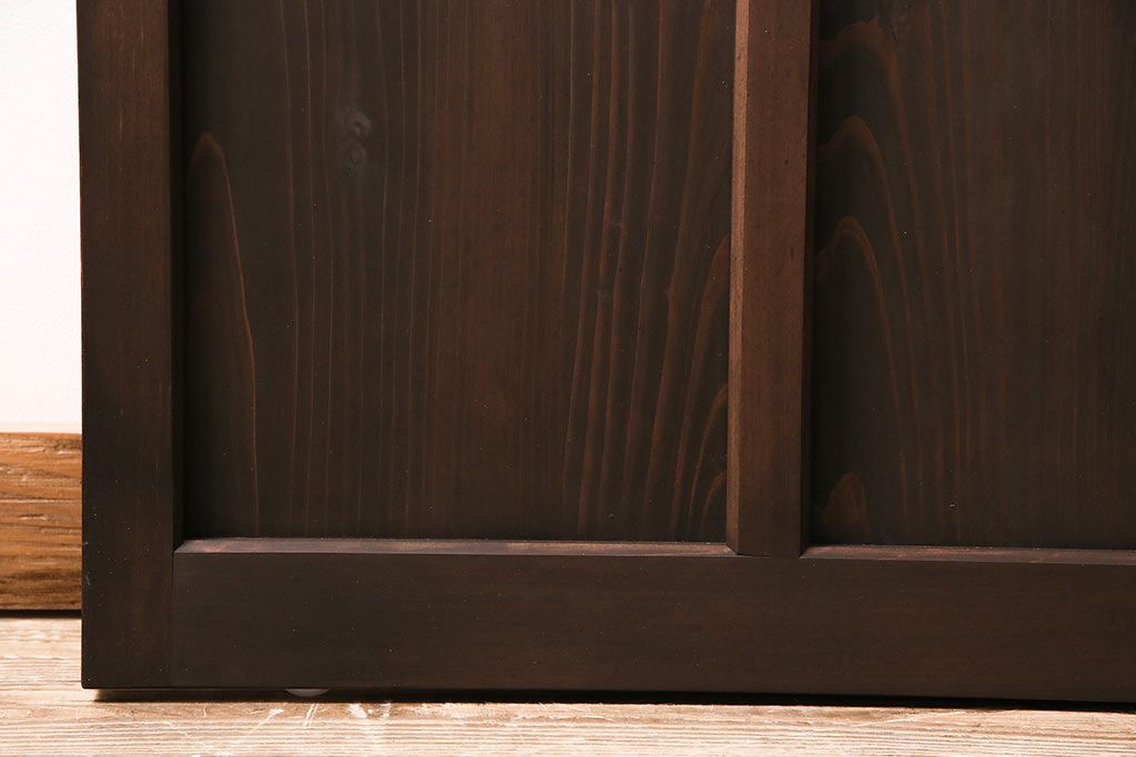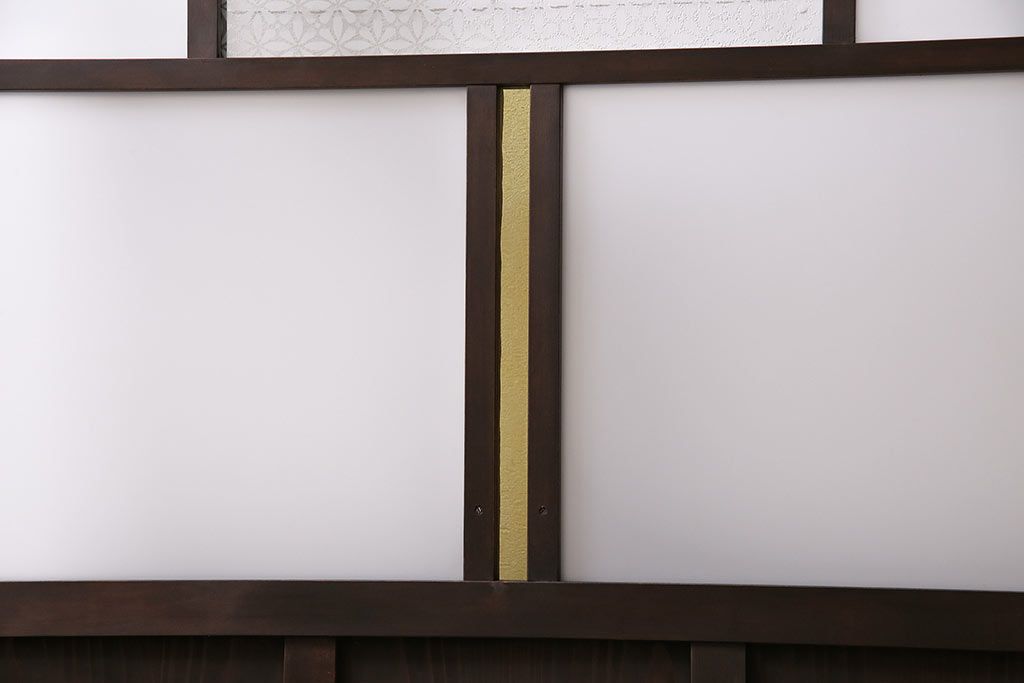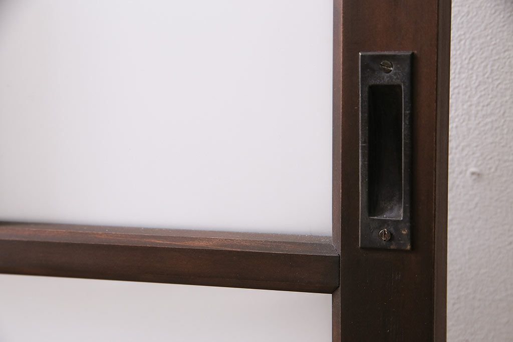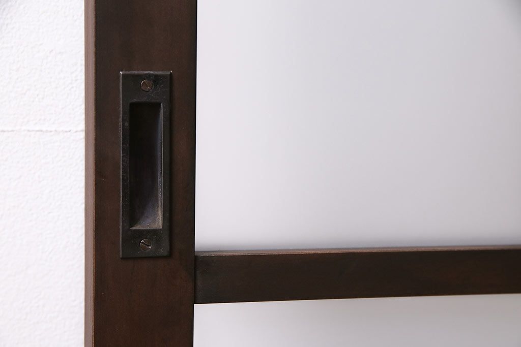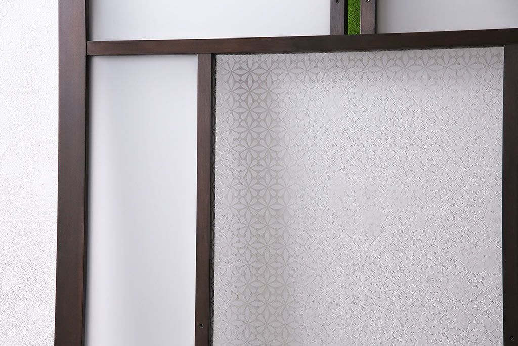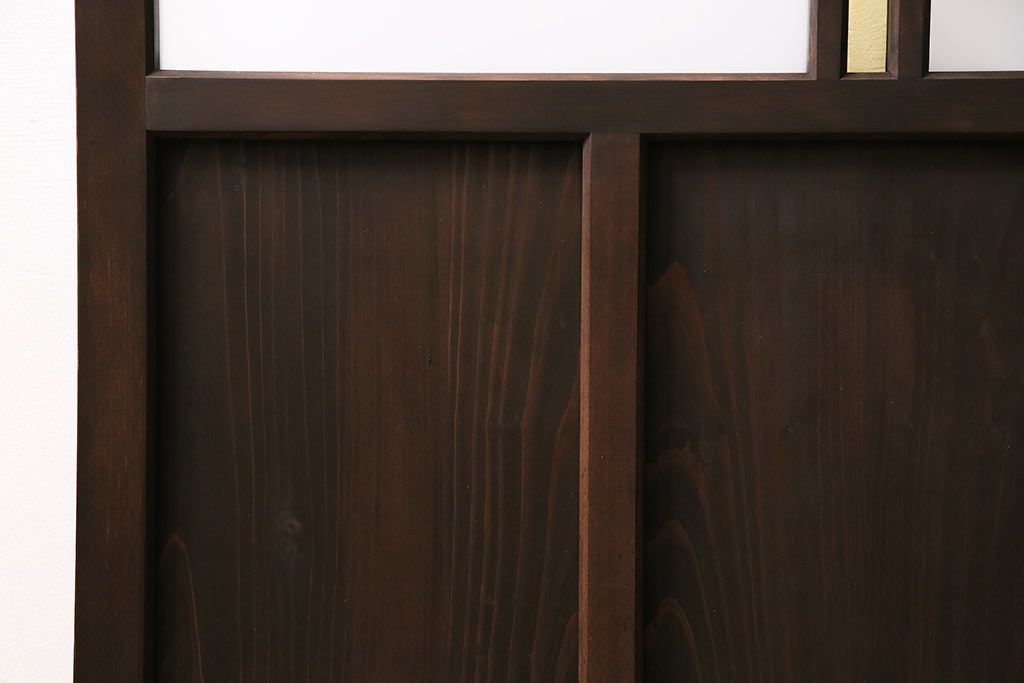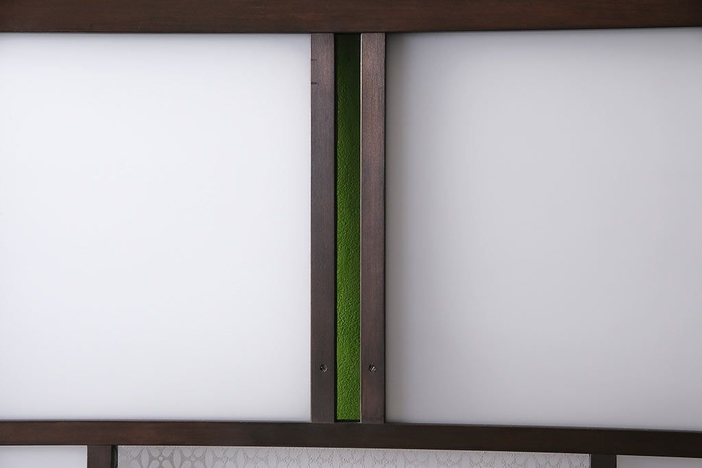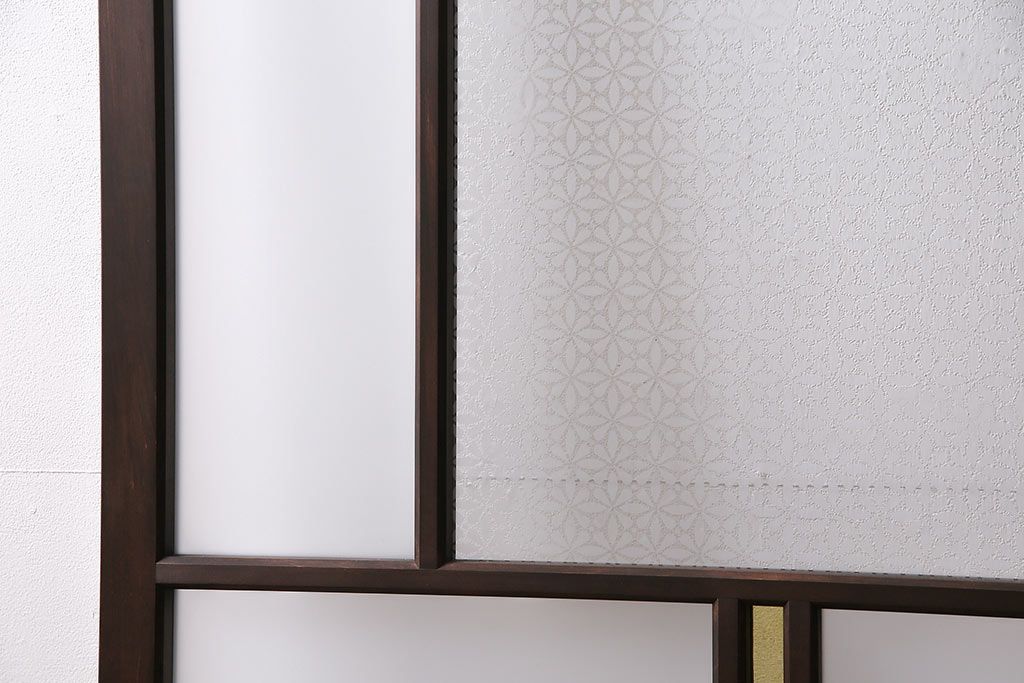 大正ロマンなガラス戸を新規製作!色ガラス、花菱模様ガラス、すりガラスを組み入れ。濃い茶色で着色し仕上げ。(引き戸、建具)