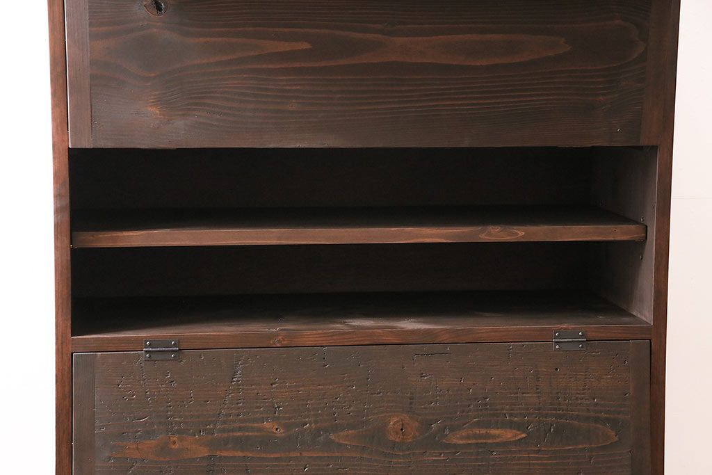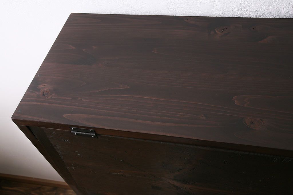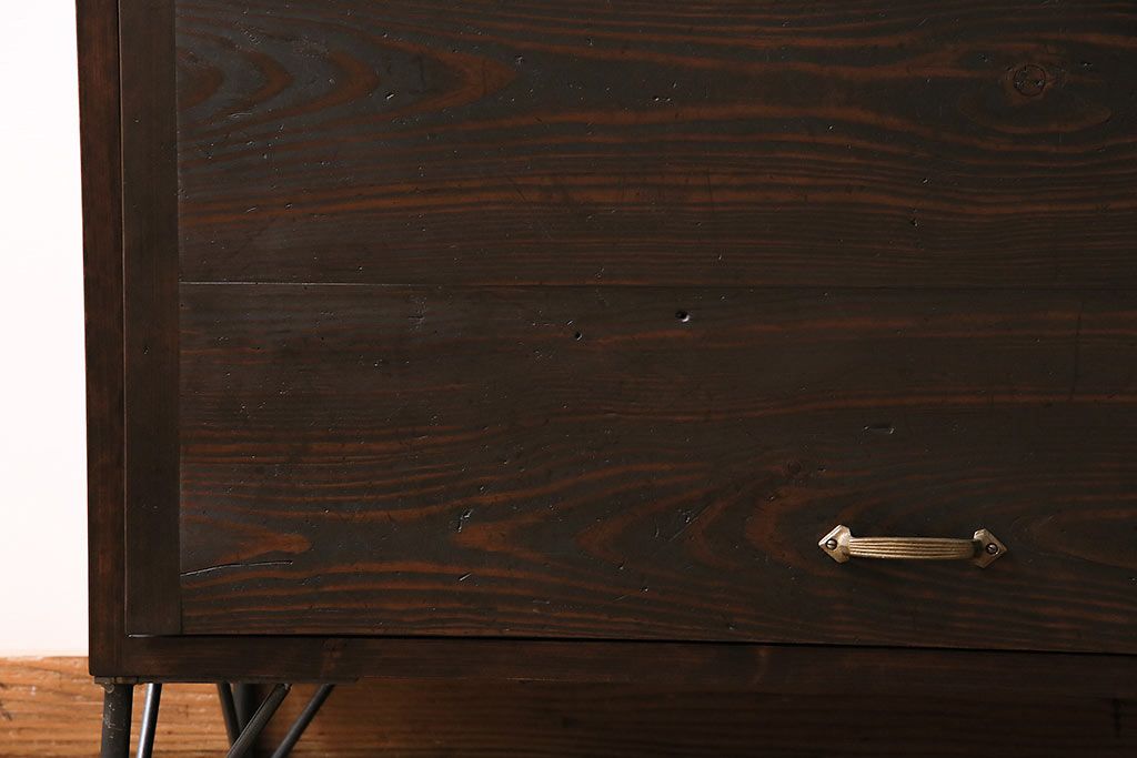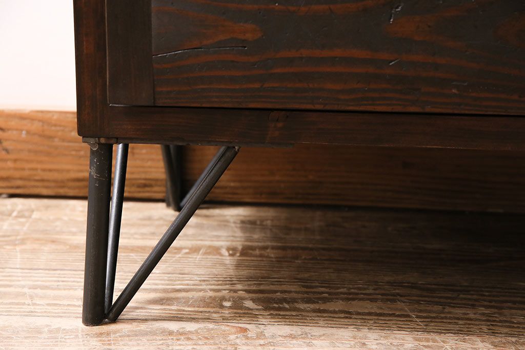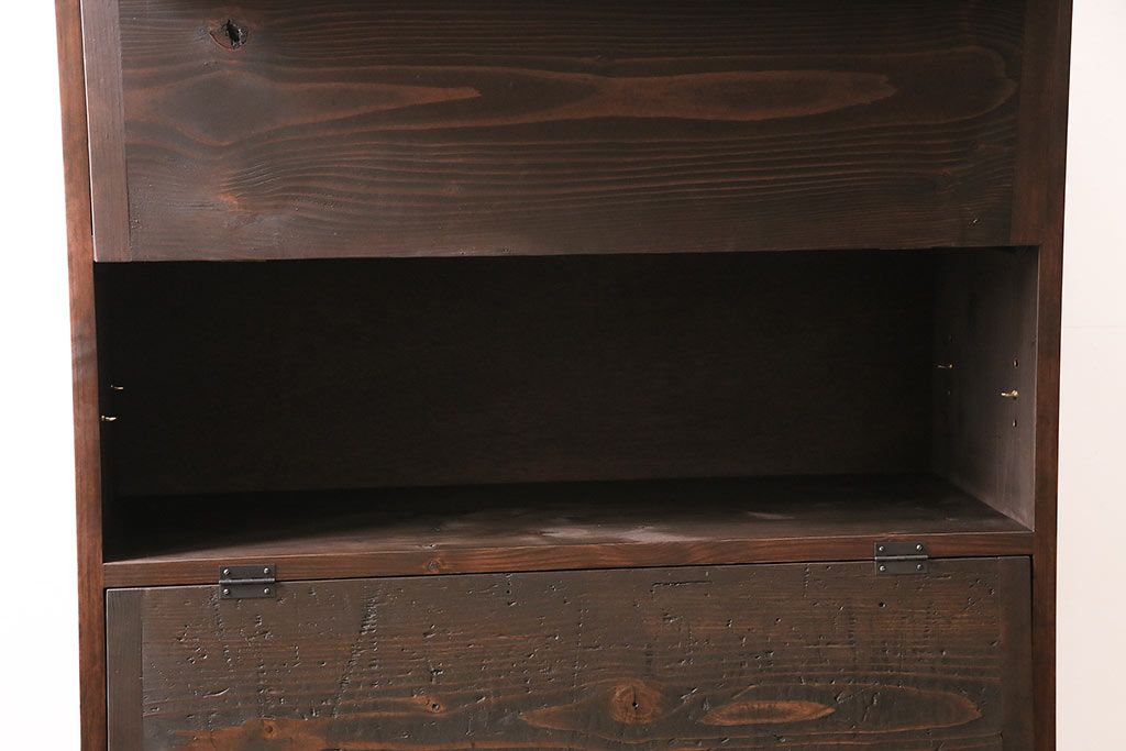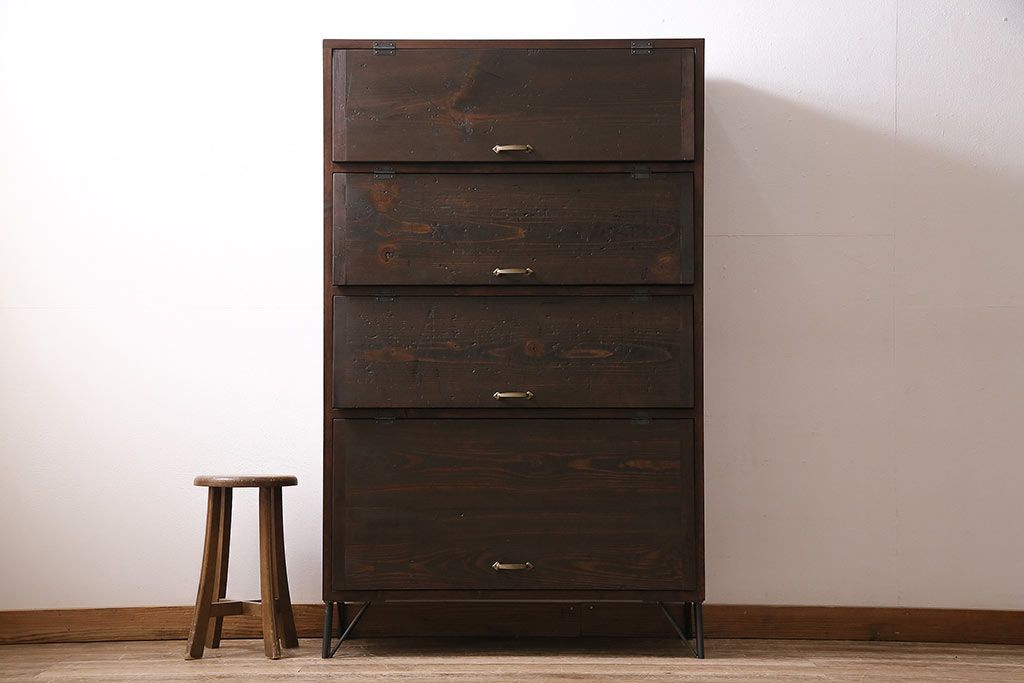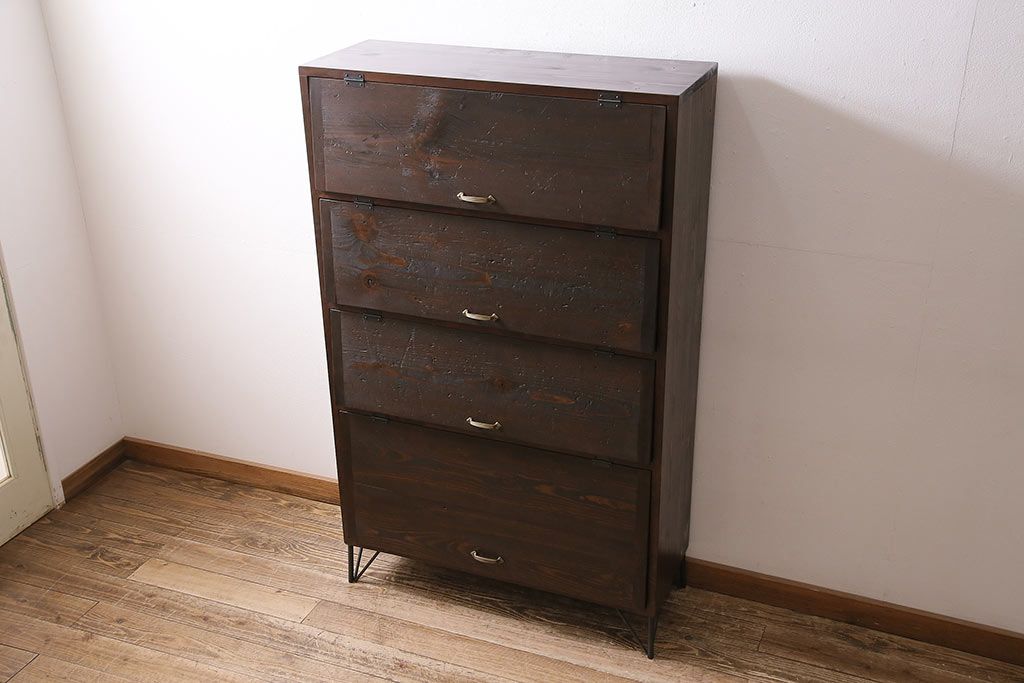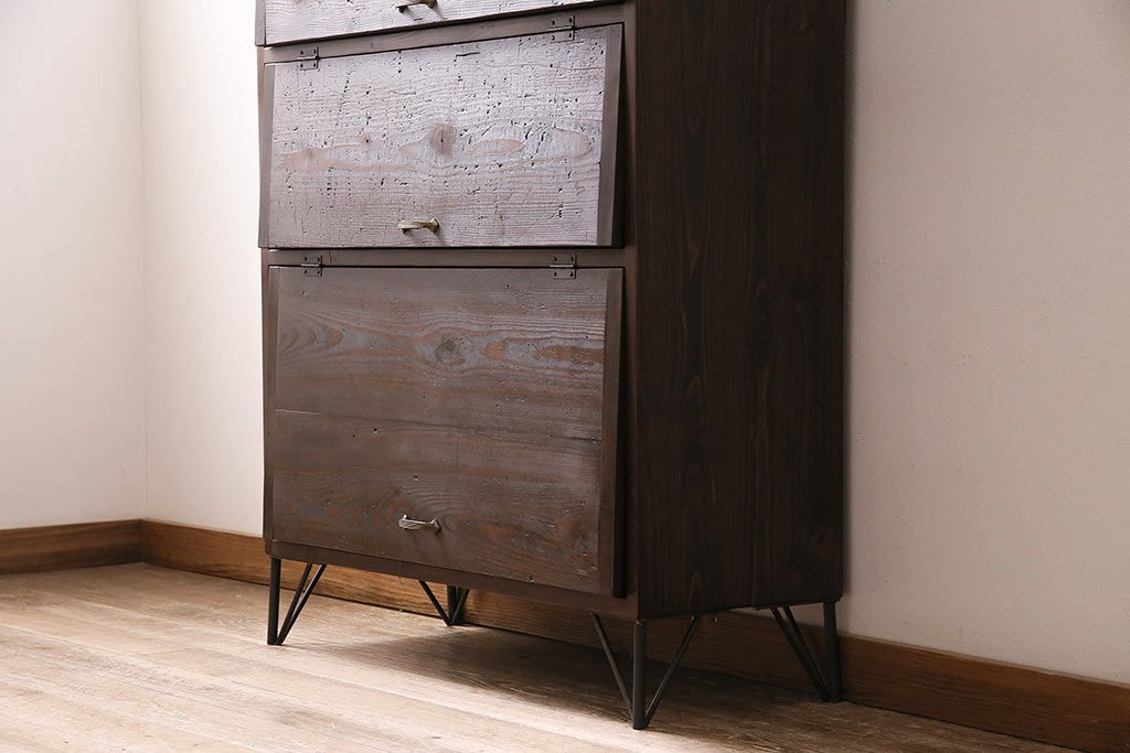 パタパタ扉の下駄箱を新規製作!本体はヒノキ無垢材、前板は古材を使用。鉄脚と取っ手を取り付け。(収納棚、戸棚、ロッカー)
