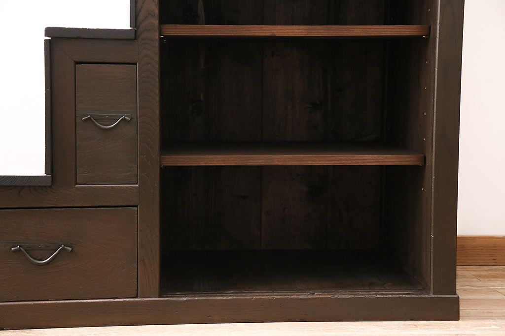 棚板は取り外しできます。下段のみ棚板は2枚あります。棚受けは8ヶ所、60mmピッチで調整できます。棚幅サイズのものが1枚の作りです。
