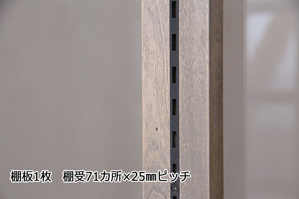 棚板は取り外しできます。棚板は1枚あります。棚受けは71ヶ所、25mmピッチで調整できます。棚幅サイズのものが1枚の作りです。