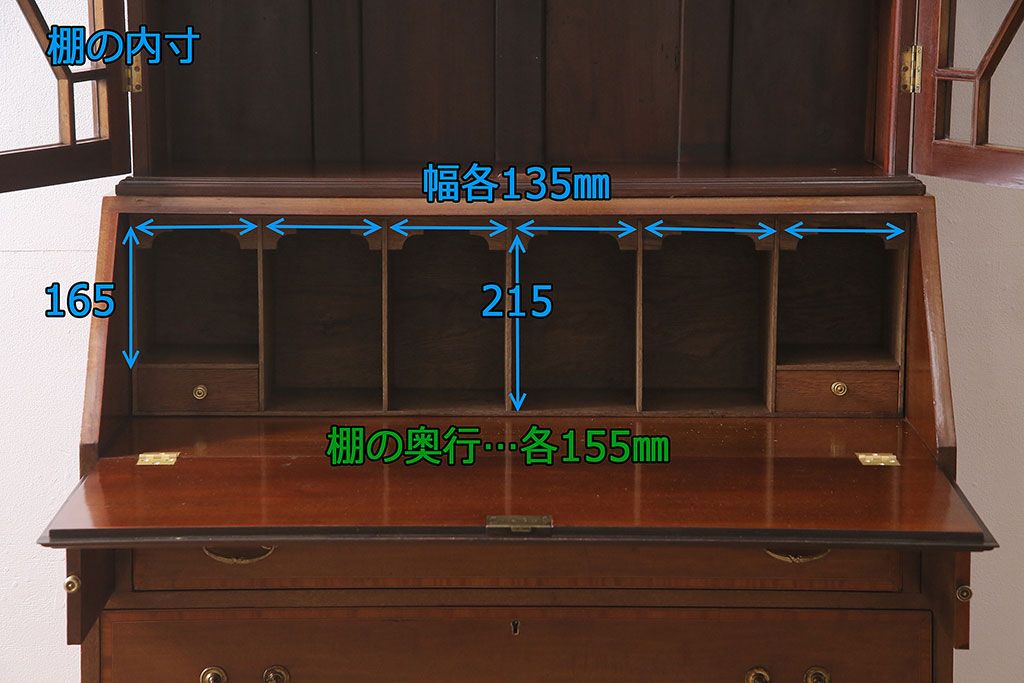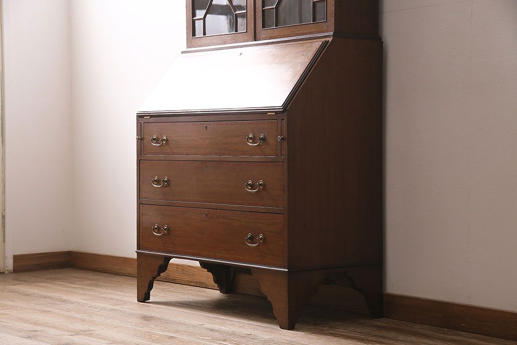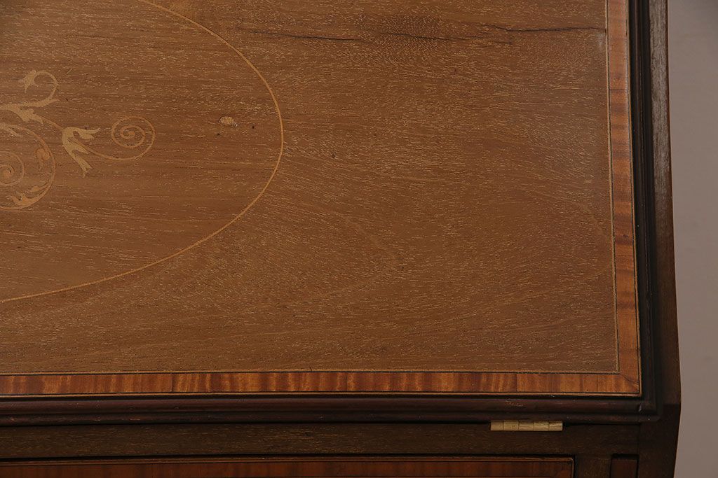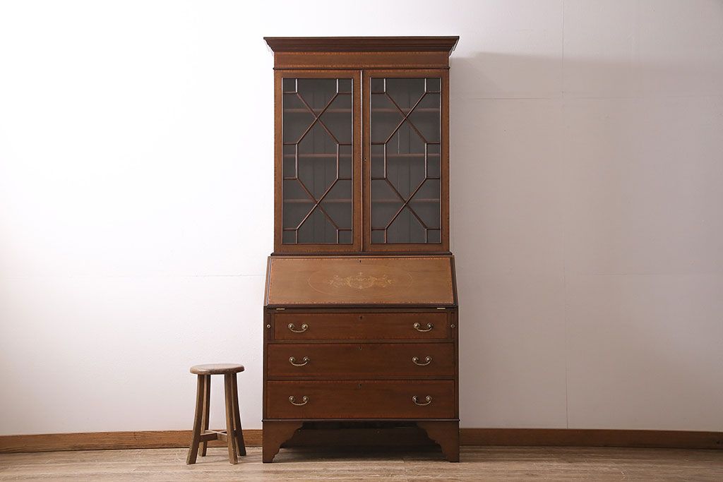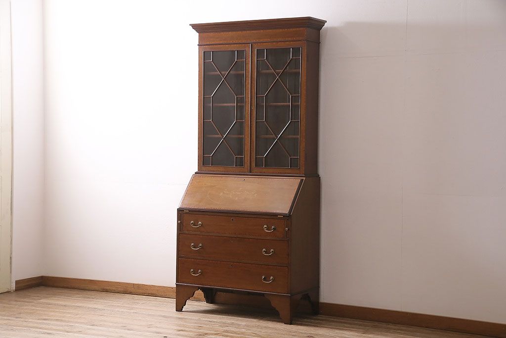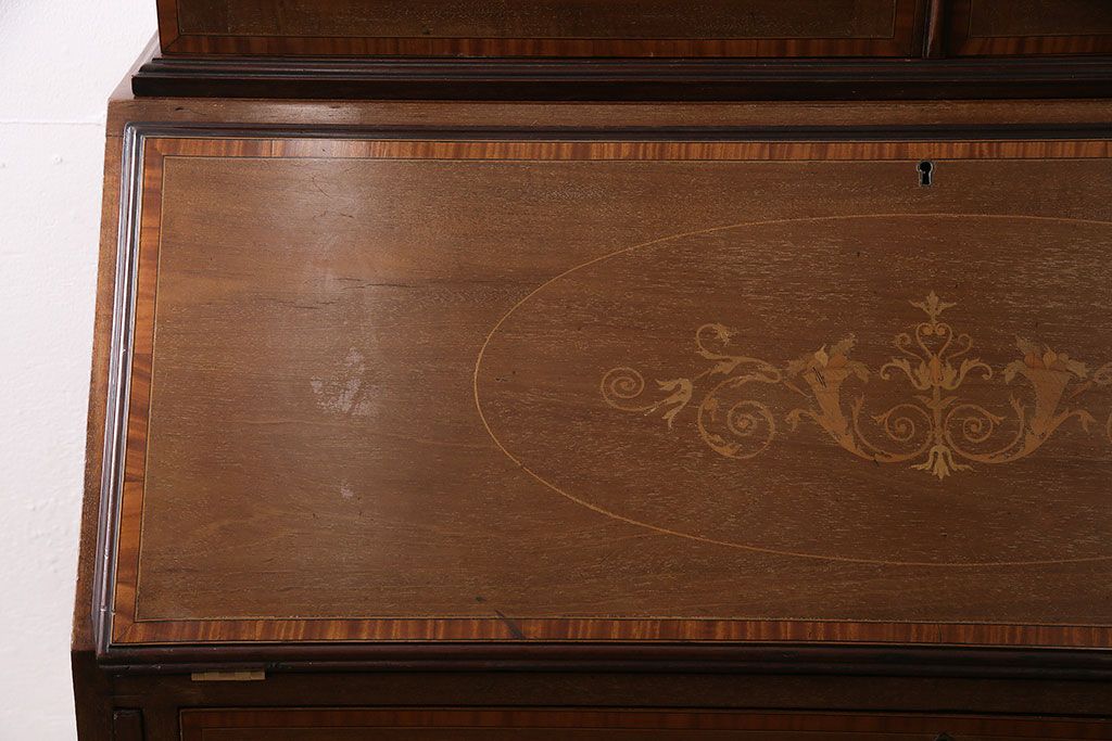 アンティーク家具 イギリスアンティーク マホガニー材 象嵌細工入りの上品なライティングビューロー(ビューローブックケース、簿記机、在宅ワーク、在宅用収納棚、本箱、ワークデスク)(R-046948)
