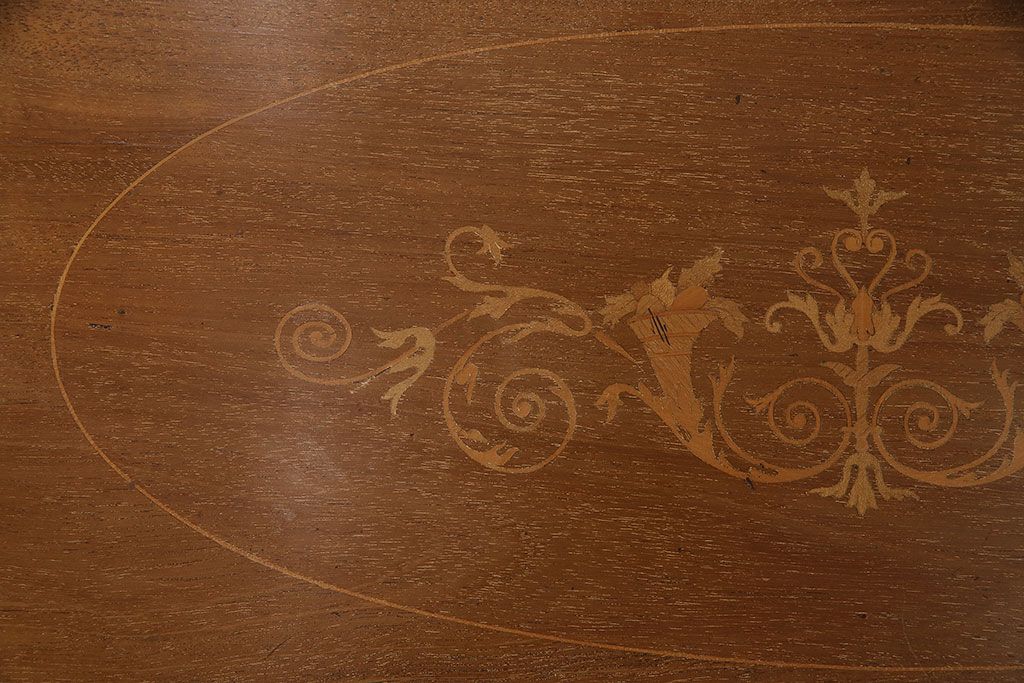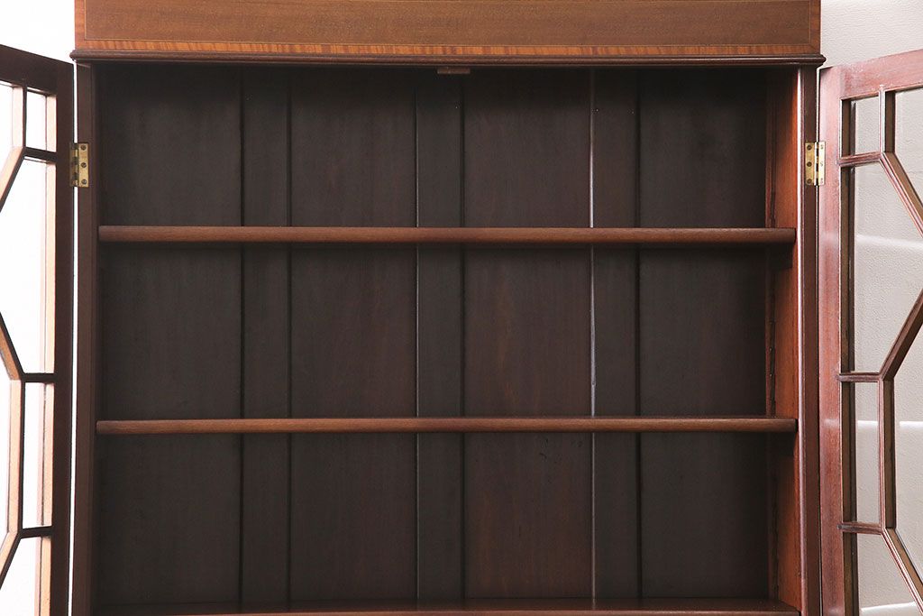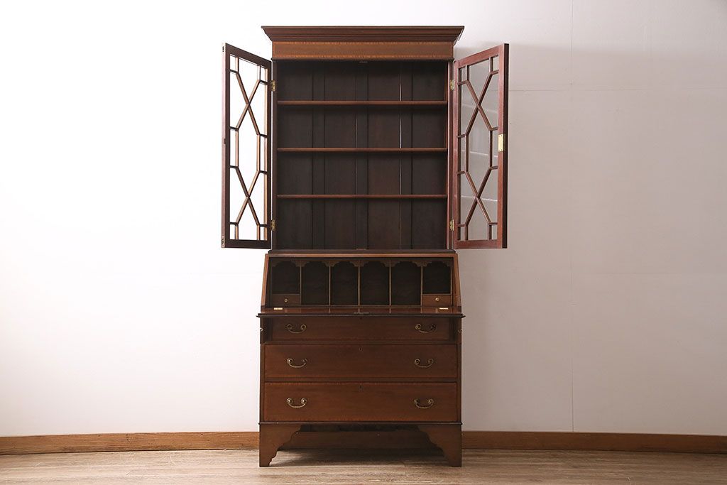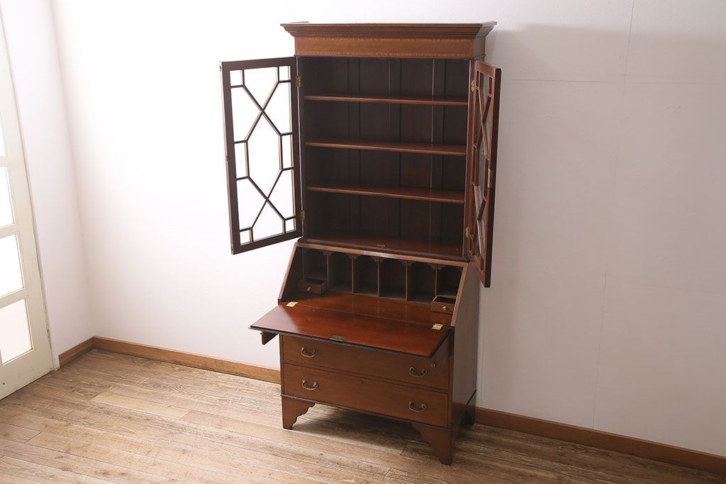 ラフジュ工房> キャビネット・戸棚> 本箱 > アンティーク家具 イギリスアンティーク マホガニー材 象嵌細工入りの上品なライティングビューロー(ビューローブックケース、簿記机、在宅ワーク、在宅用収納棚、本箱、ワークデスク)(R-046948)