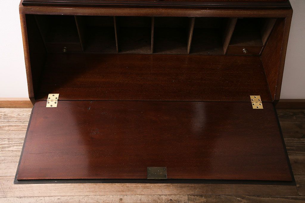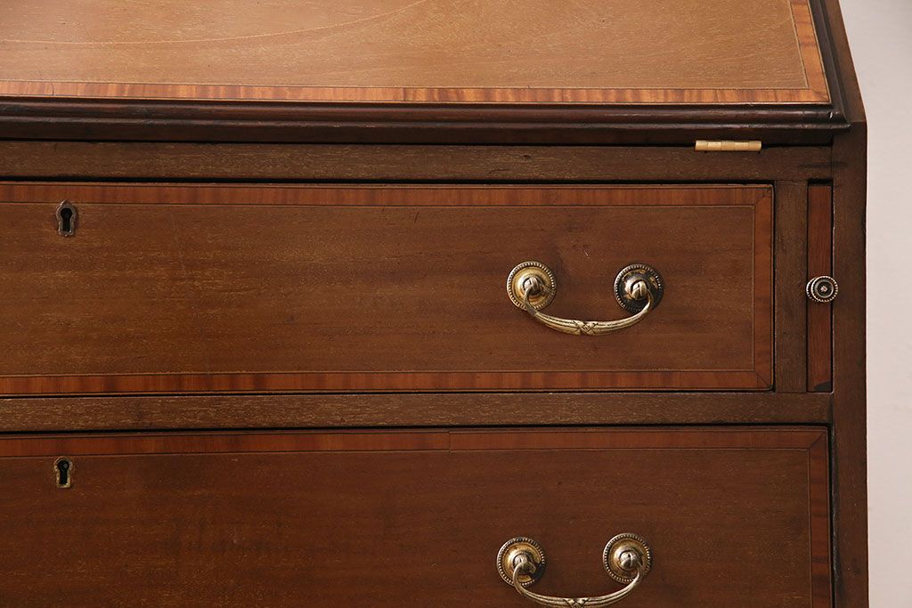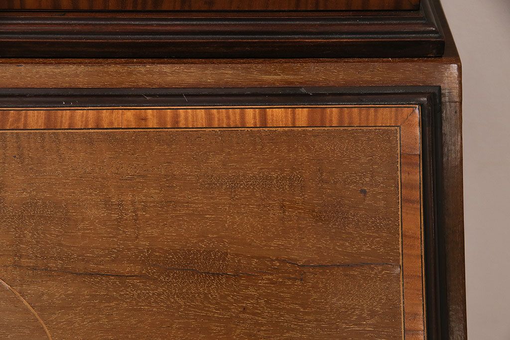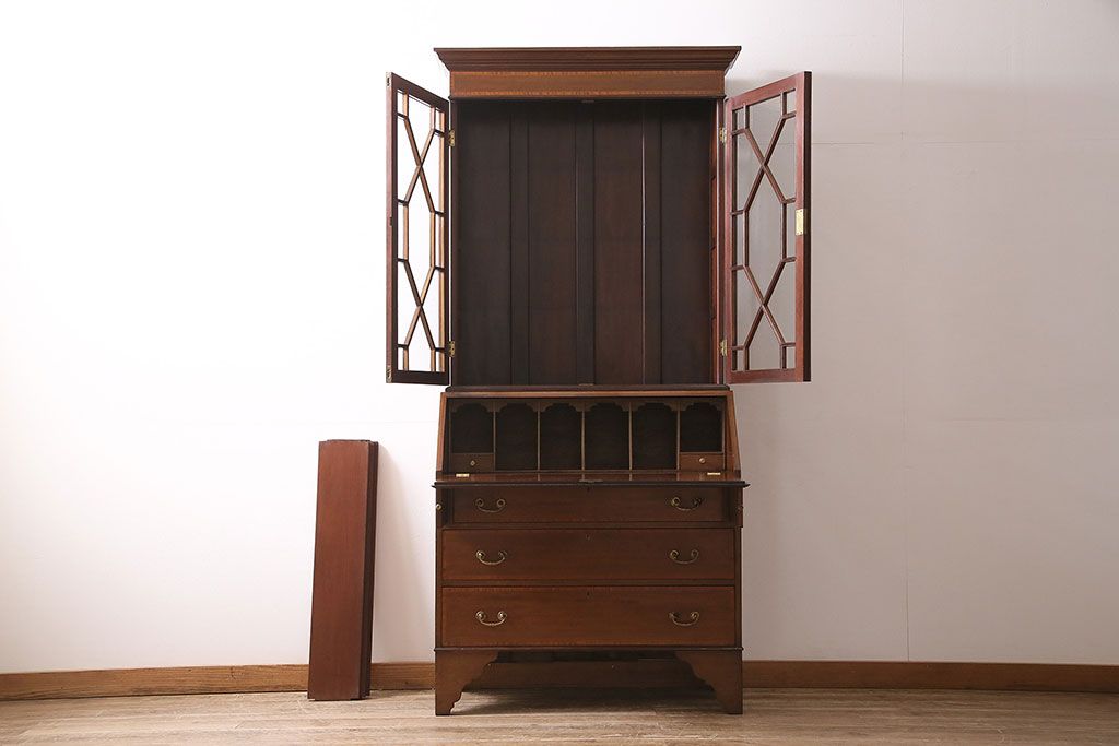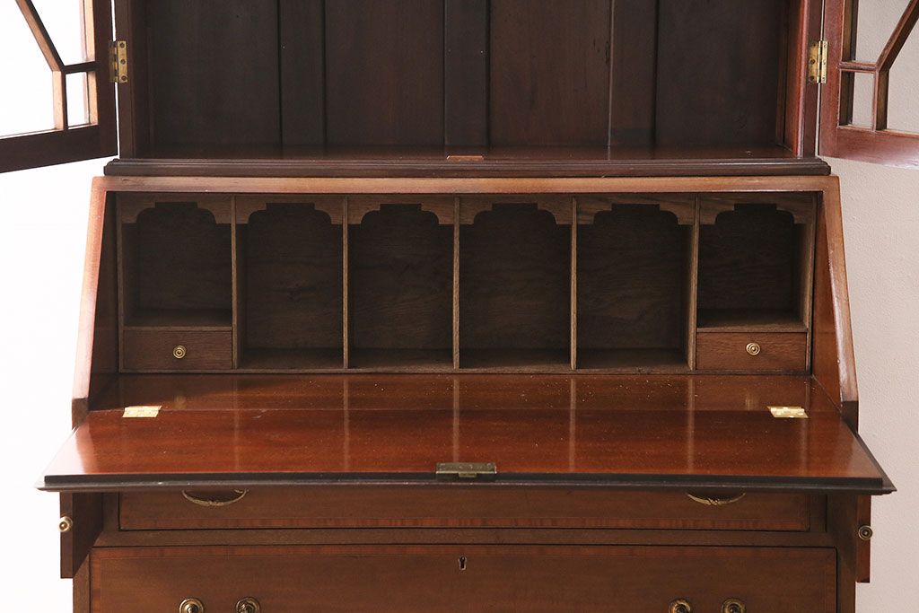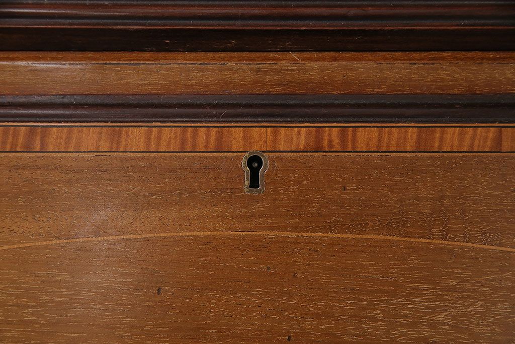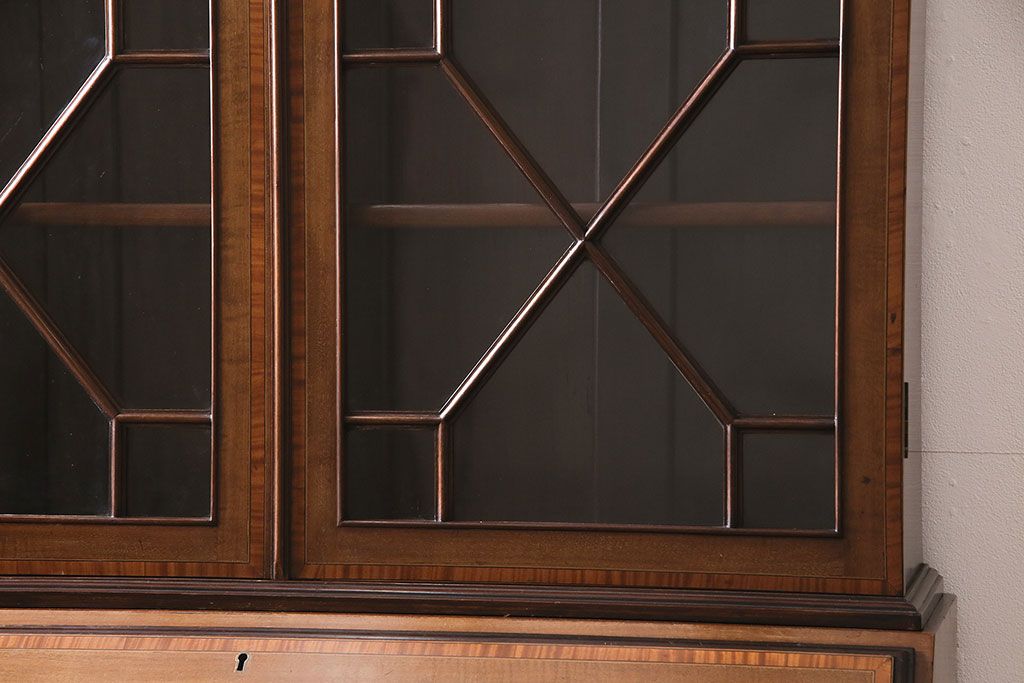 ラフジュ工房> デスク> ライティングビューロー・簿記机 > アンティーク家具 イギリスアンティーク マホガニー材 象嵌細工入りの上品なライティングビューロー(ビューローブックケース、簿記机、在宅ワーク、在宅用収納棚、本箱、ワークデスク)(R-046948)