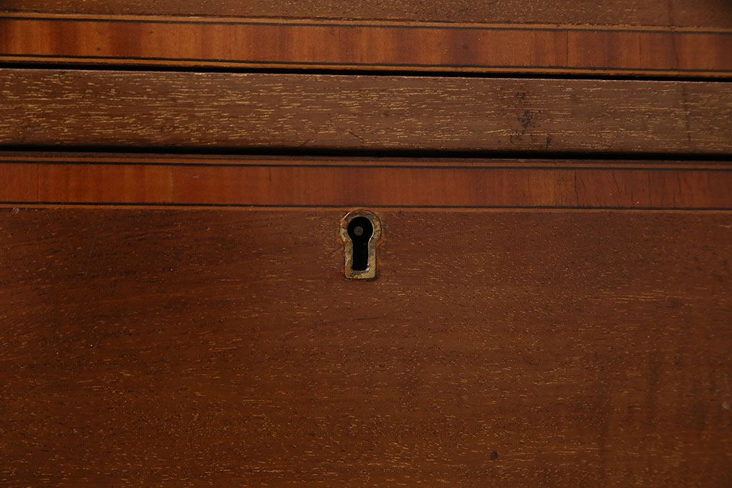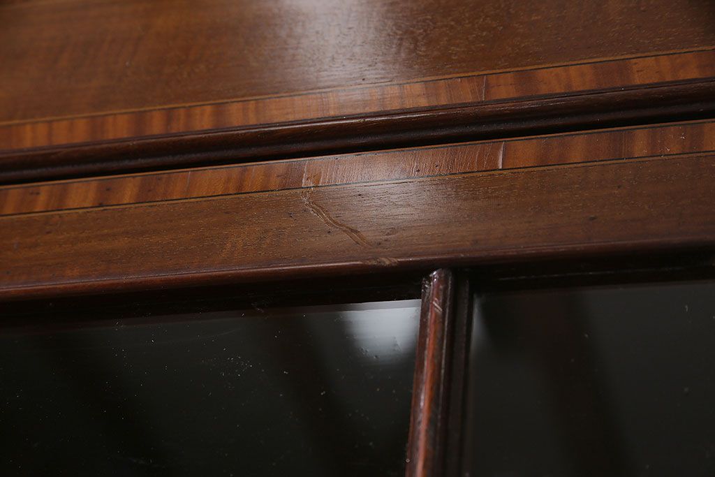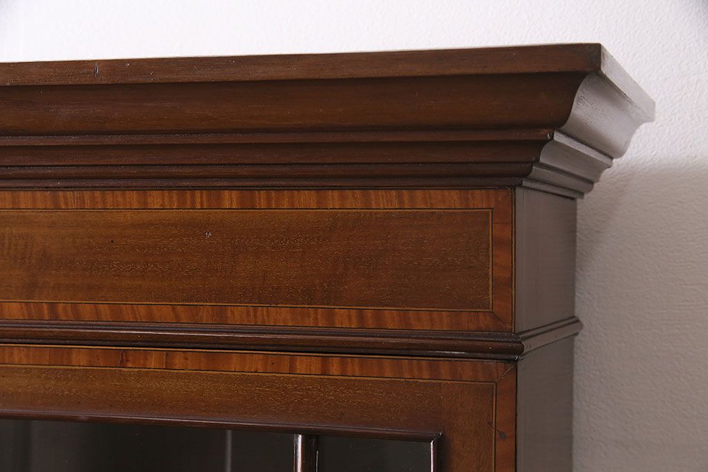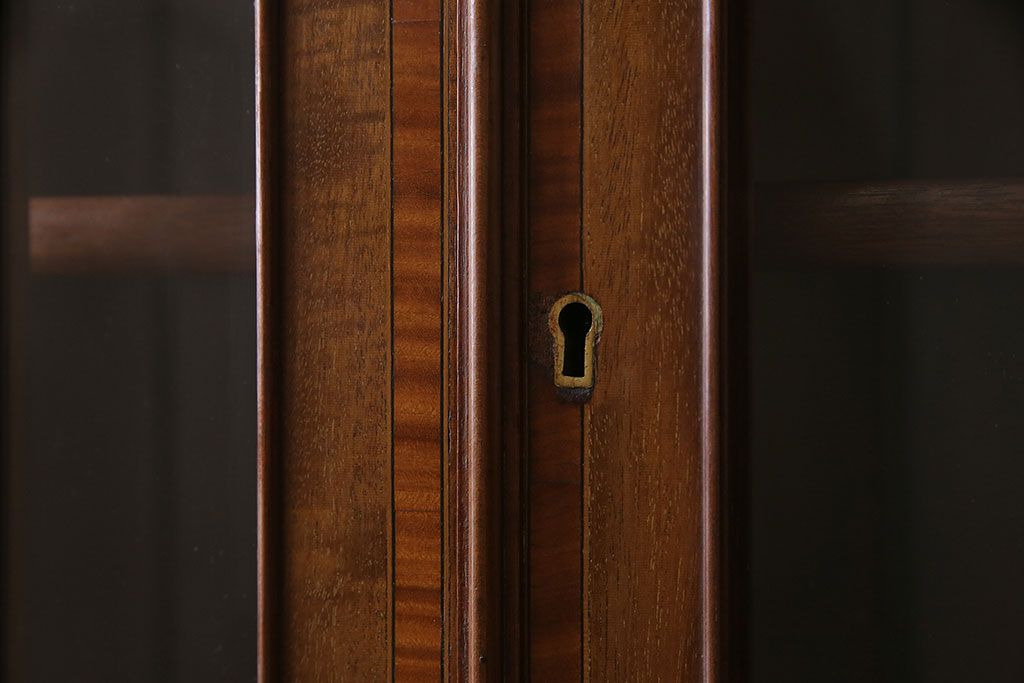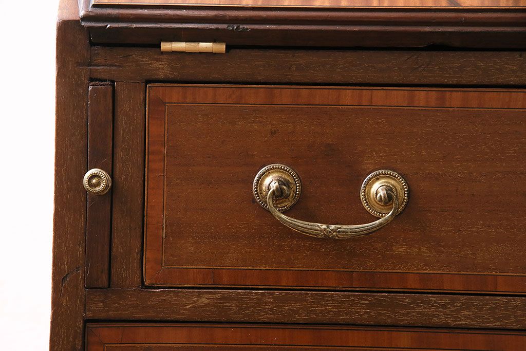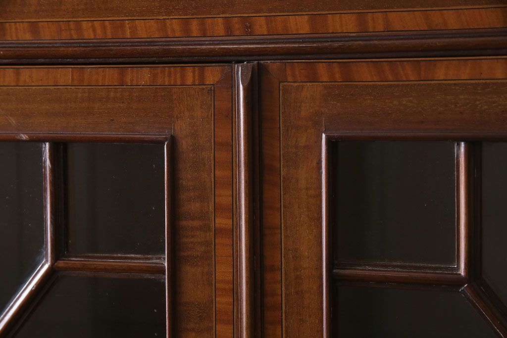 ラフジュ工房> デスク> ライティングビューロー・簿記机 > アンティーク家具 イギリスアンティーク マホガニー材 象嵌細工入りの上品なライティングビューロー(ビューローブックケース、簿記机、在宅ワーク、在宅用収納棚、本箱、ワークデスク)(R-046948)