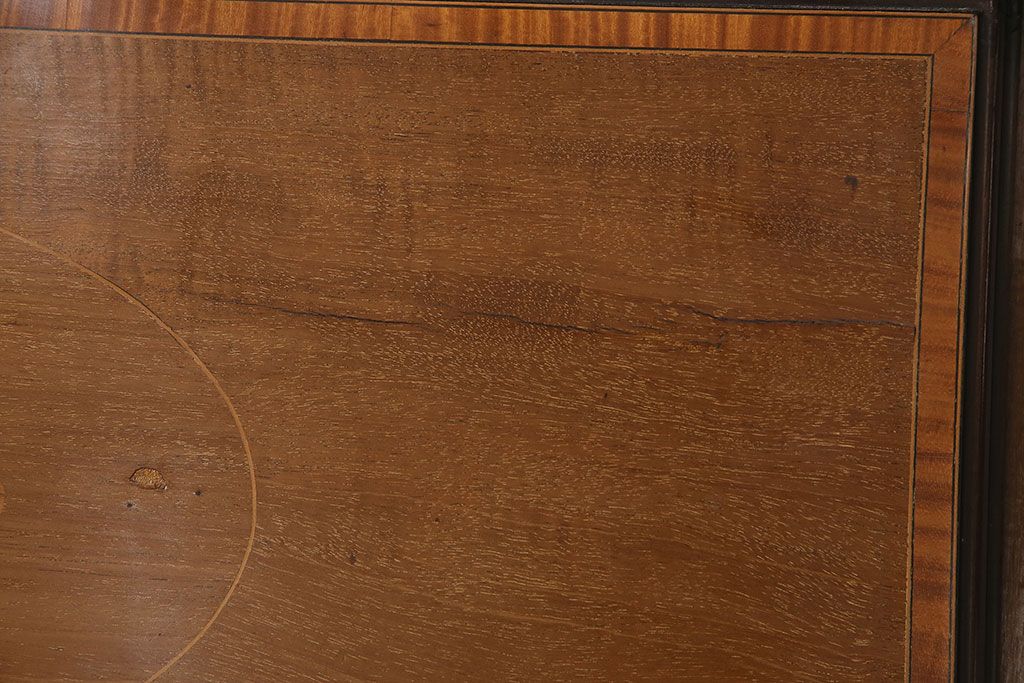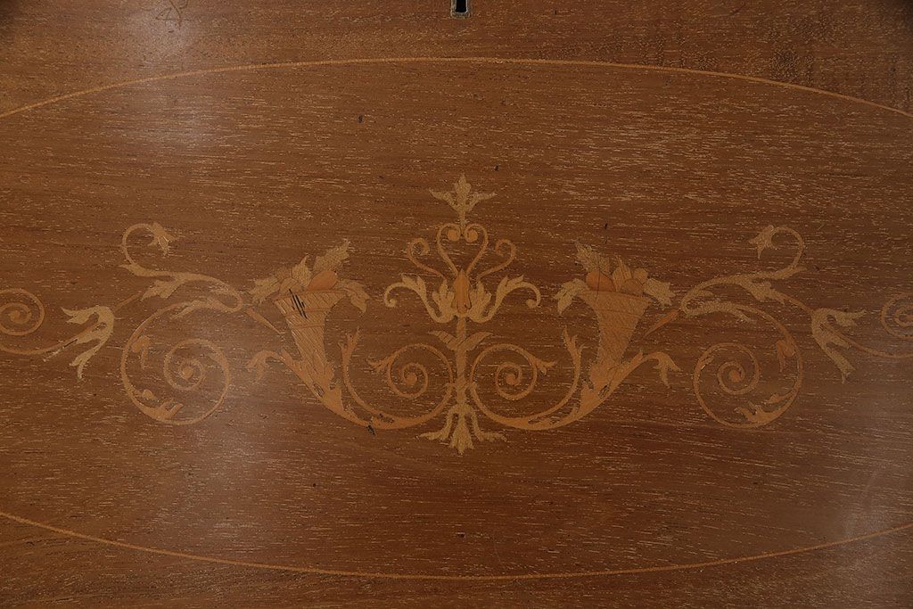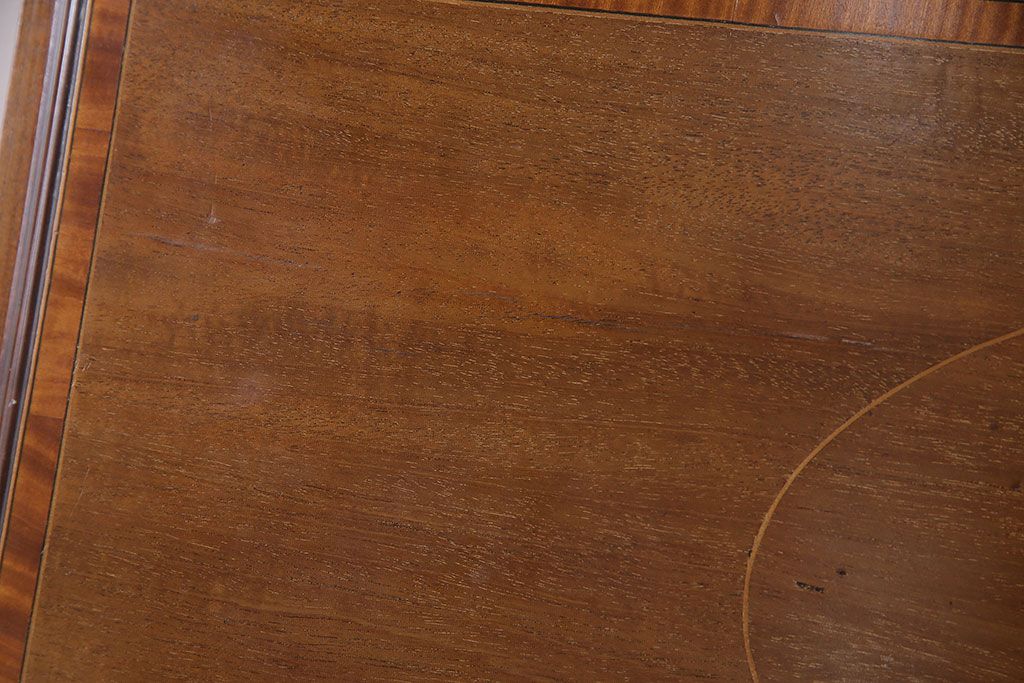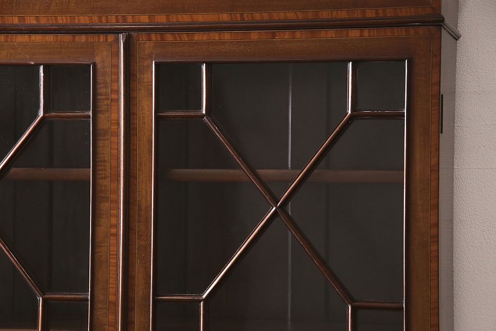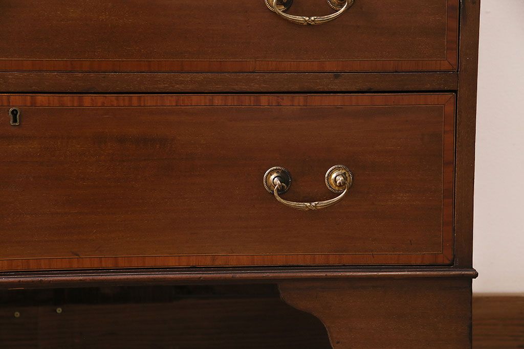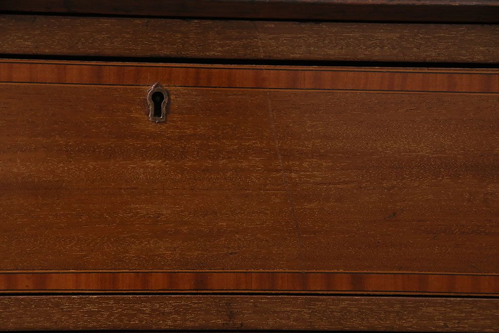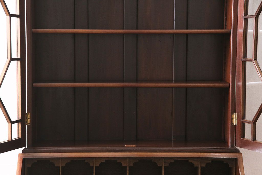 ラフジュ工房> デスク> ライティングビューロー・簿記机 > アンティーク家具 イギリスアンティーク マホガニー材 象嵌細工入りの上品なライティングビューロー(ビューローブックケース、簿記机、在宅ワーク、在宅用収納棚、本箱、ワークデスク)(R-046948)