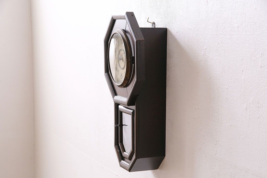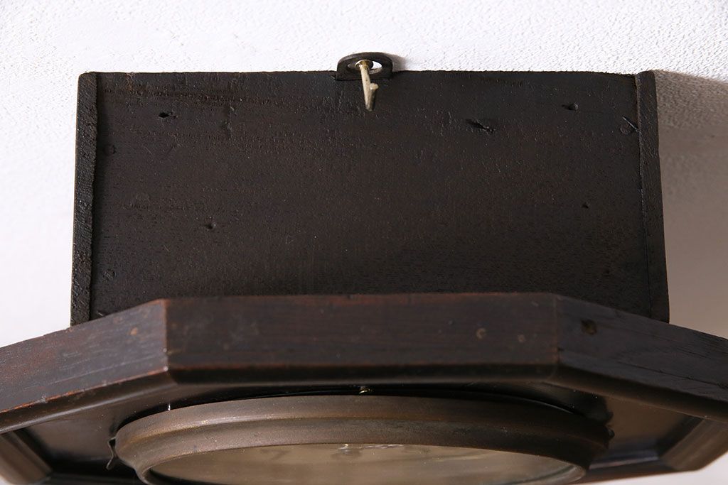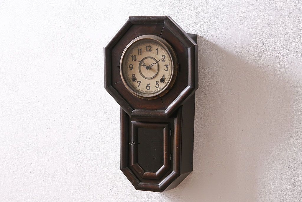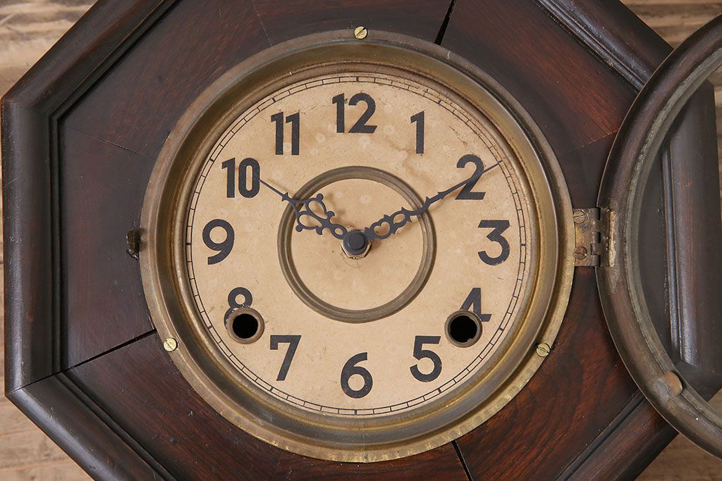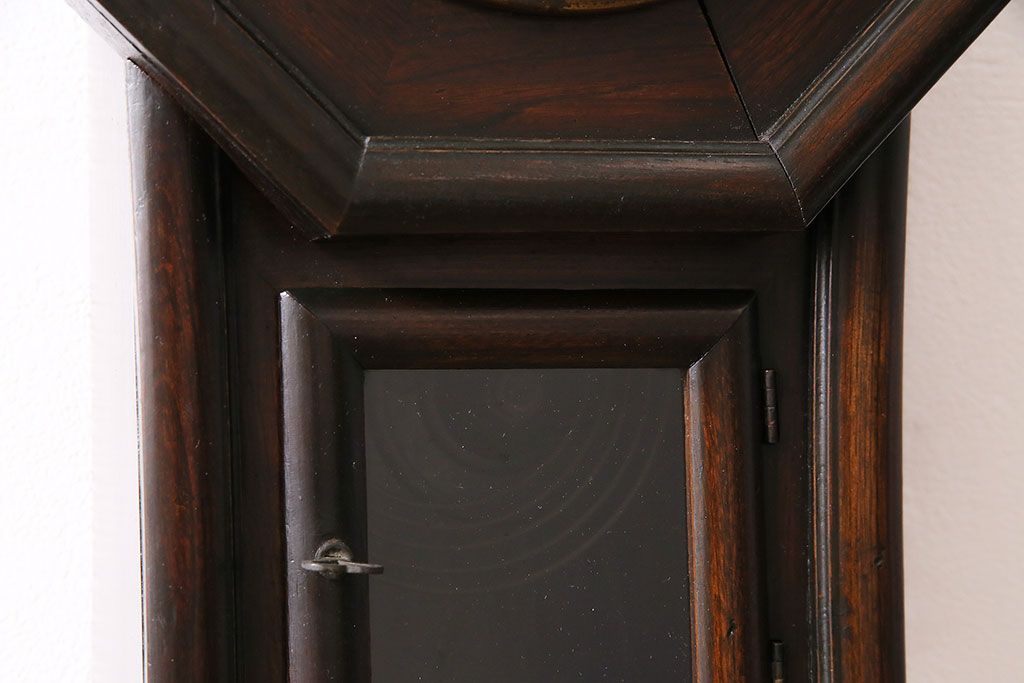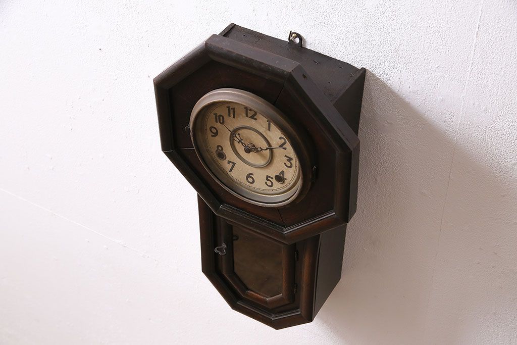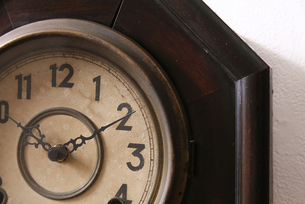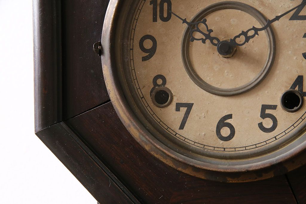 時計> 掛け時計 > アンティーク時計 愛知県時計製造共同組合(AICHIKEN CLOCK-MAKERS' UNION'S MARK) 電池式 年月を重ねた趣溢れる八角型柱時計(掛け時計、古時計)(R-047033)