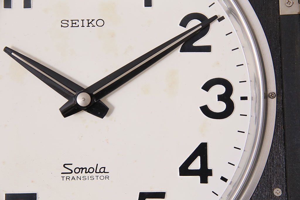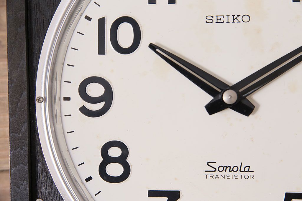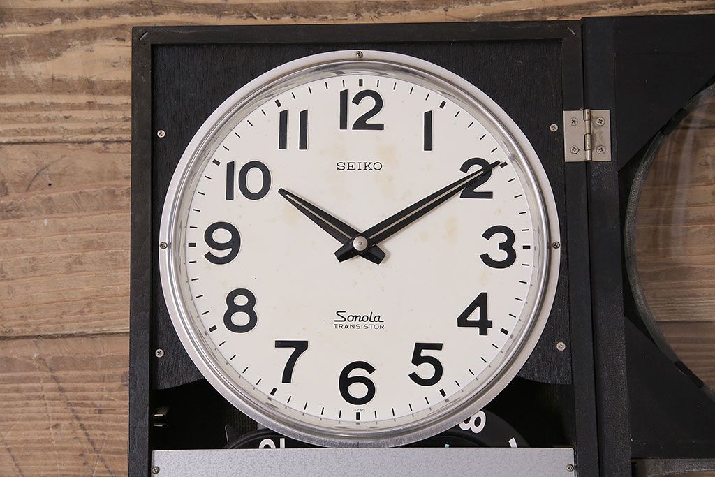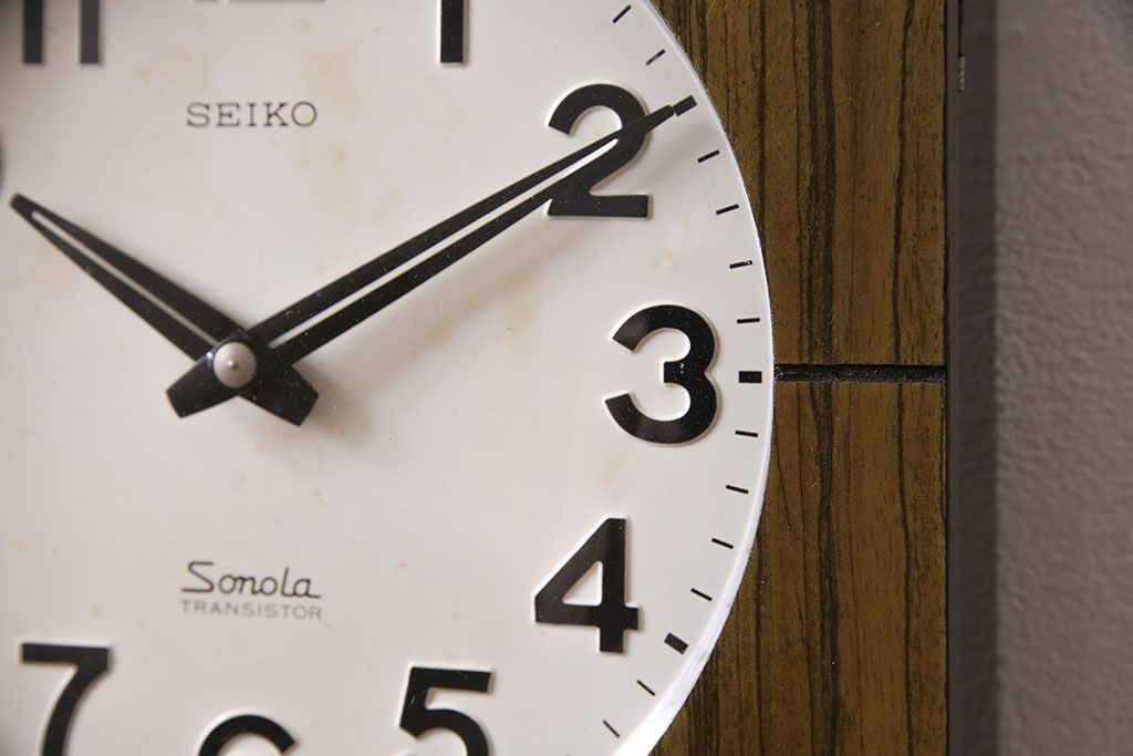 アンティーク時計 昭和レトロ SEIKO Sonola(セイコー・ソノーラ) 電池式 カレンダー付き レトロな雰囲気漂う掛け時計(トランジスタ時計、柱時計)(R-047034)です。