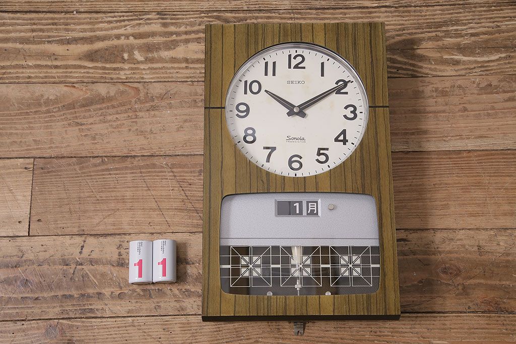 時計> 掛け時計 > アンティーク時計 昭和レトロ SEIKO Sonola(セイコー・ソノーラ) 電池式 カレンダー付き レトロな雰囲気漂う掛け時計(トランジスタ時計、柱時計)(R-047034)