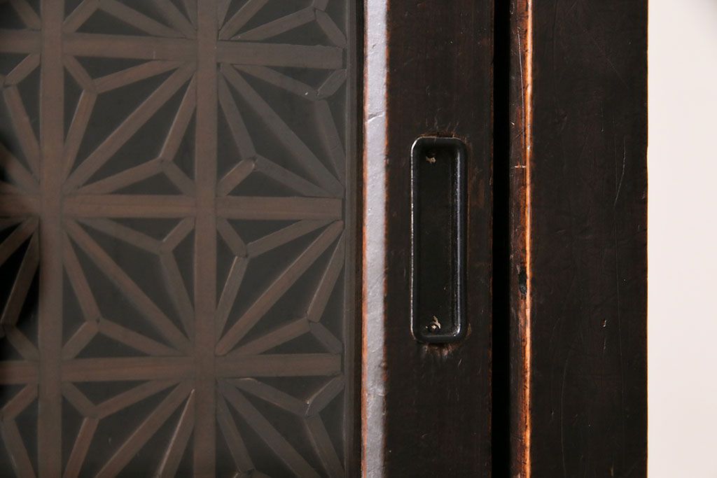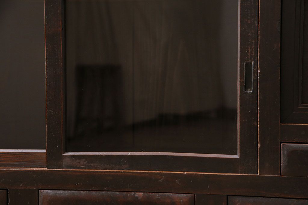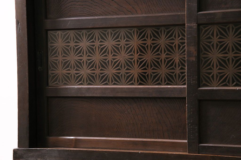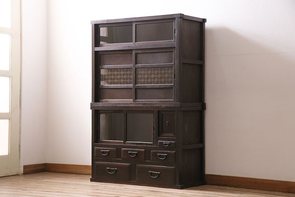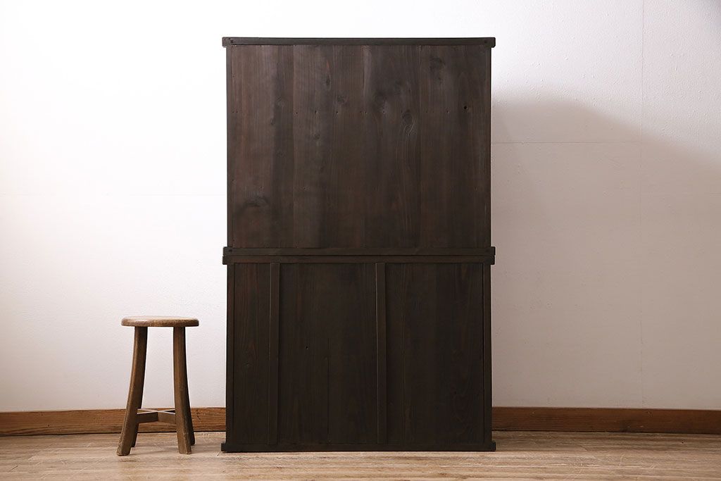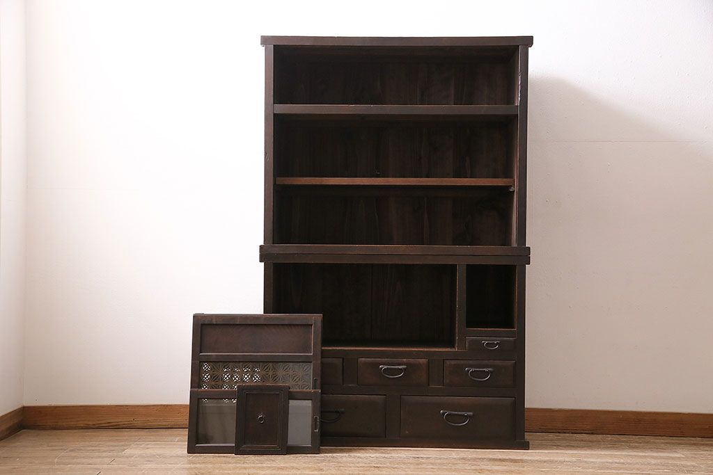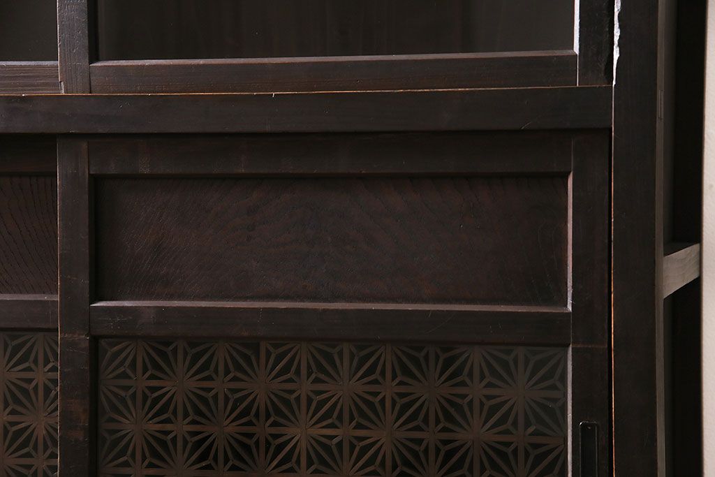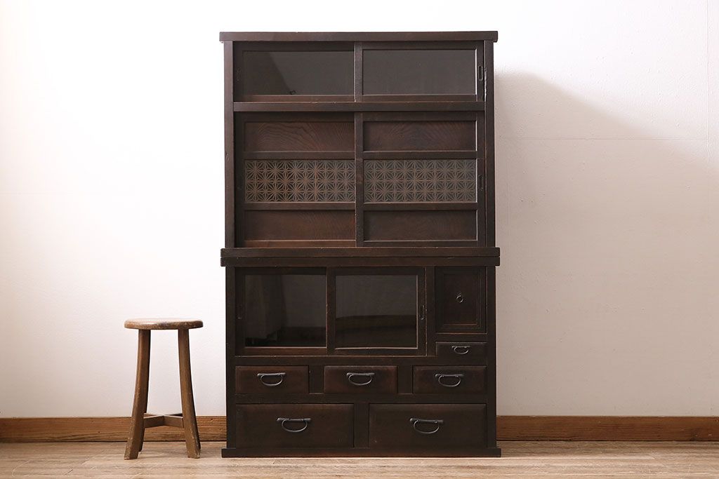和製アンティーク 前面ヒノキ材・ケヤキ材 組子ガラスが目を引く渋い風合いの重ね戸棚(食器棚、収納棚)(R-047036)
