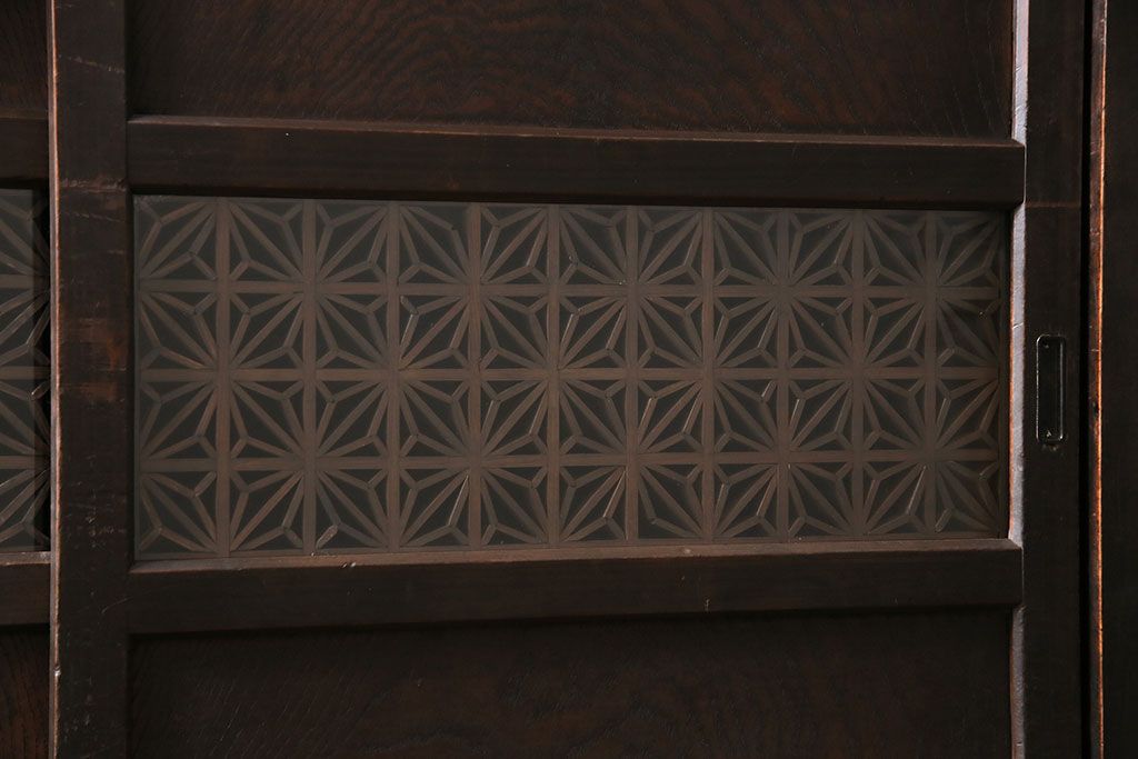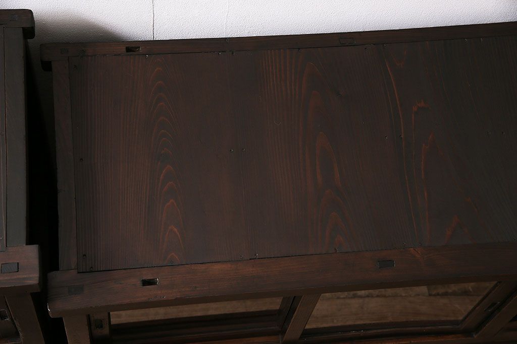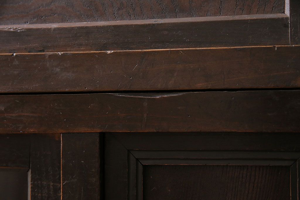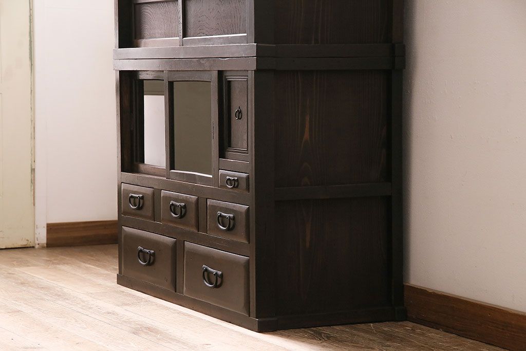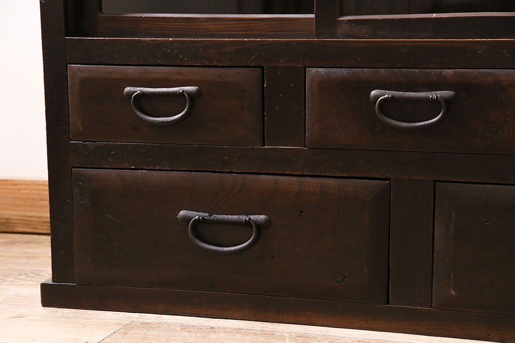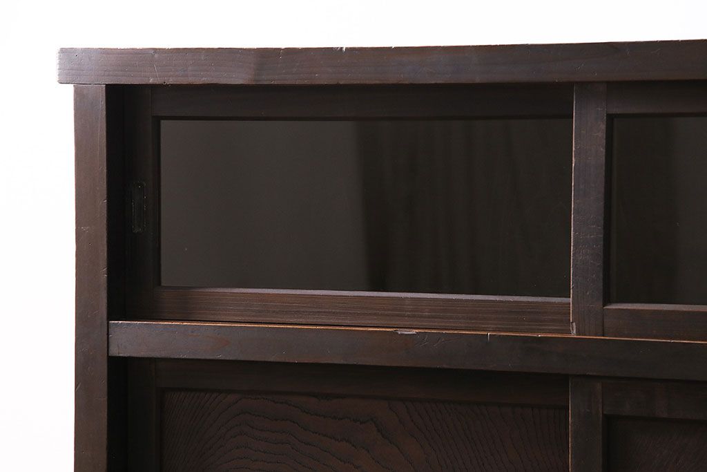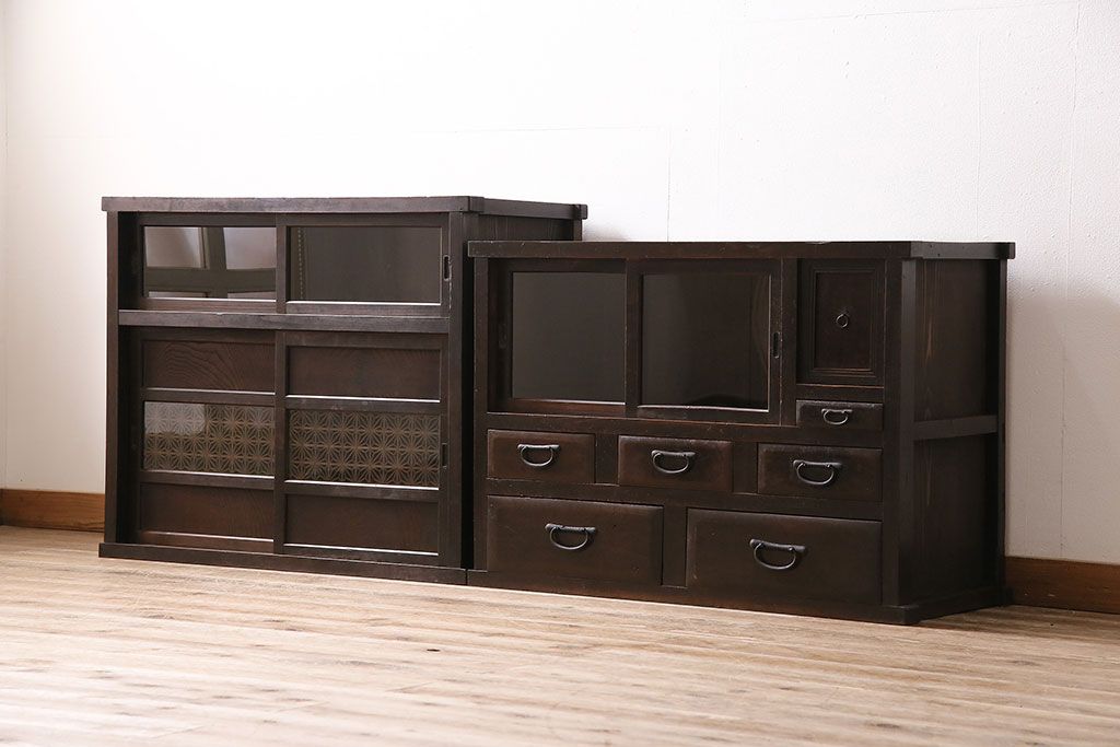 和製アンティーク 前面ヒノキ材・ケヤキ材 組子ガラスが目を引く渋い風合いの重ね戸棚(食器棚、収納棚)(R-047036)