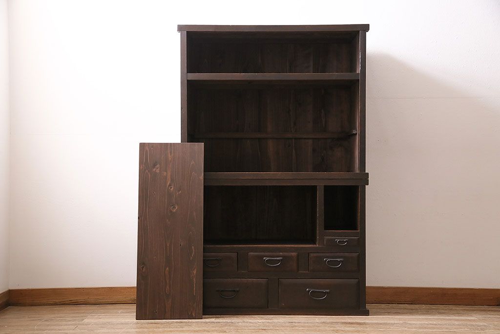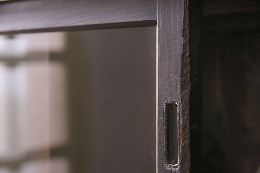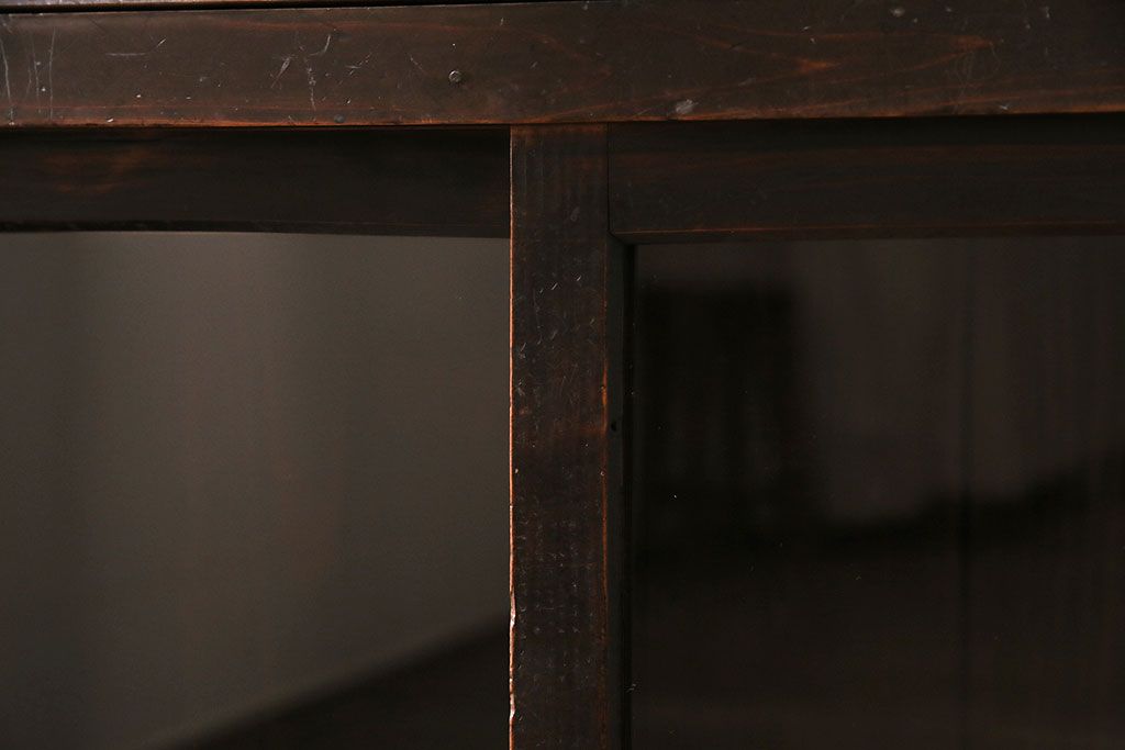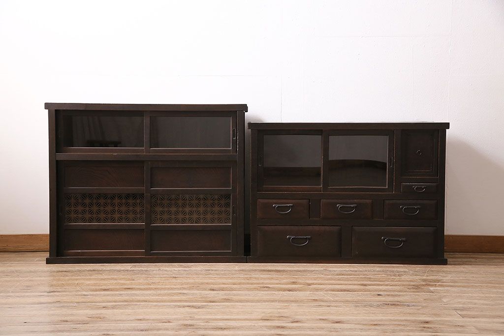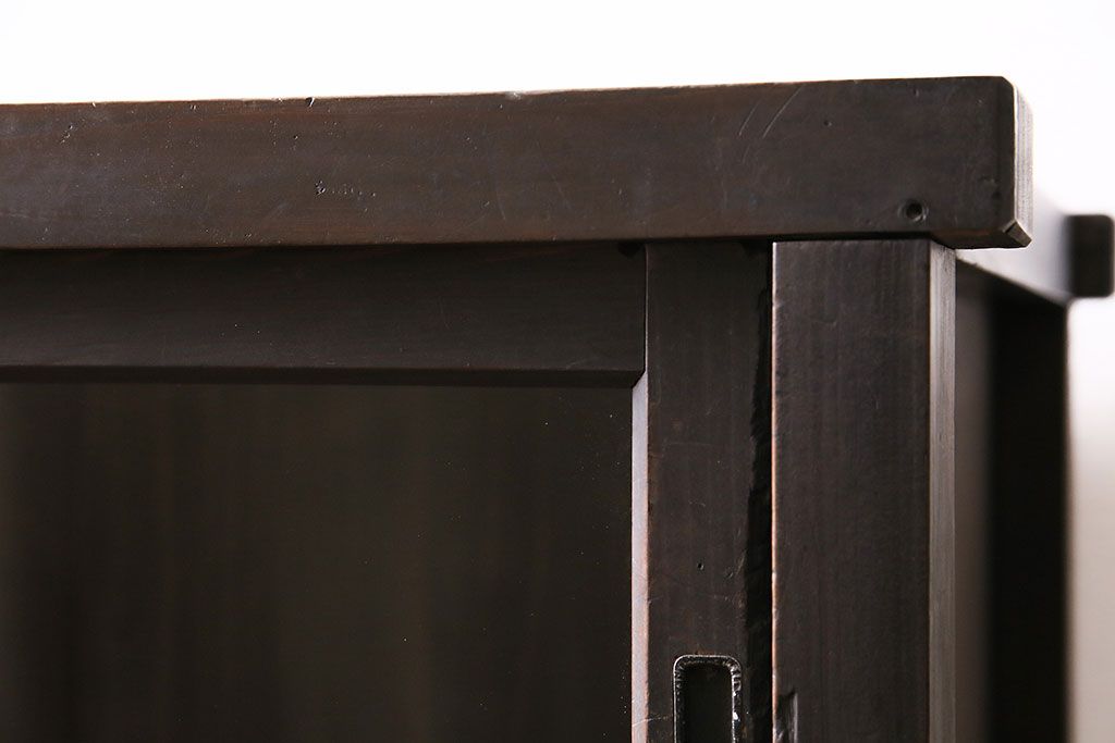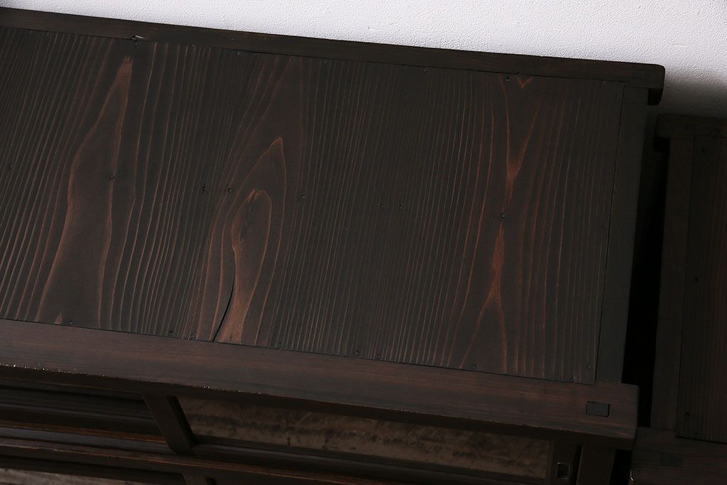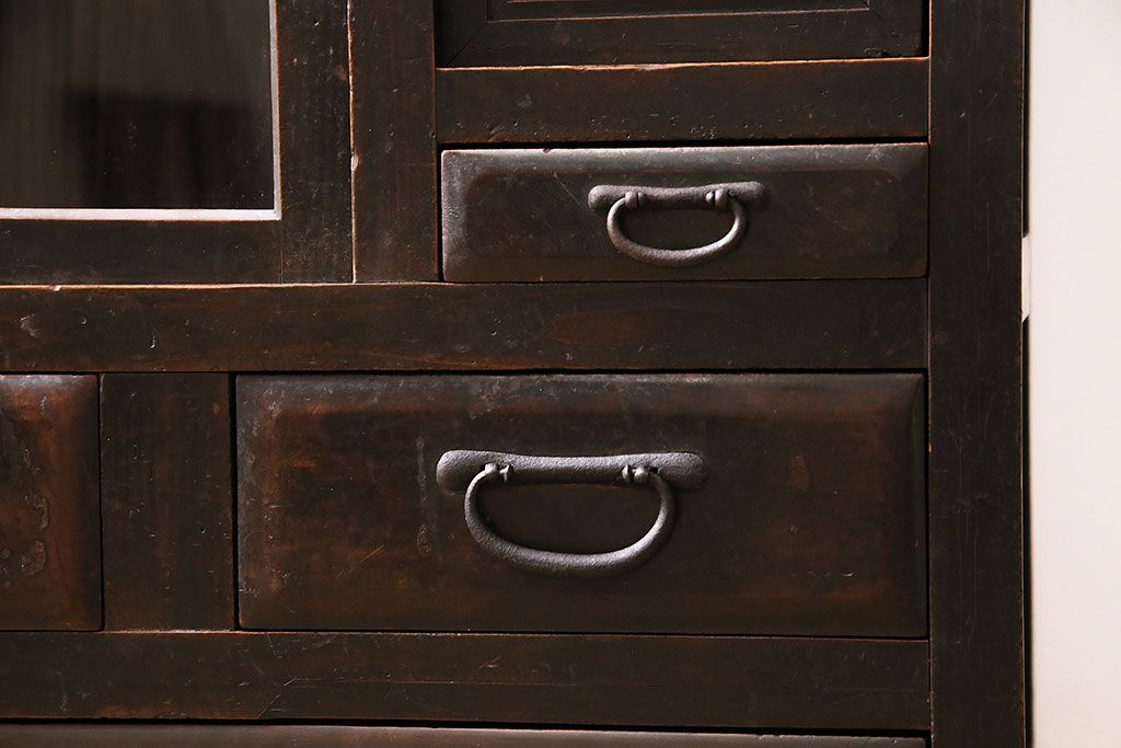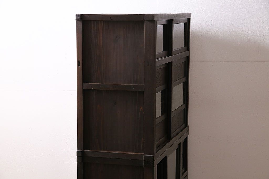 和製アンティーク 前面ヒノキ材・ケヤキ材 組子ガラスが目を引く渋い風合いの重ね戸棚(食器棚、収納棚)(R-047036)