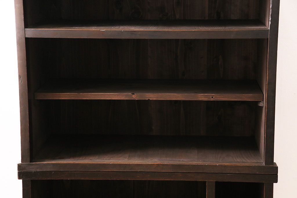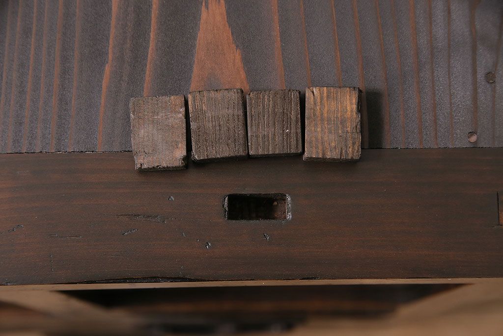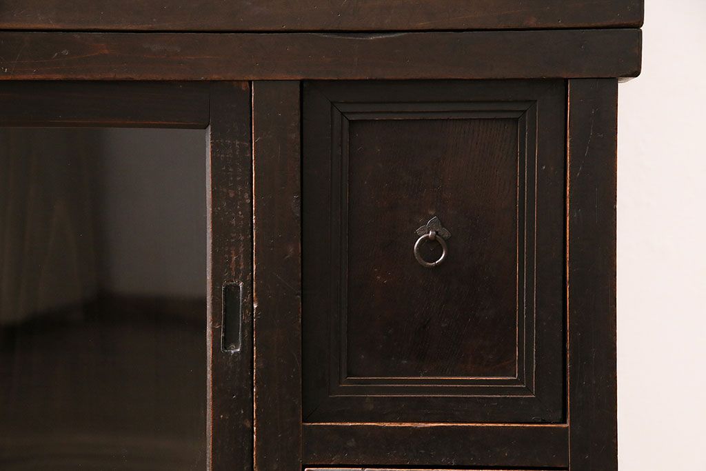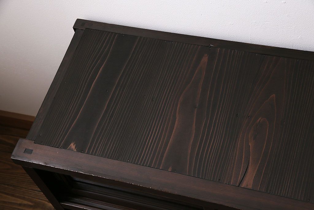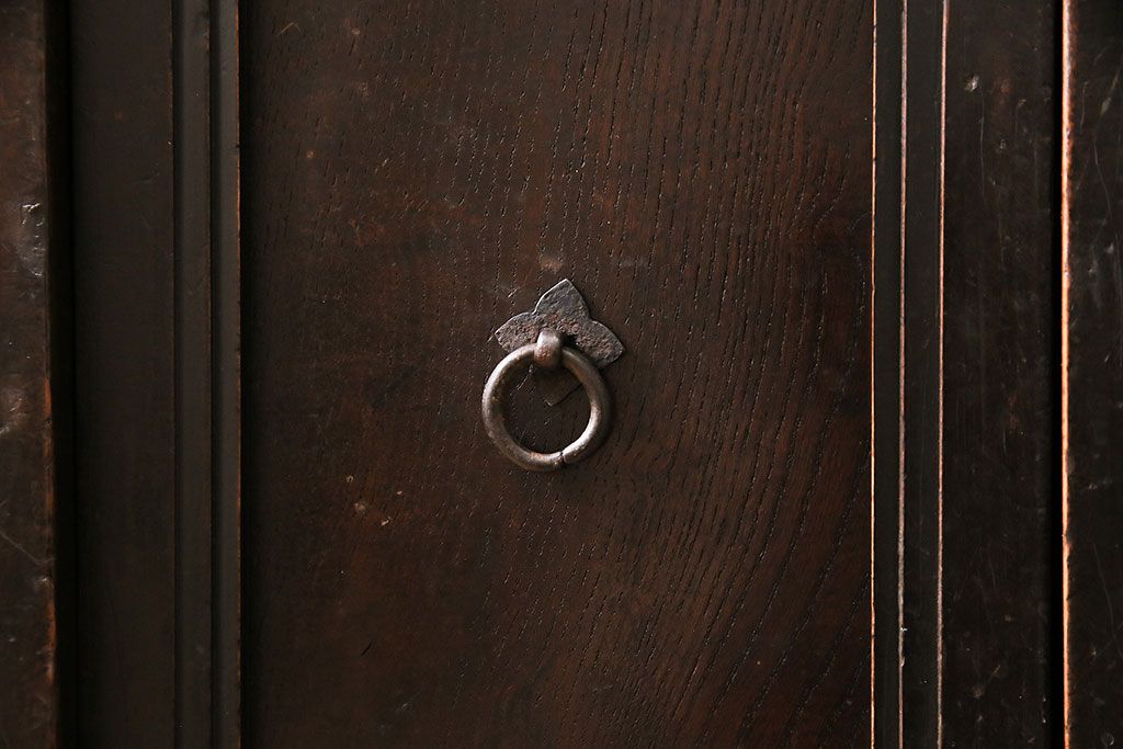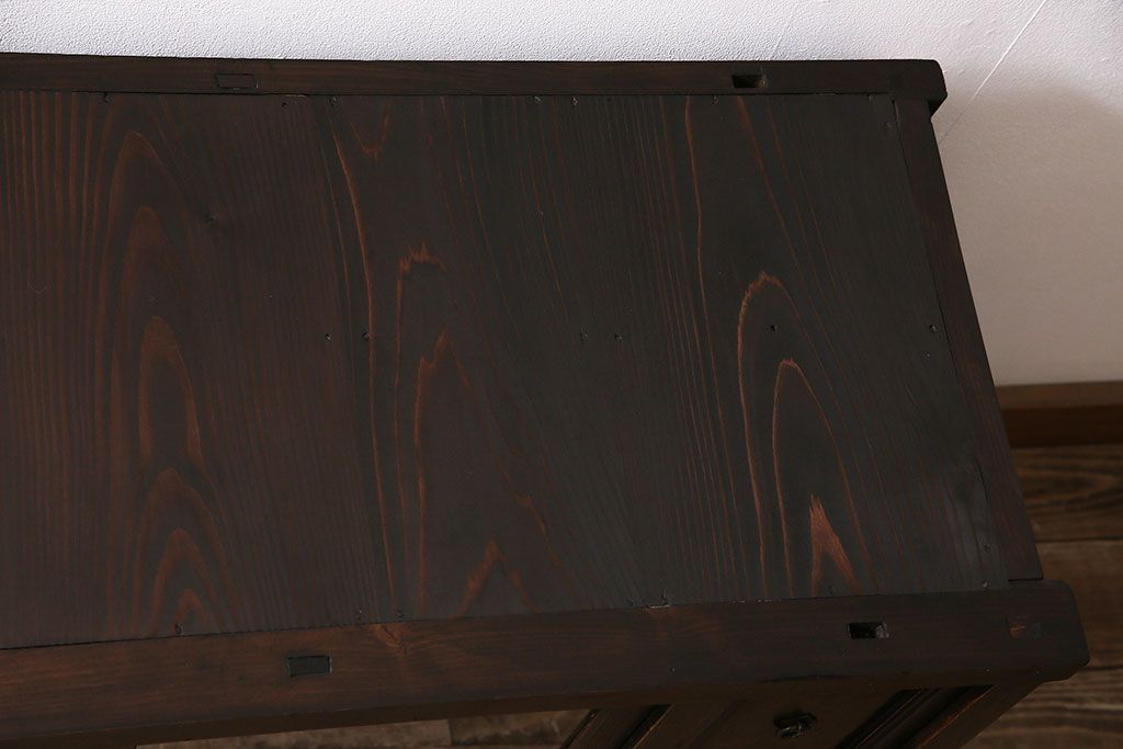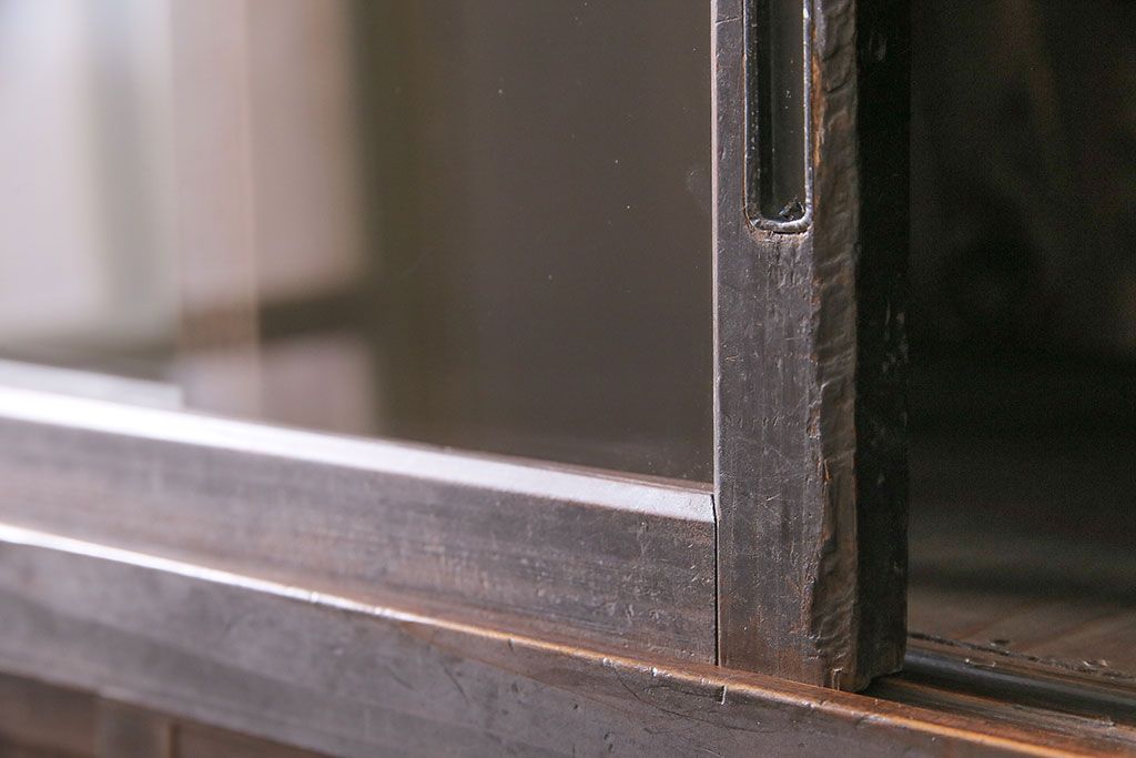 和製アンティーク 前面ヒノキ材・ケヤキ材 組子ガラスが目を引く渋い風合いの重ね戸棚(食器棚、収納棚)(R-047036)