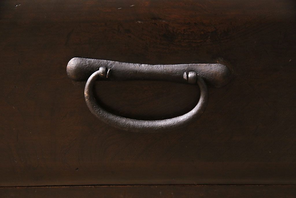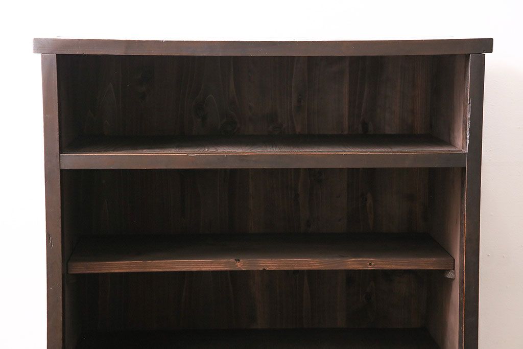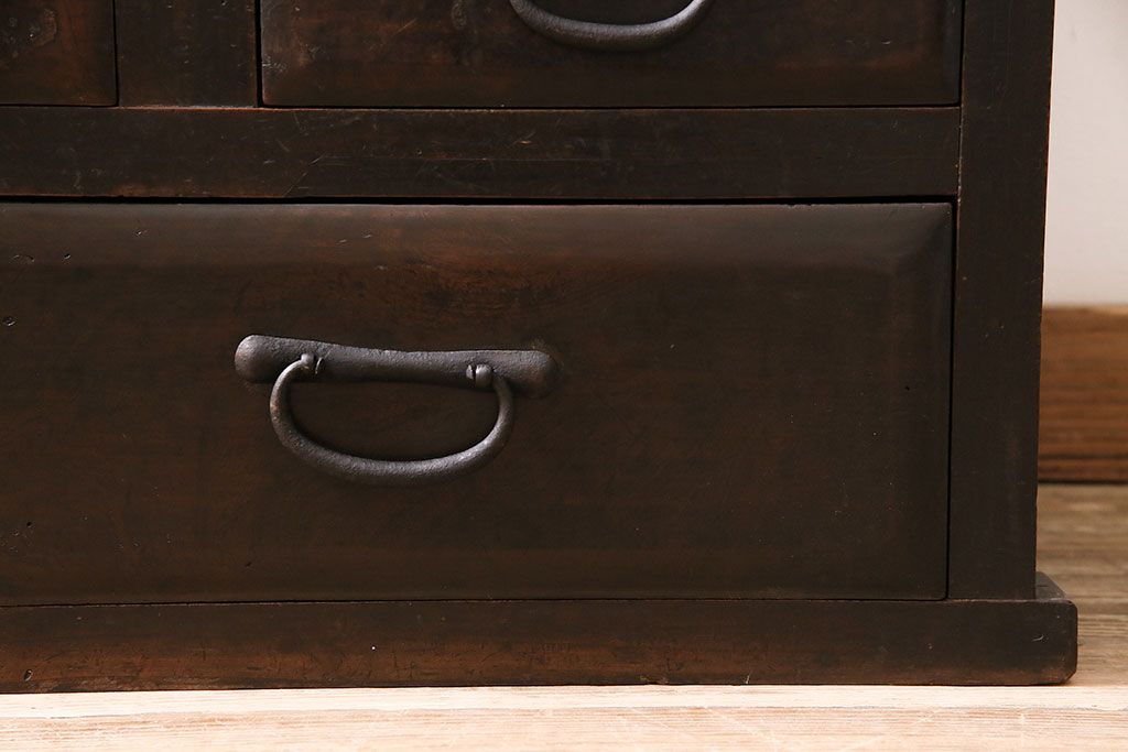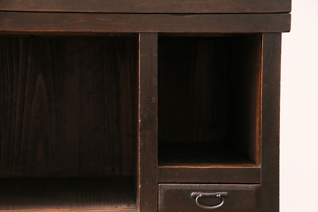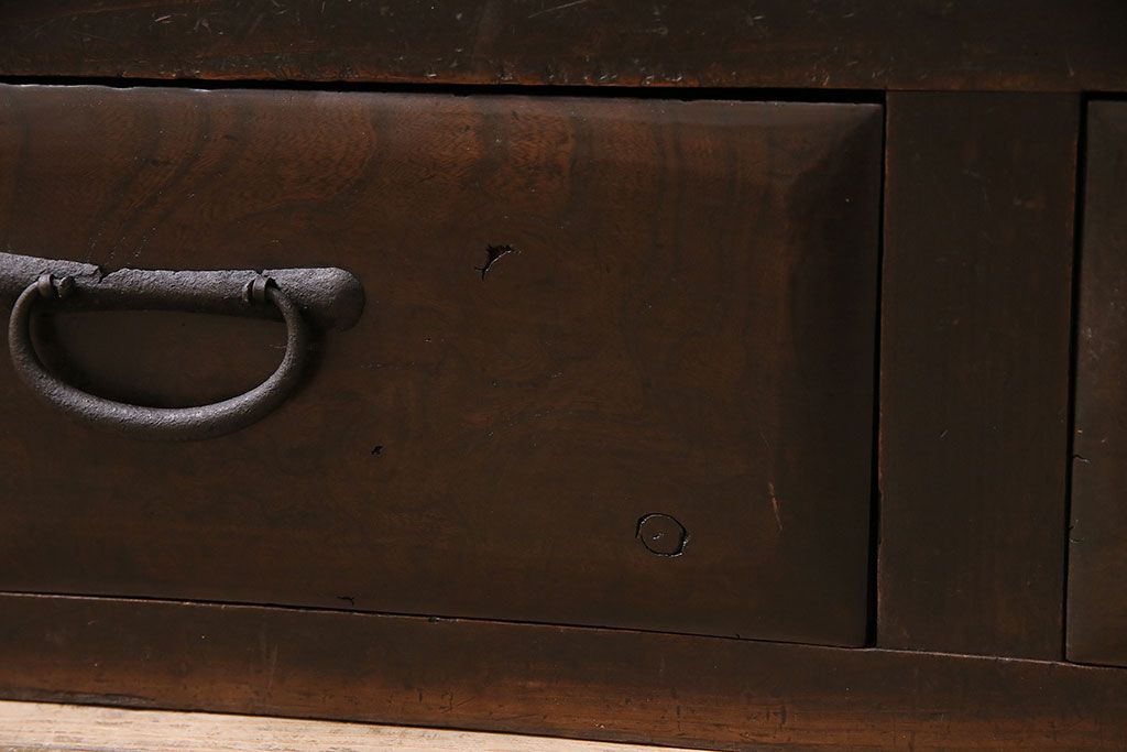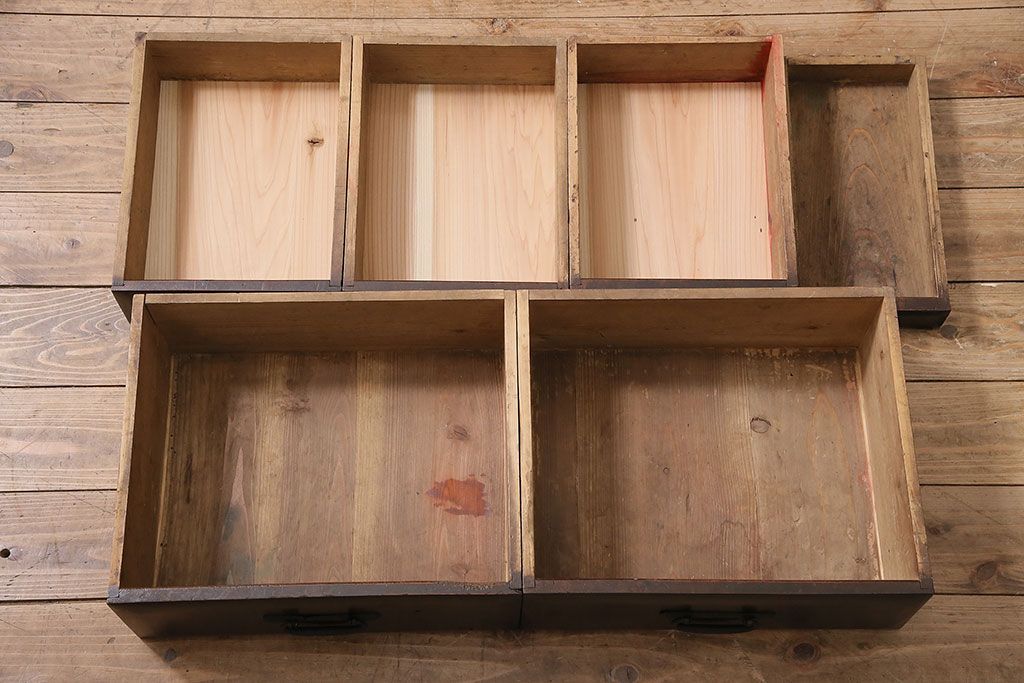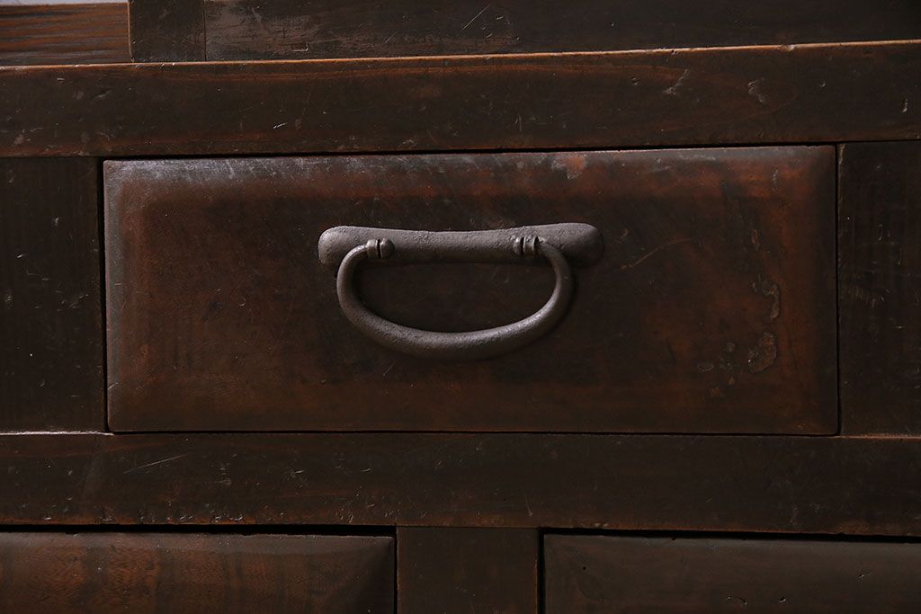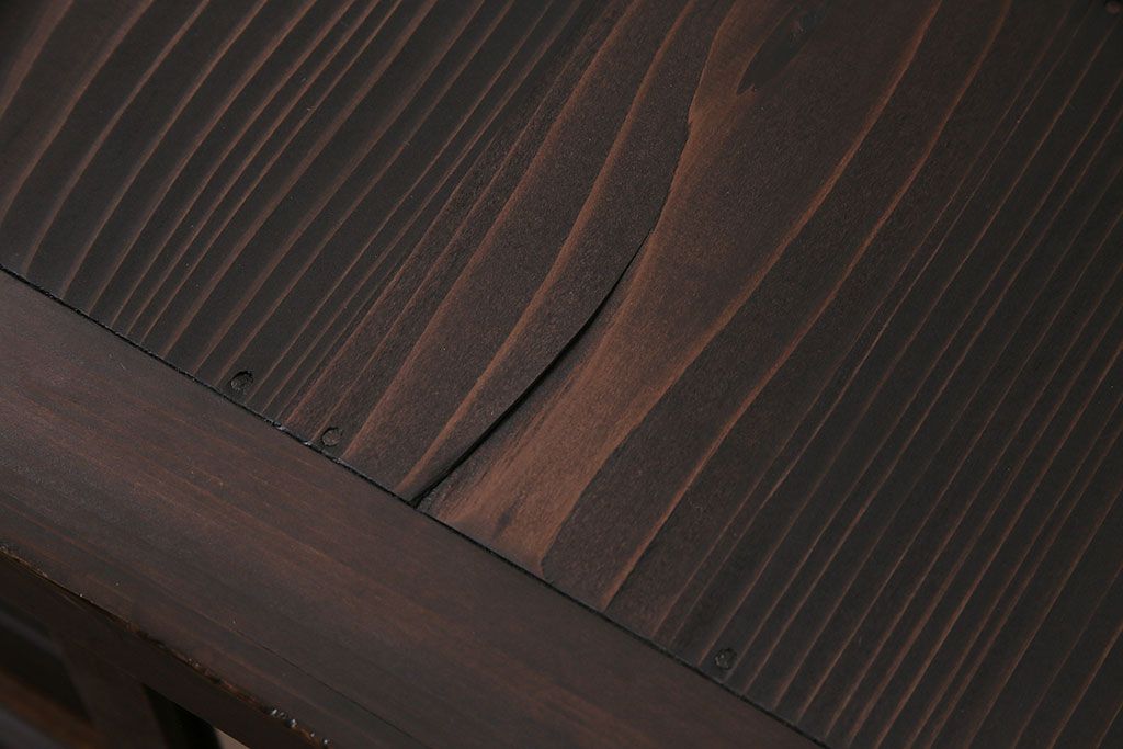 和製アンティーク 前面ヒノキ材・ケヤキ材 組子ガラスが目を引く渋い風合いの重ね戸棚(食器棚、収納棚)(R-047036)