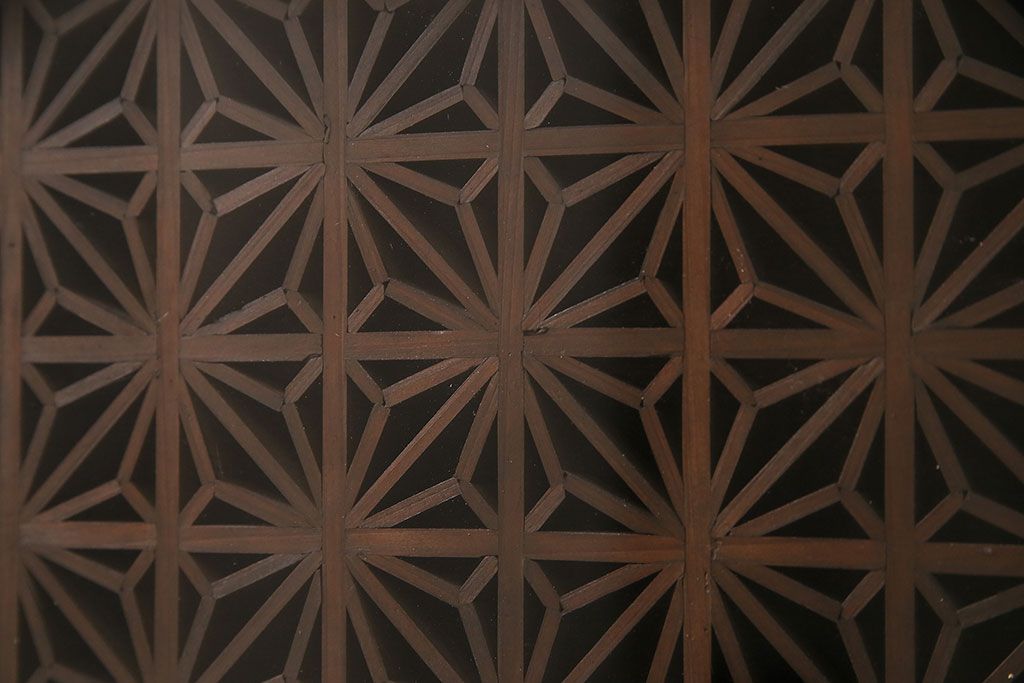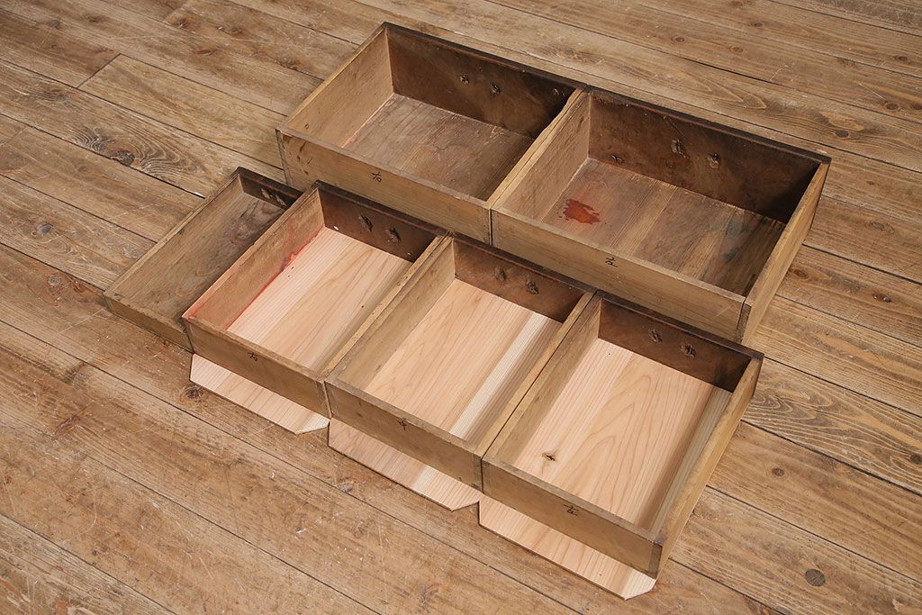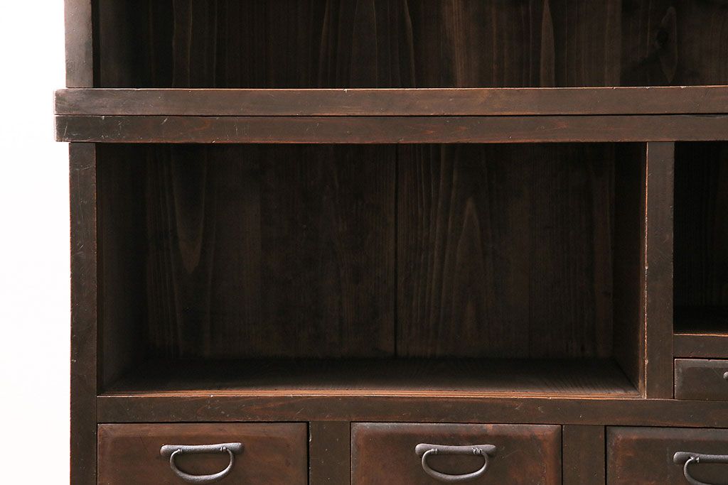 ラフジュ工房> キャビネット・戸棚> 食器棚・カップボード > 和製アンティーク 前面ヒノキ材・ケヤキ材 組子ガラスが目を引く渋い風合いの重ね戸棚(食器棚、収納棚)(R-047036)