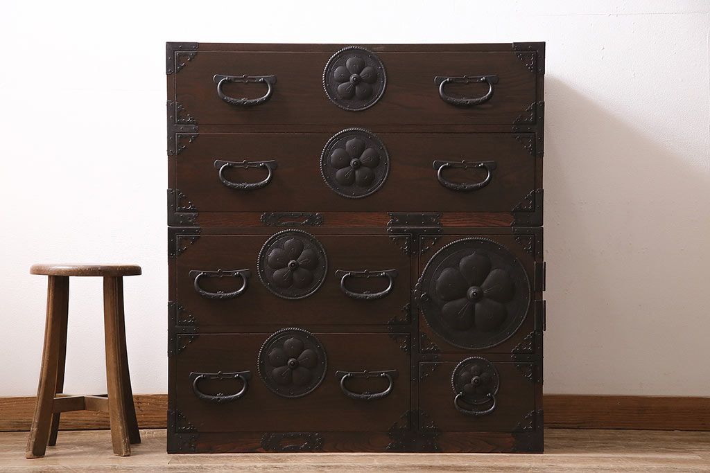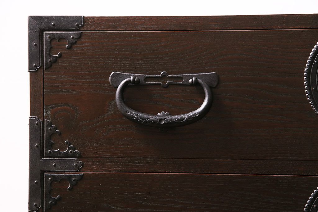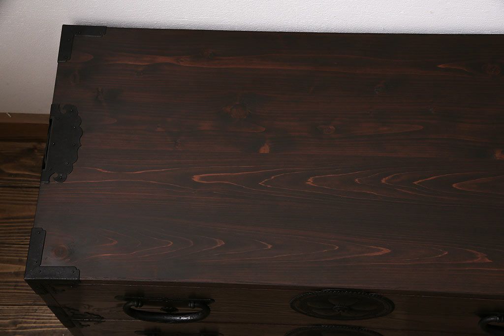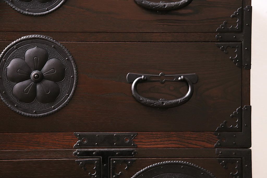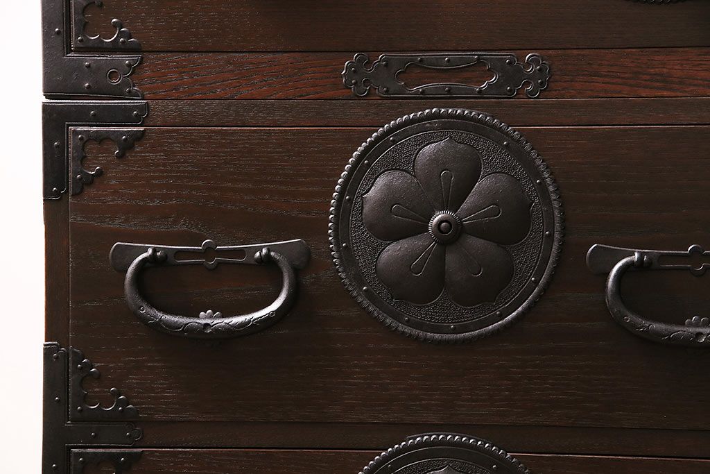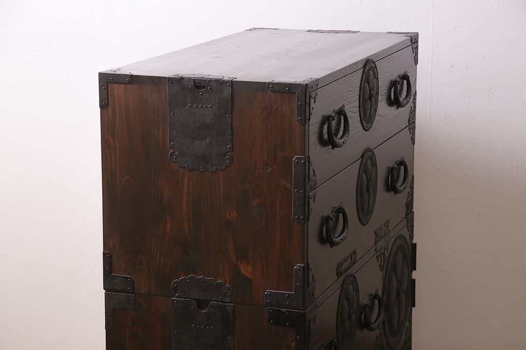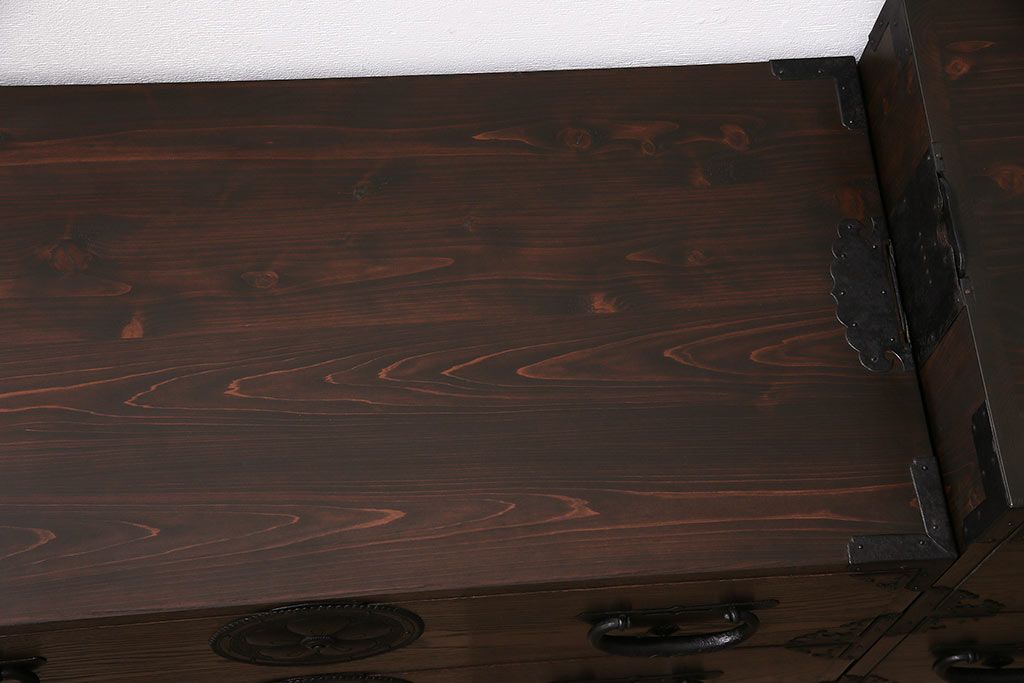 和箪笥> 衣装箪笥 > 重ね箪笥を新規製作!栗材、桐材、ヒノキ材で製作。アンティーク仙台箪笥の金具を使用。濃い茶色で着色し仕上げ。(衣装箪笥、収納箪笥、引き出し)