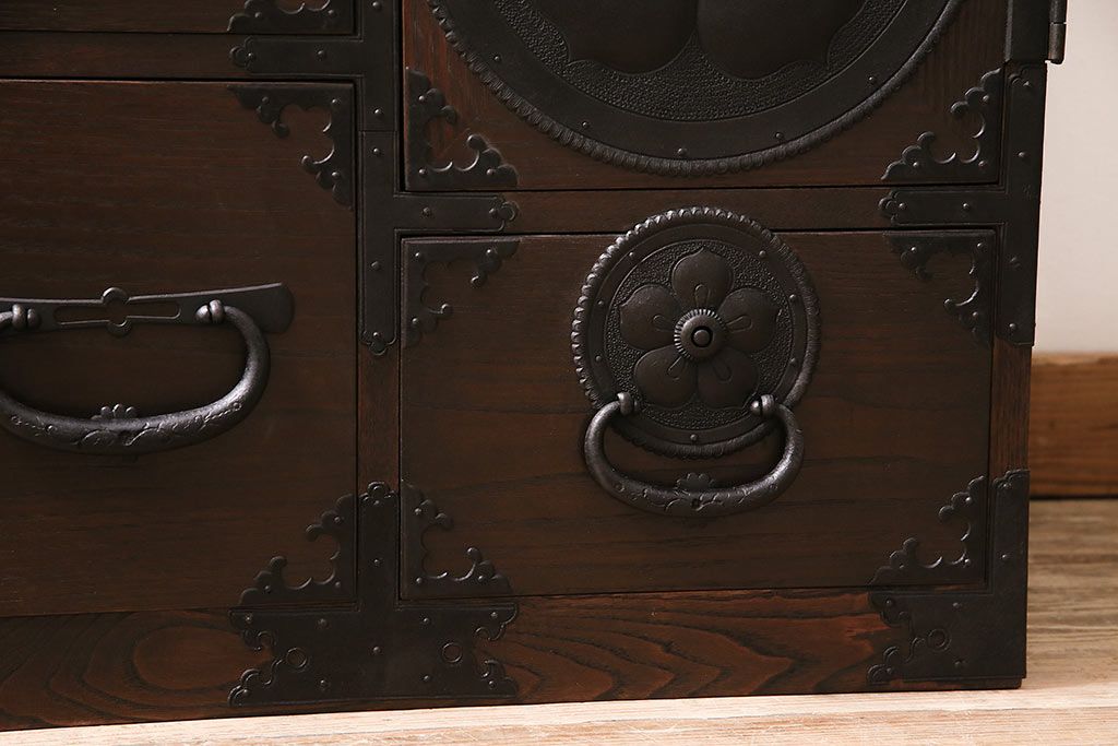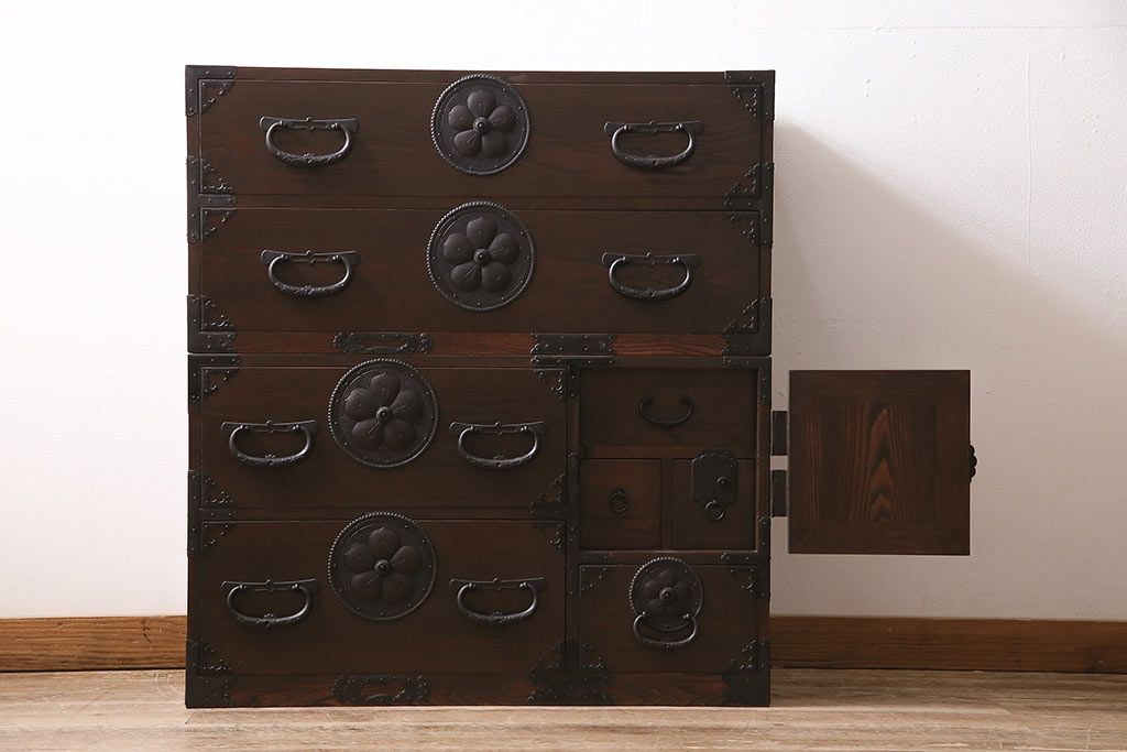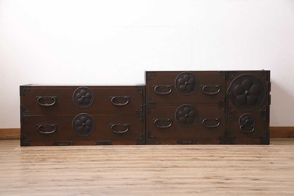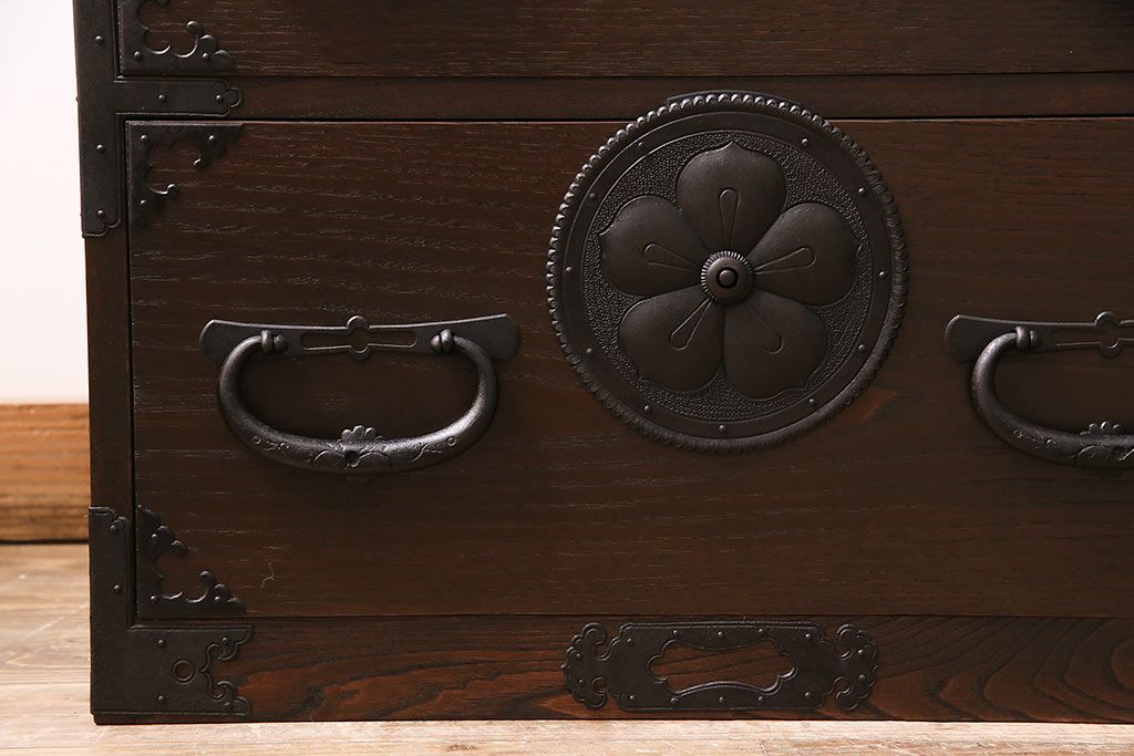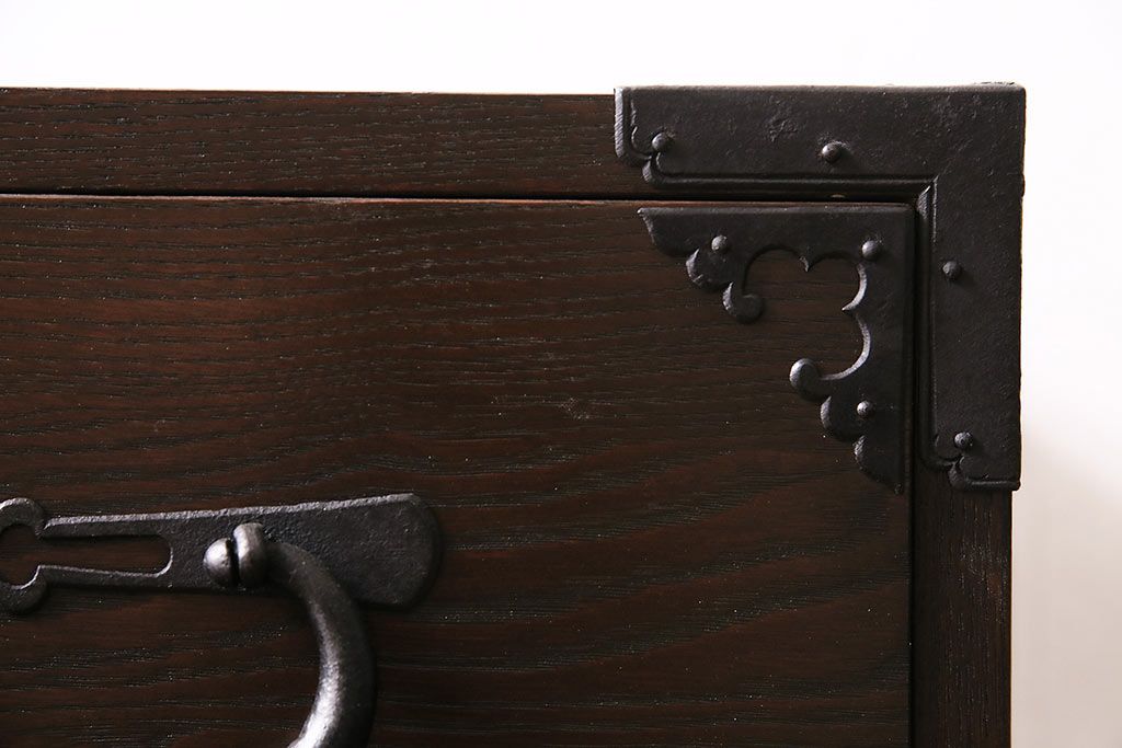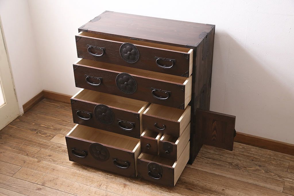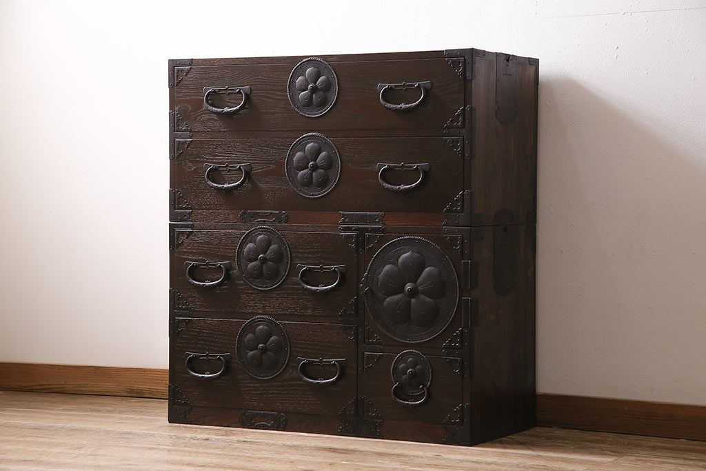 和箪笥> 衣装箪笥 > 重ね箪笥を新規製作!栗材、桐材、ヒノキ材で製作。アンティーク仙台箪笥の金具を使用。濃い茶色で着色し仕上げ。(衣装箪笥、収納箪笥、引き出し)