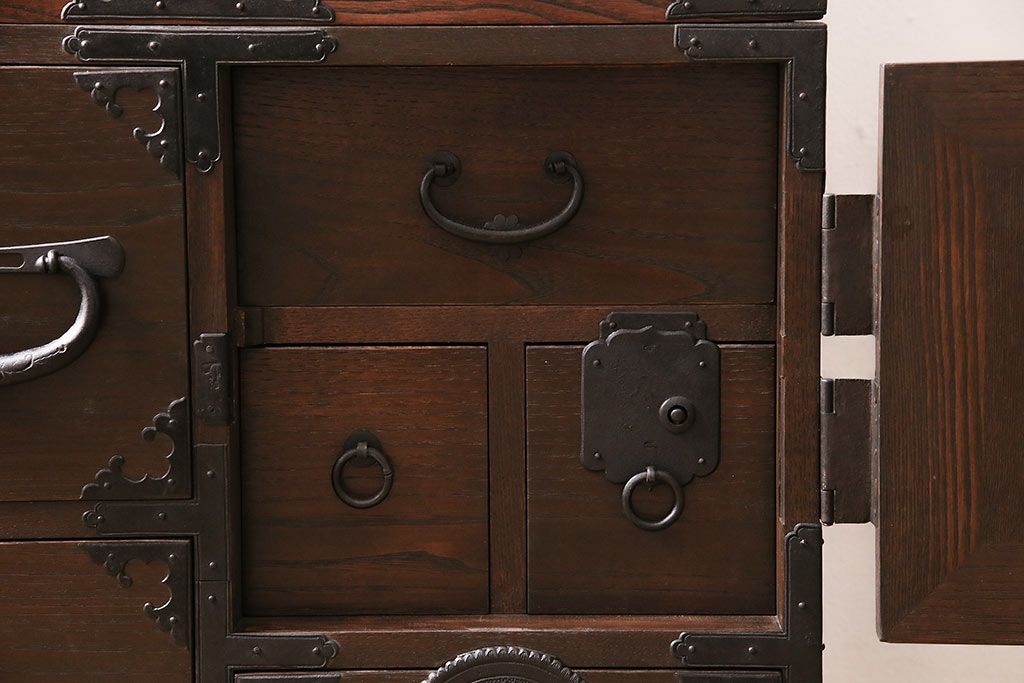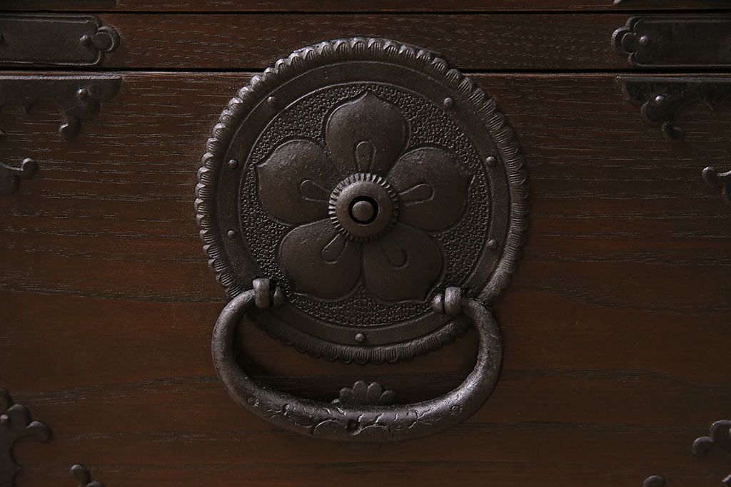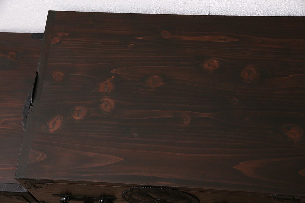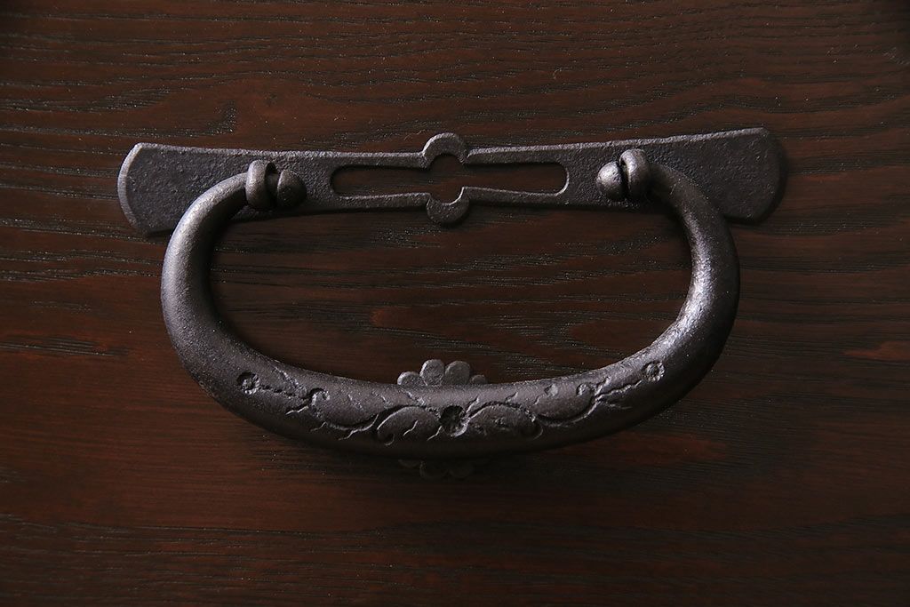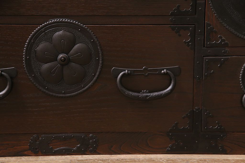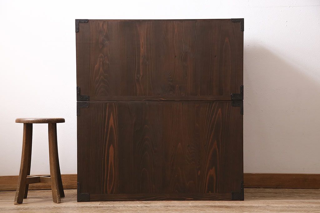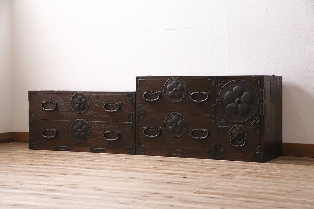 和箪笥> 衣装箪笥 > 重ね箪笥を新規製作!栗材、桐材、ヒノキ材で製作。アンティーク仙台箪笥の金具を使用。濃い茶色で着色し仕上げ。(衣装箪笥、収納箪笥、引き出し)