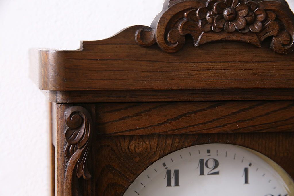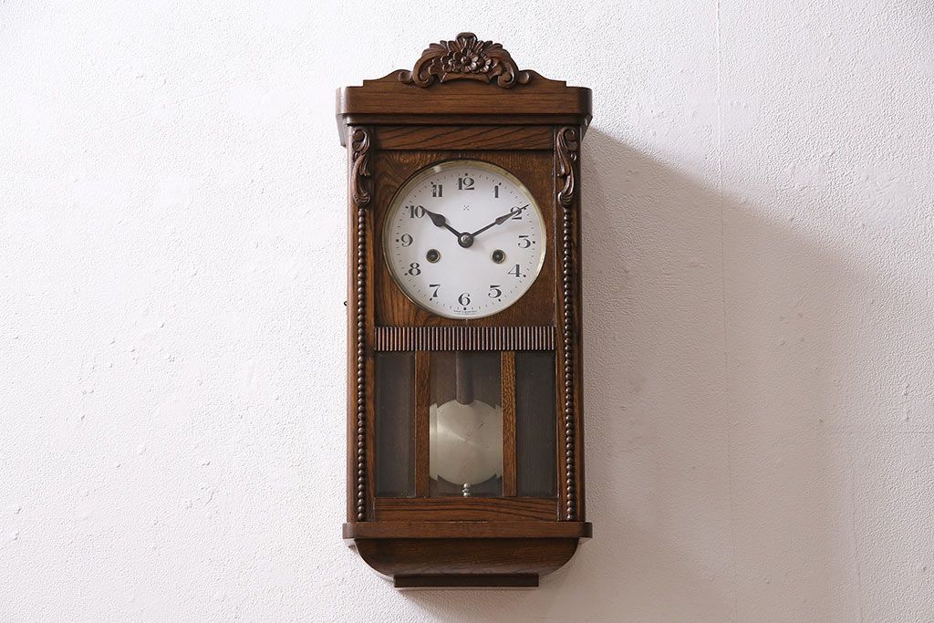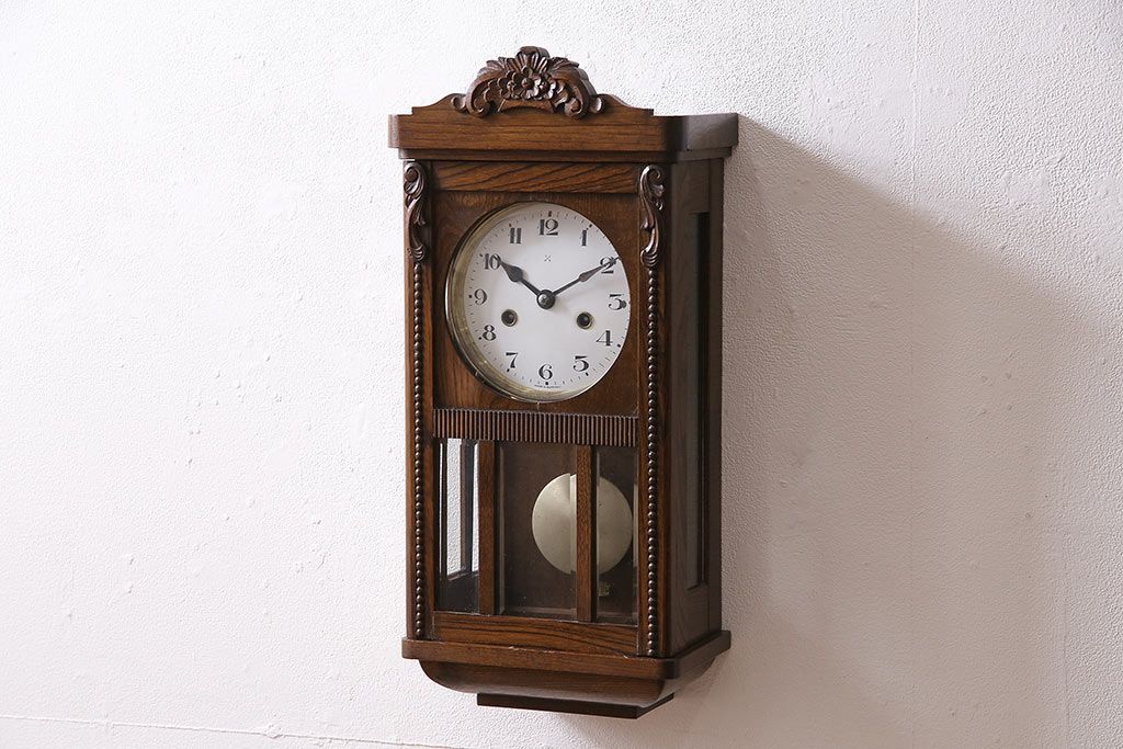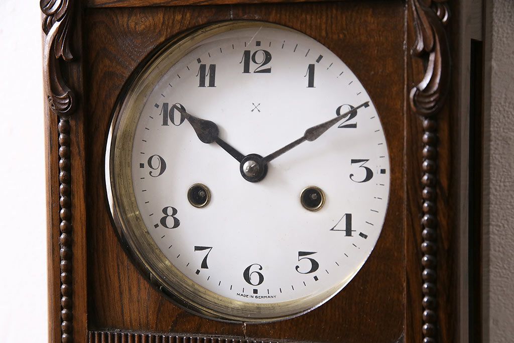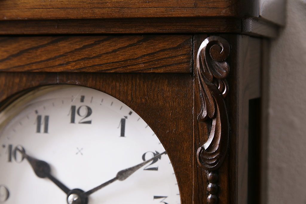 アンティーク時計 ドイツ製 ゼンマイ式 浮き彫り 木の温もりを感じる振り子時計(掛け時計、柱時計、古時計)(R-047099)