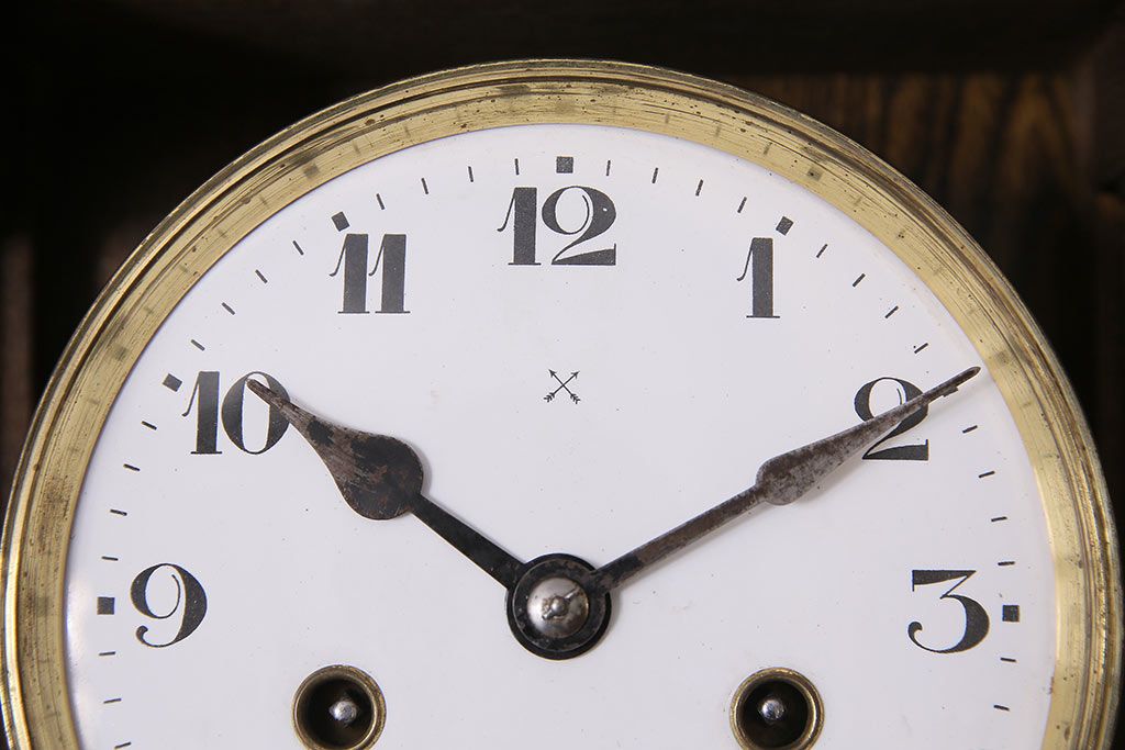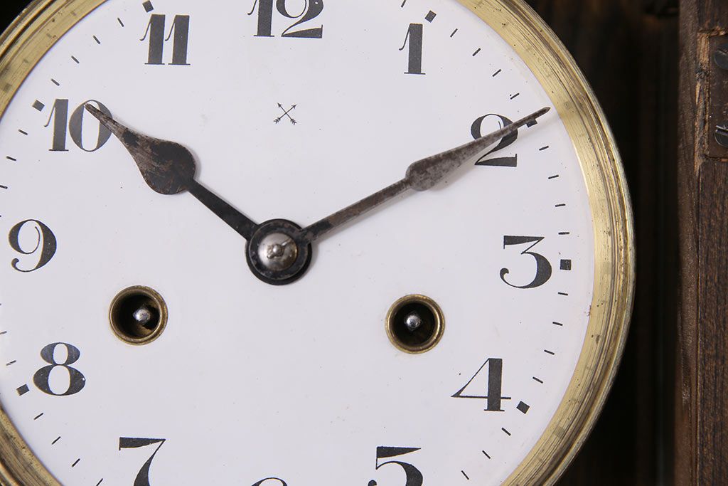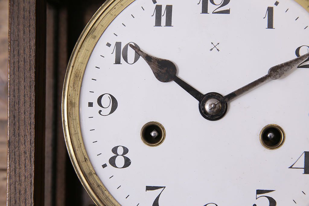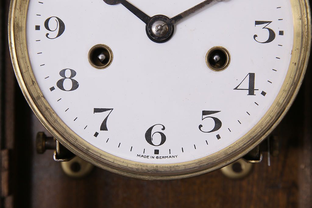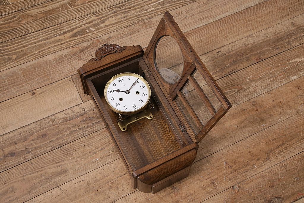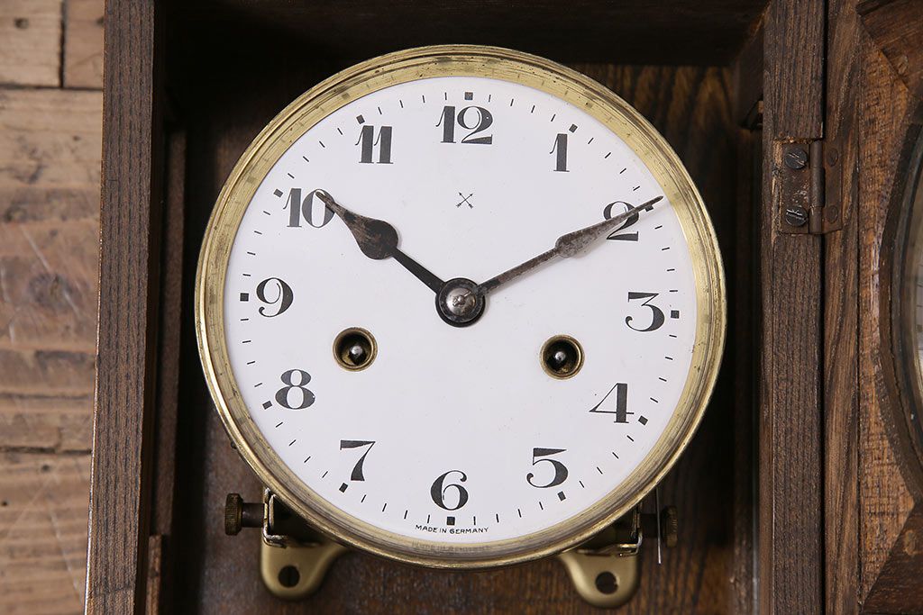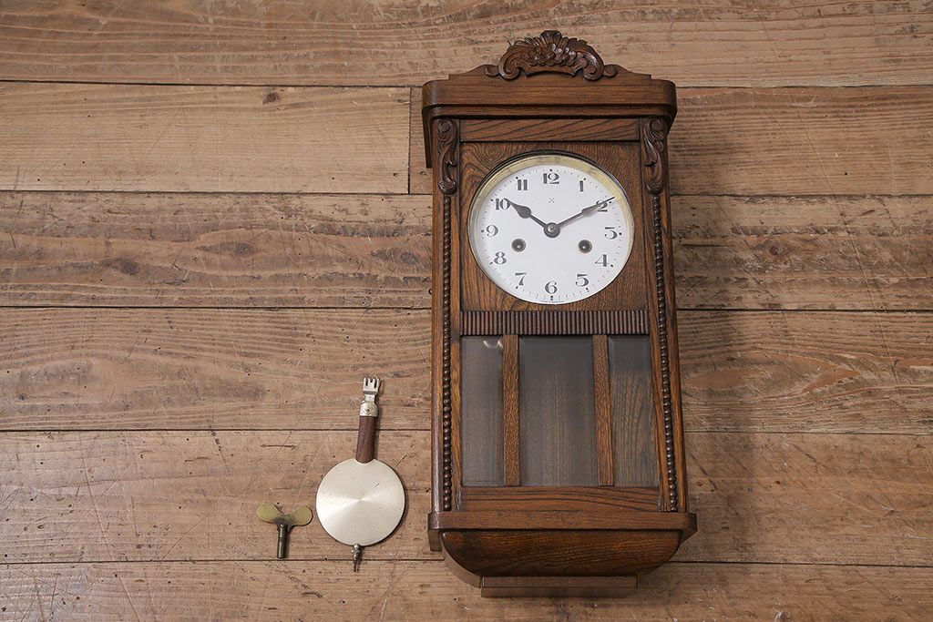 時計> 掛け時計 > アンティーク時計 ドイツ製 ゼンマイ式 浮き彫り 木の温もりを感じる振り子時計(掛け時計、柱時計、古時計)(R-047099)