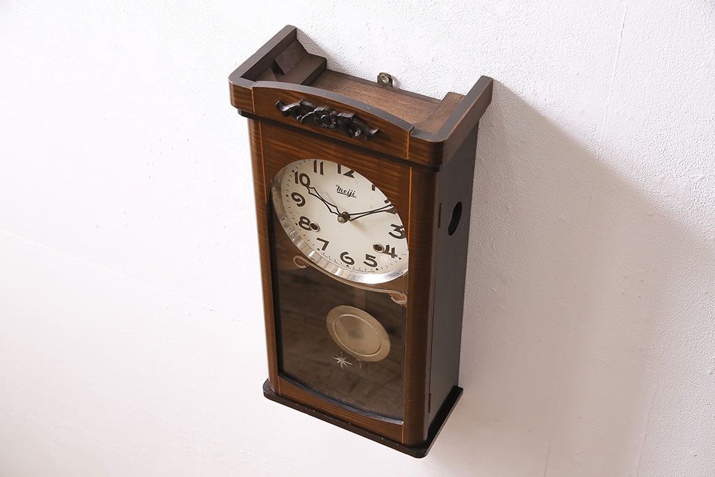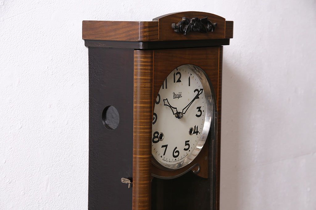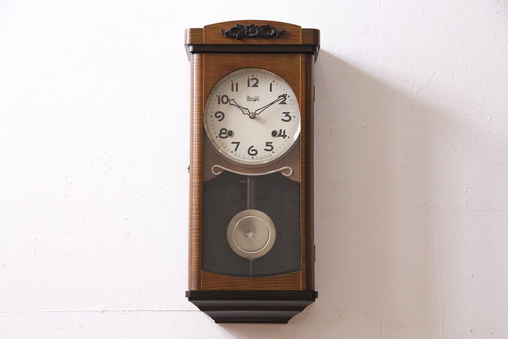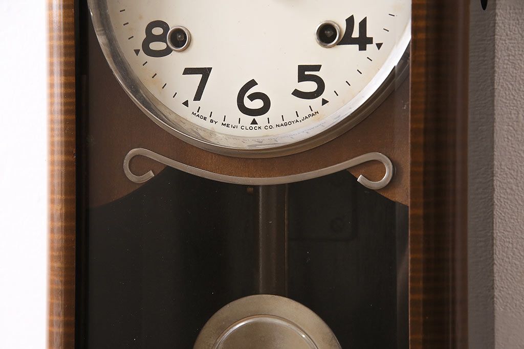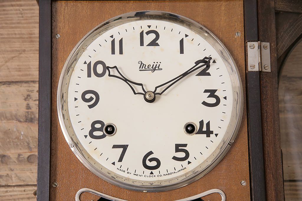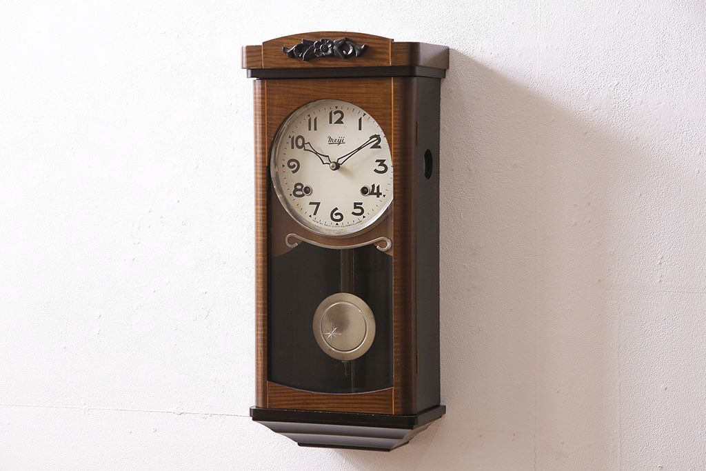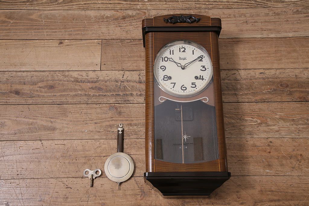 時計> 掛け時計 > ヴィンテージ時計 昭和中期 Meiji(明治時計社) ゼンマイ式 クラシカルな雰囲気溢れる大振りの掛け時計(振り子時計、柱時計、古時計、ビンテージ)(R-047039)