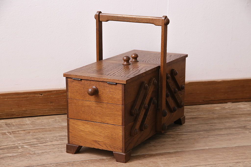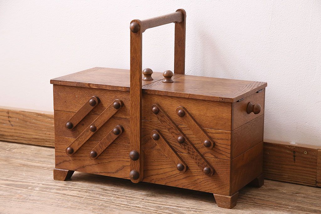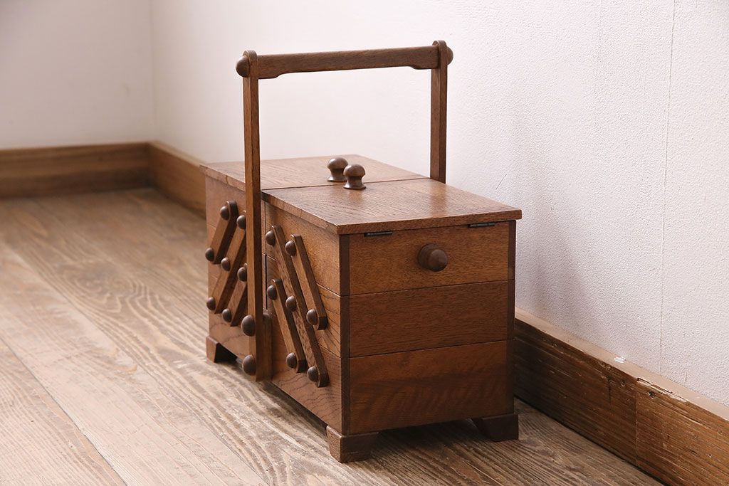 小物収納・トランク > アンティーク雑貨 松本民芸家具 絶版品!希少! 木の温もりを感じる脚付きソーイングボックス(針箱、裁縫箱)(R-047377)