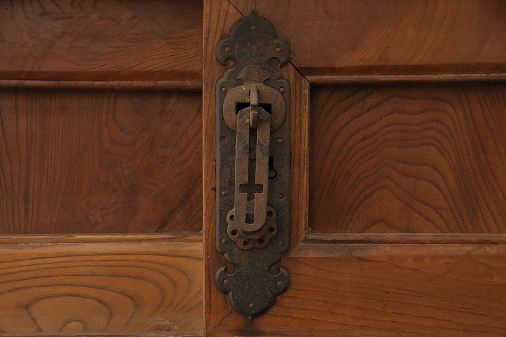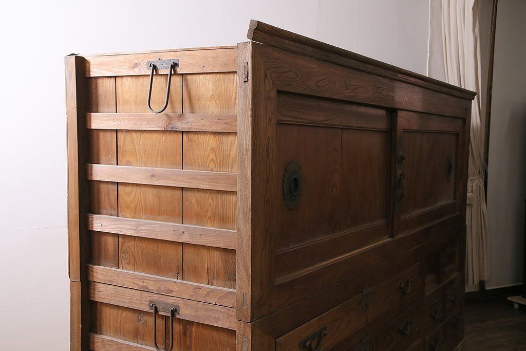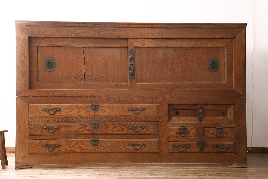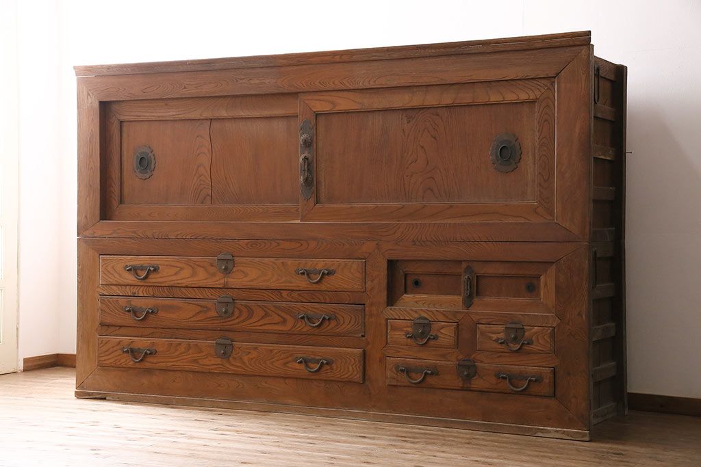 ラフジュ工房> 和箪笥 > 和製アンティーク 前面ケヤキ材 特大サイズで迫力抜群!希少な九尺物の収納箪笥(9尺、布団箪笥、重ね箪笥、水屋箪笥、夜具箪笥)(R-047133)