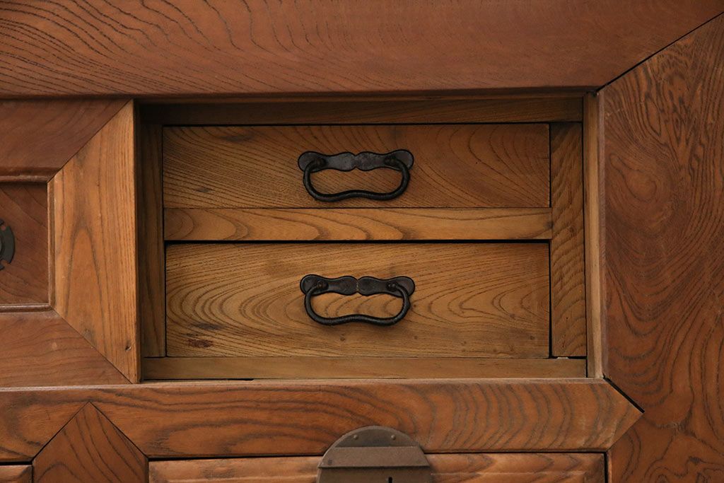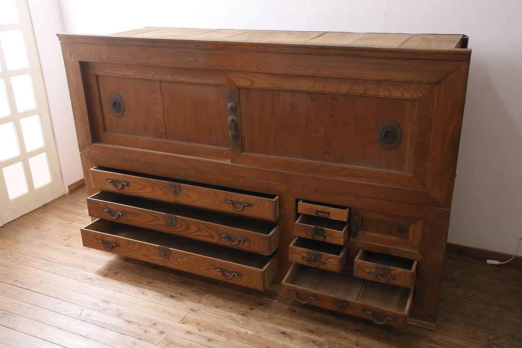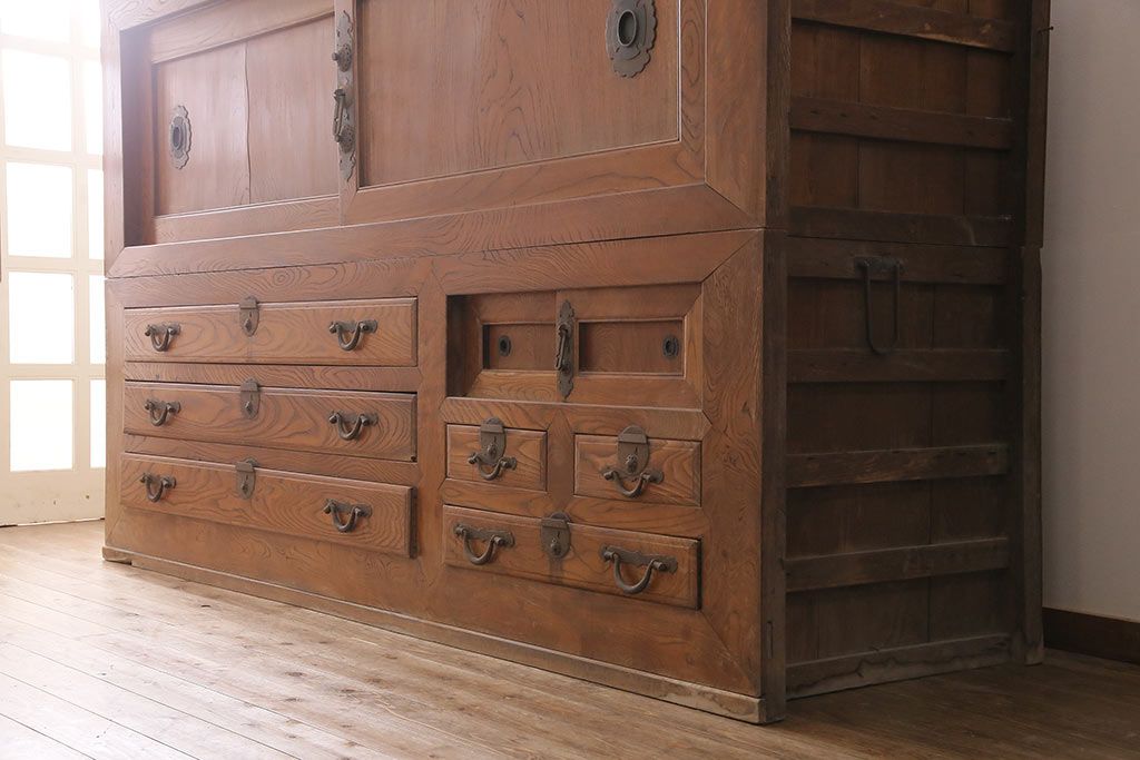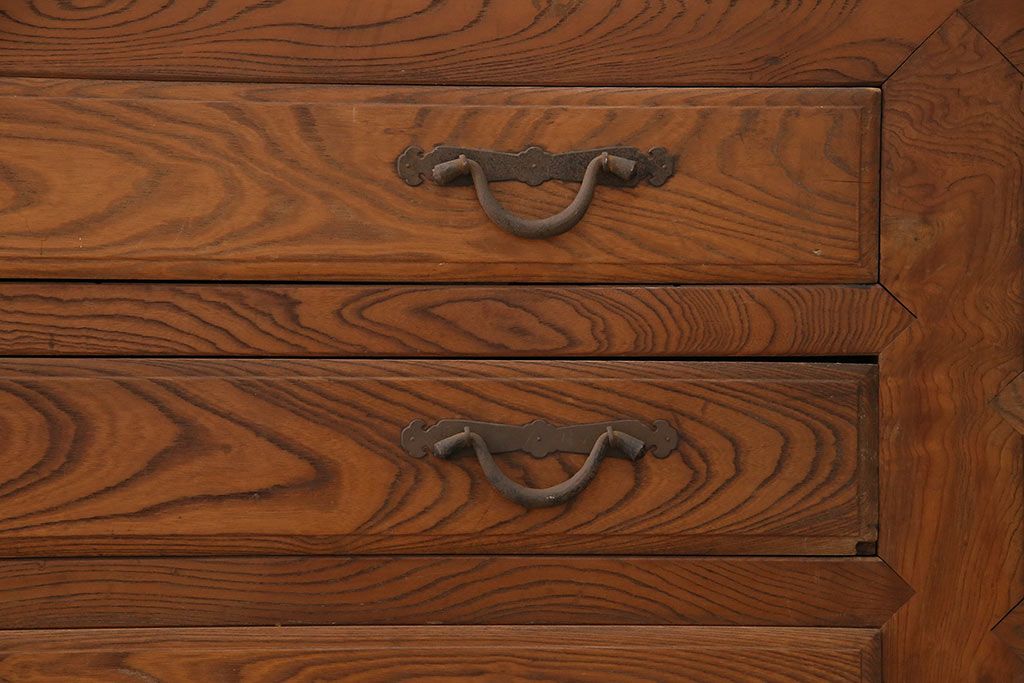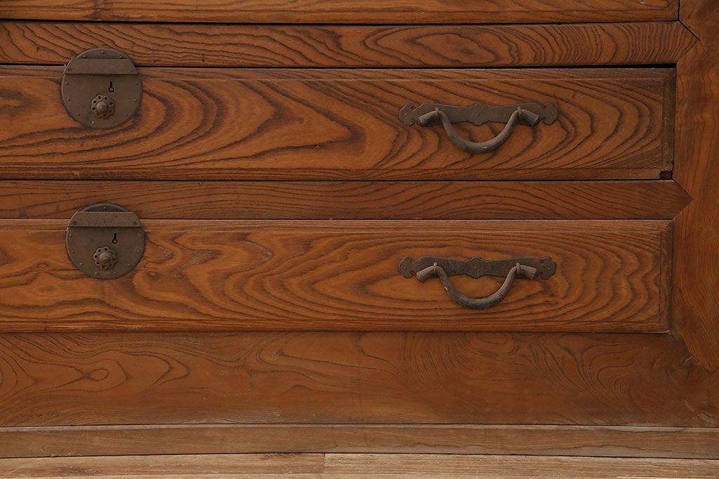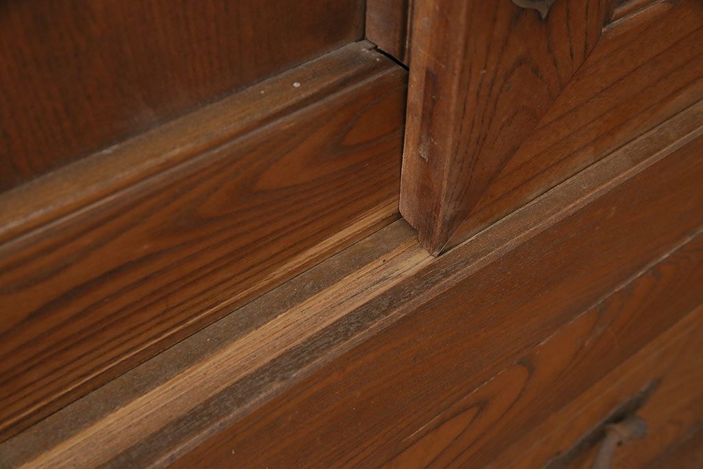 ラフジュ工房> 和箪笥> 夜具箪笥 > 和製アンティーク 前面ケヤキ材 特大サイズで迫力抜群!希少な九尺物の収納箪笥(9尺、布団箪笥、重ね箪笥、水屋箪笥、夜具箪笥)(R-047133)