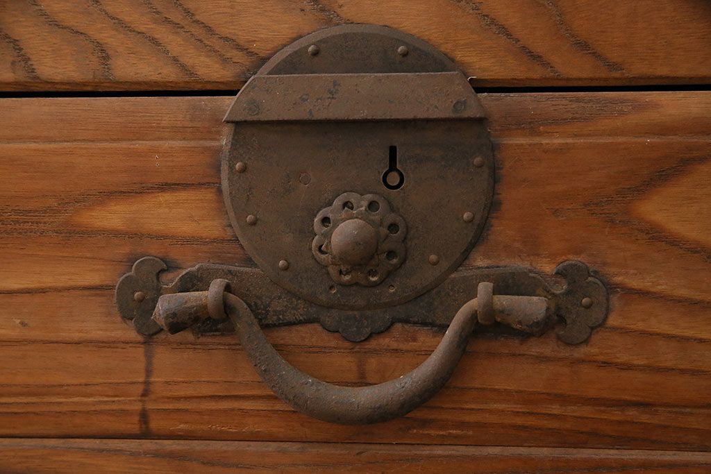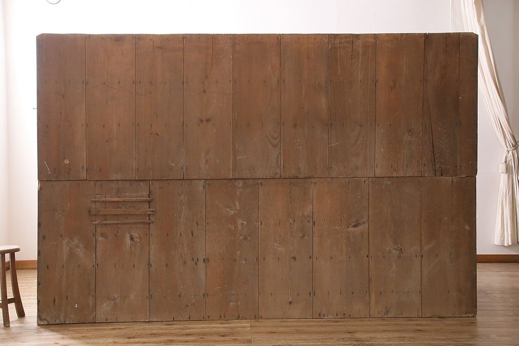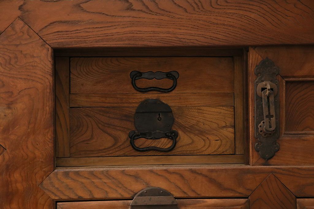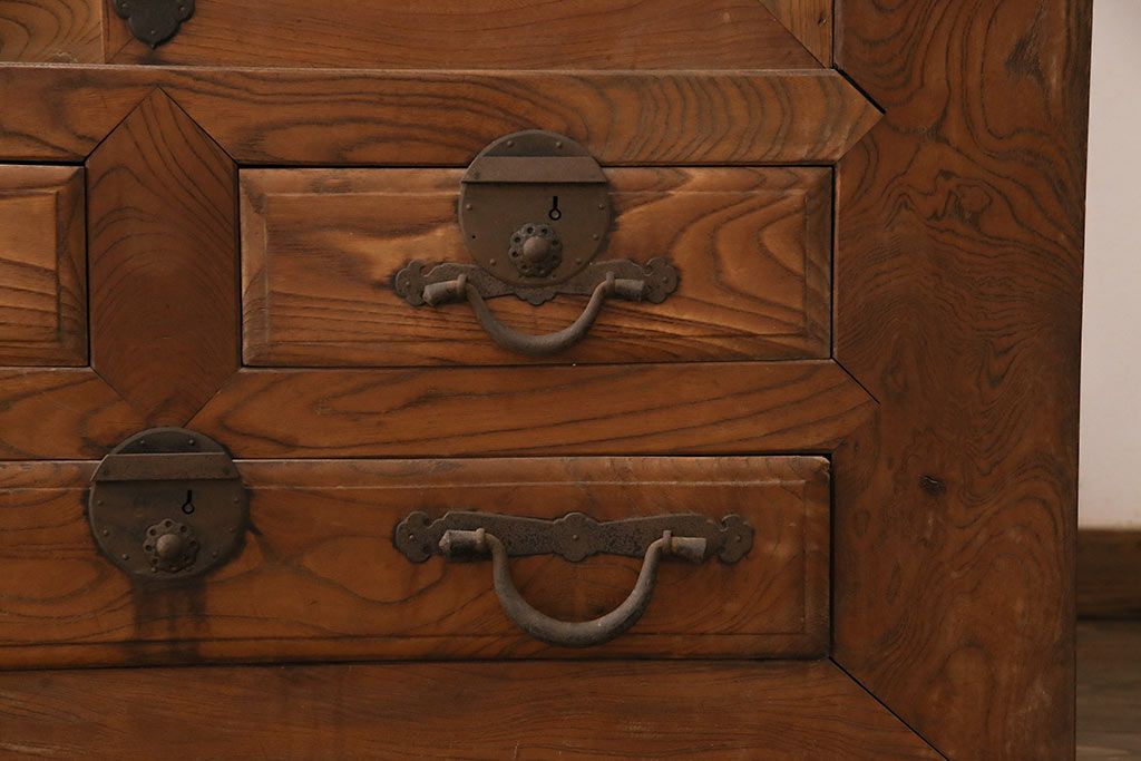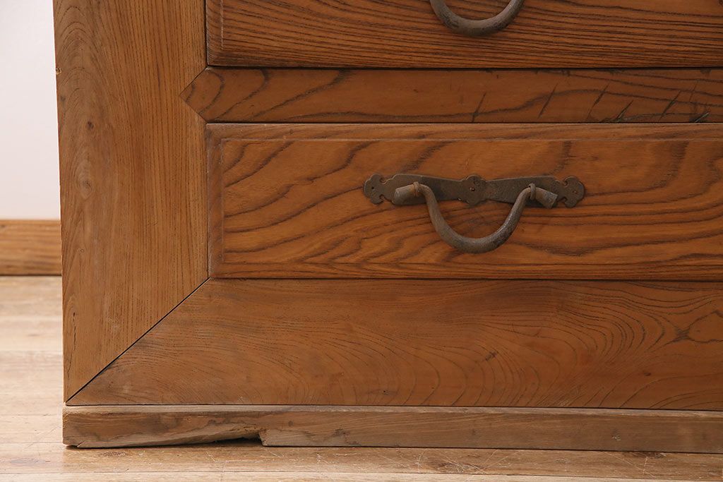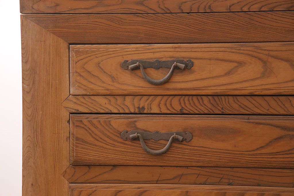 ラフジュ工房> 和箪笥> 夜具箪笥 > 和製アンティーク 前面ケヤキ材 特大サイズで迫力抜群!希少な九尺物の収納箪笥(9尺、布団箪笥、重ね箪笥、水屋箪笥、夜具箪笥)(R-047133)