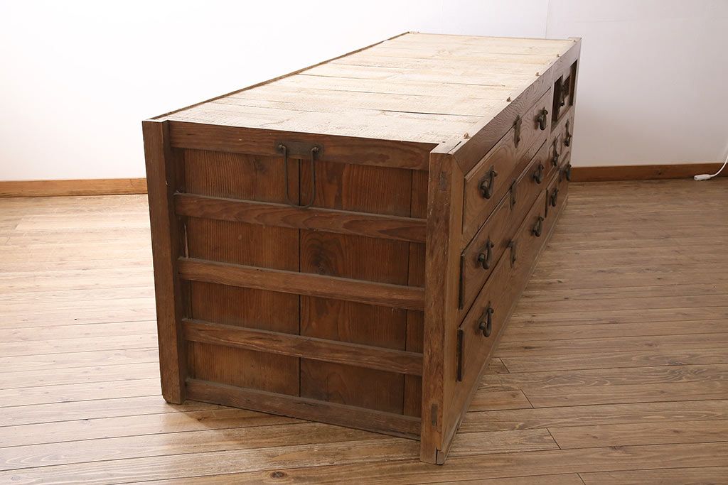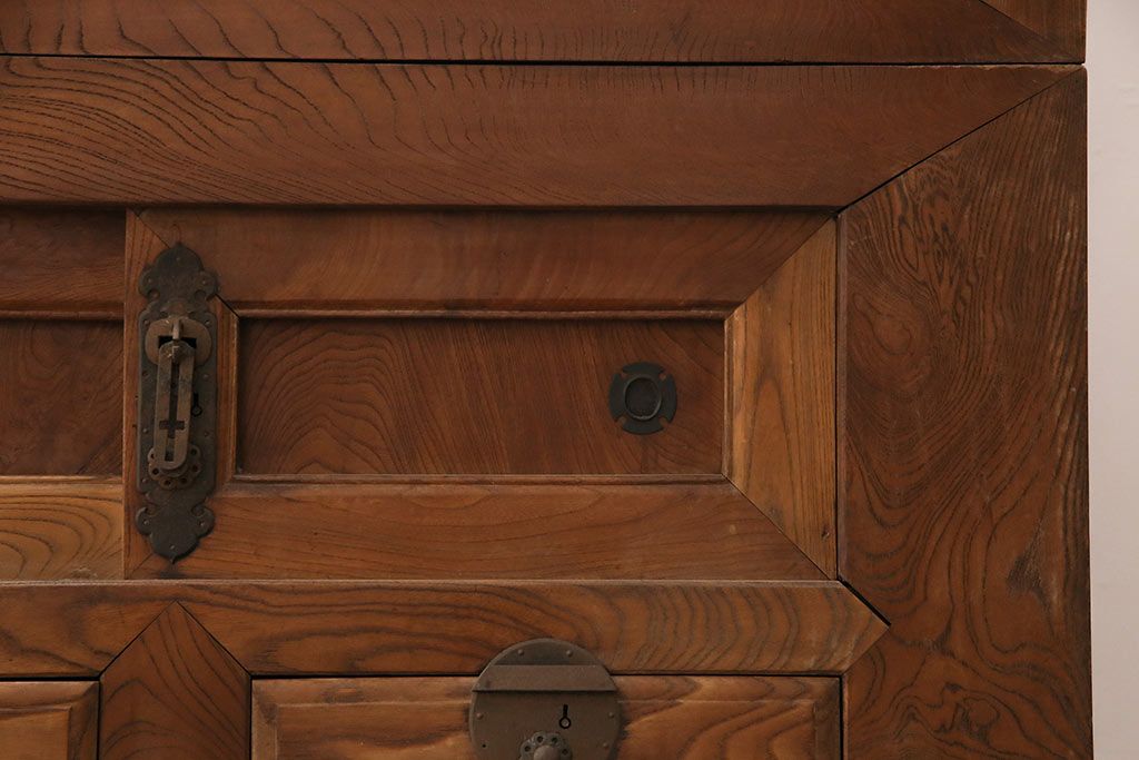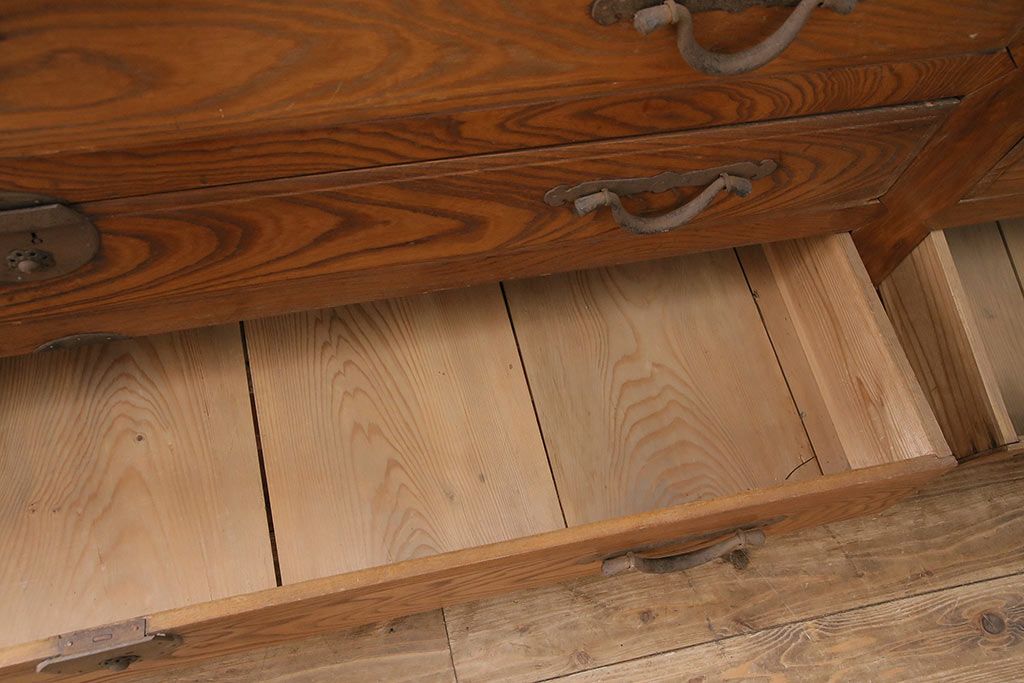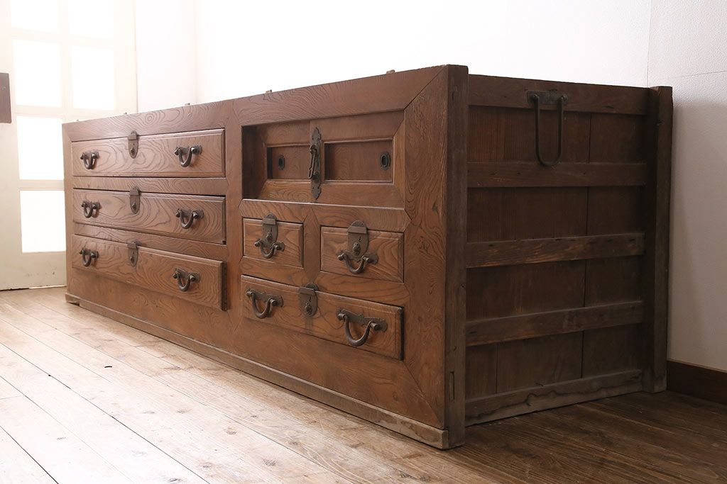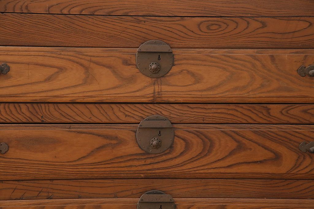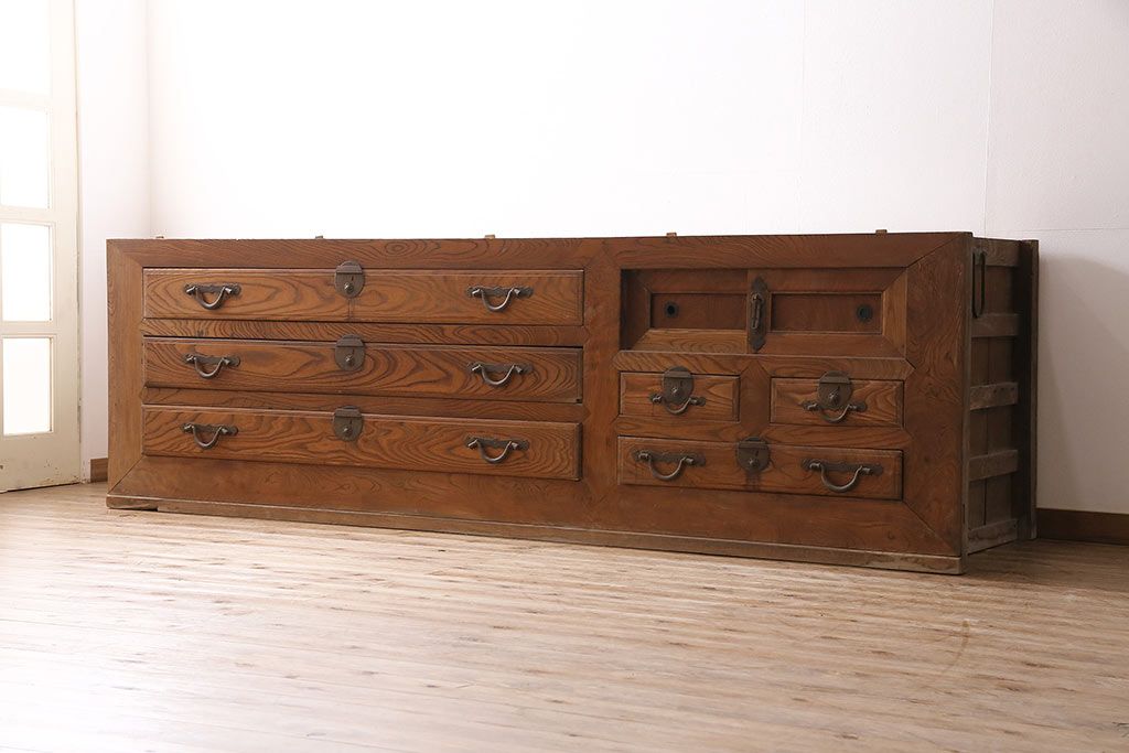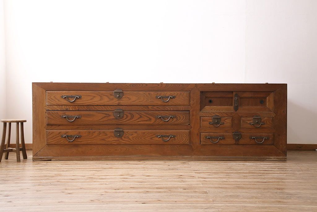ラフジュ工房> 和箪笥> 夜具箪笥 > 和製アンティーク 前面ケヤキ材 特大サイズで迫力抜群!希少な九尺物の収納箪笥(9尺、布団箪笥、重ね箪笥、水屋箪笥、夜具箪笥)(R-047135)