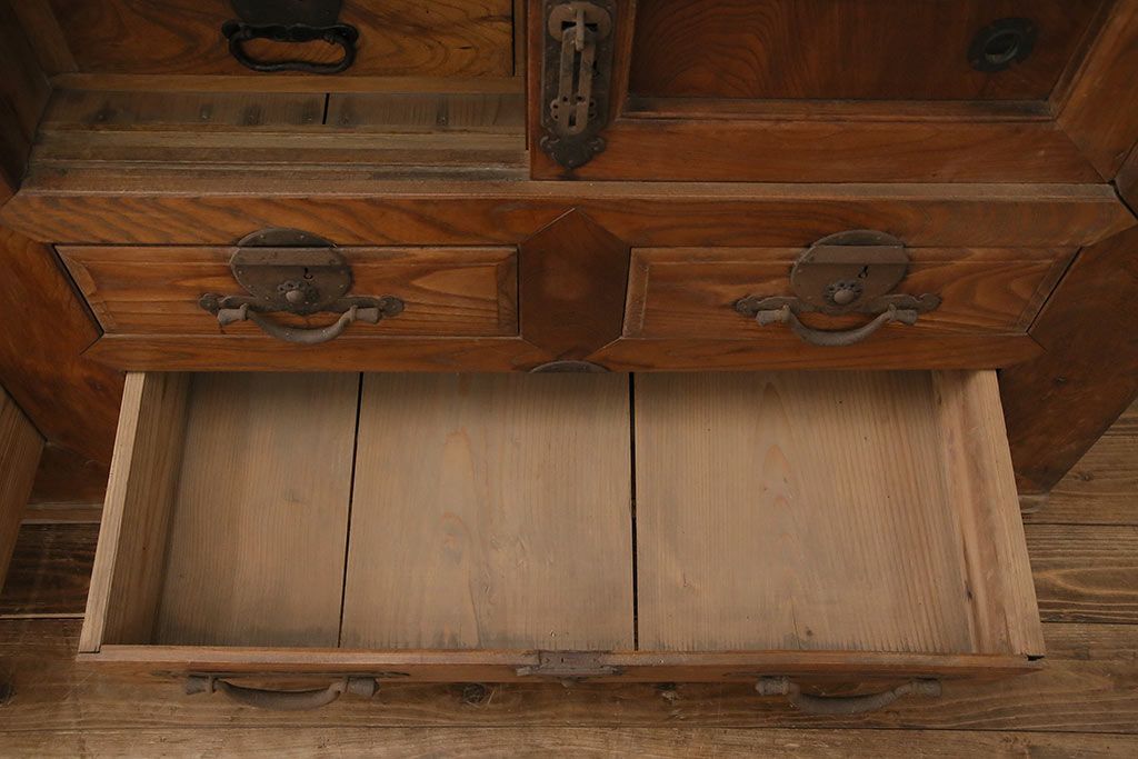 ラフジュ工房> 和箪笥> 水屋箪笥 > 和製アンティーク 前面ケヤキ材 特大サイズで迫力抜群!希少な九尺物の収納箪笥(9尺、布団箪笥、重ね箪笥、水屋箪笥、夜具箪笥)(R-047135)