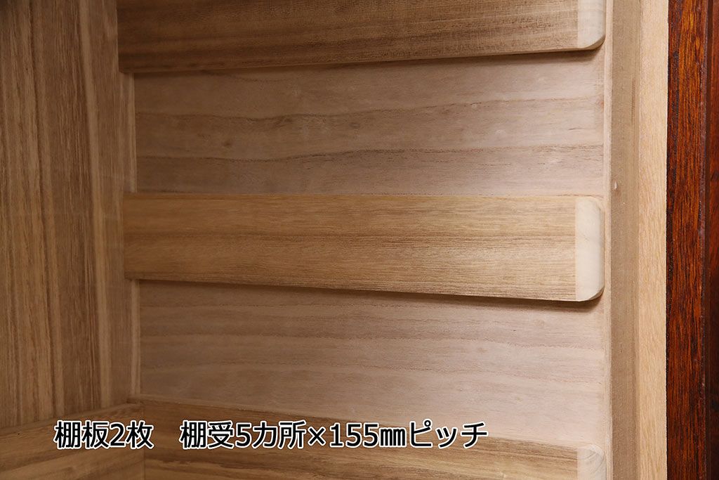 棚板は取り外しできます。棚板は2枚あります。棚受けは5ヶ所、155mmピッチで調整できます。棚幅サイズのものが1枚の作りです。