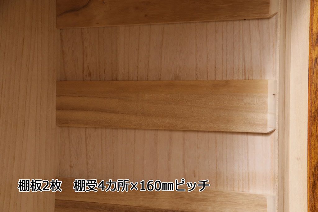 棚板は取り外しできます。棚板は2枚あります。棚受けは4ヶ所、160mmピッチで調整できます。棚幅サイズのものが1枚の作りです。