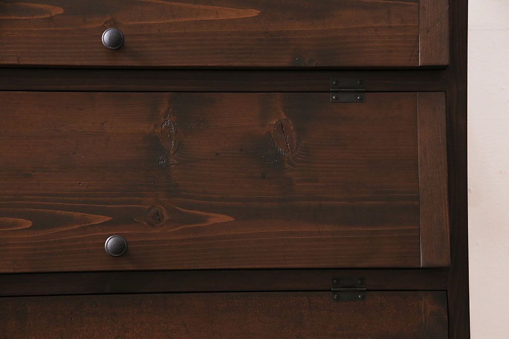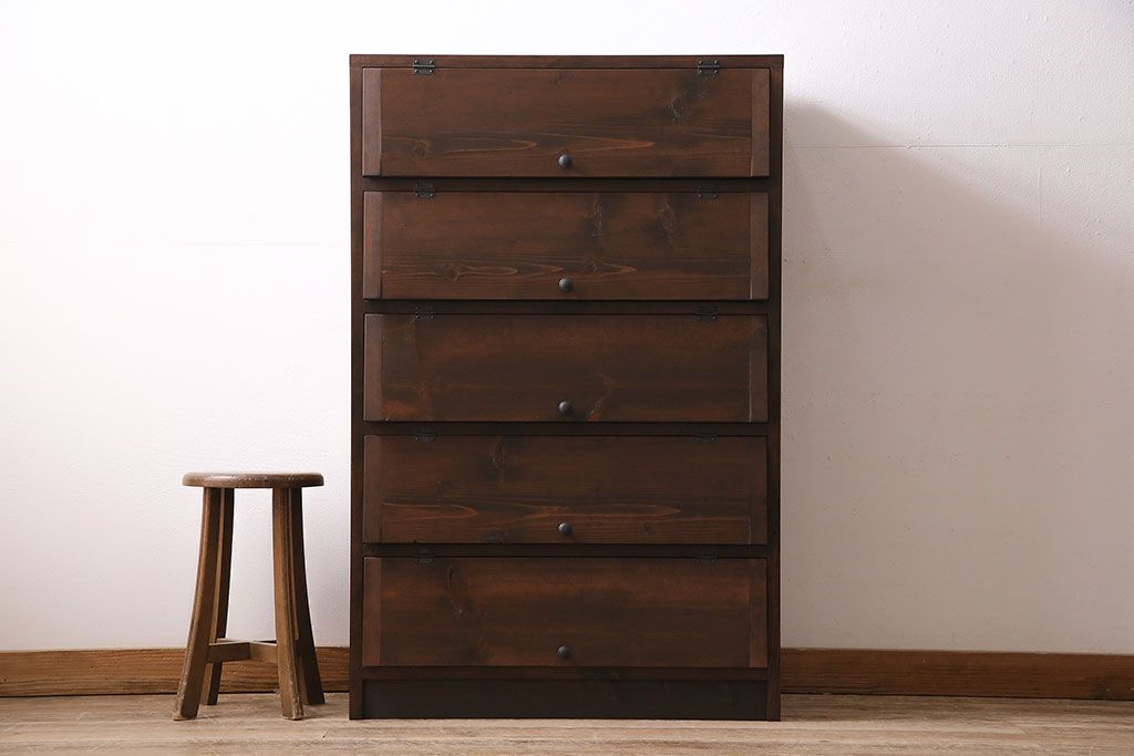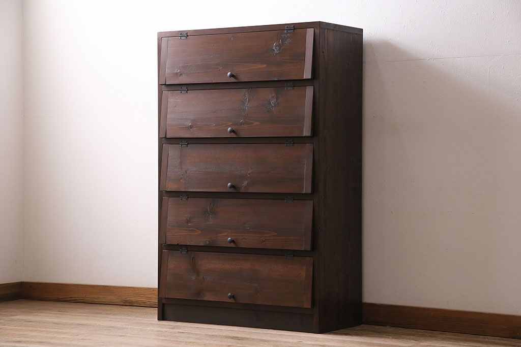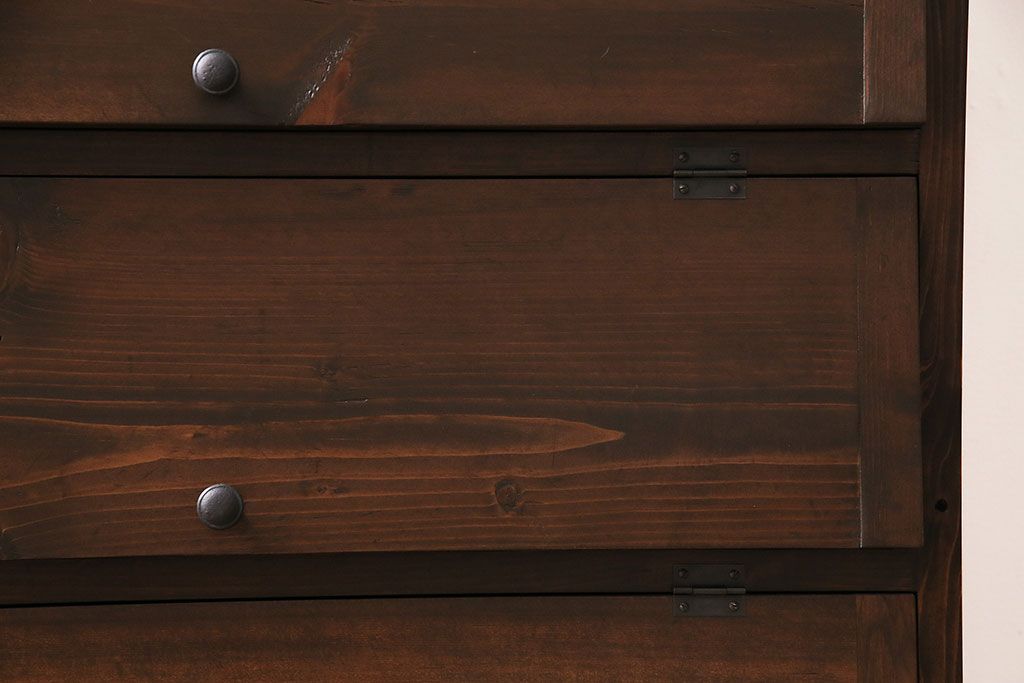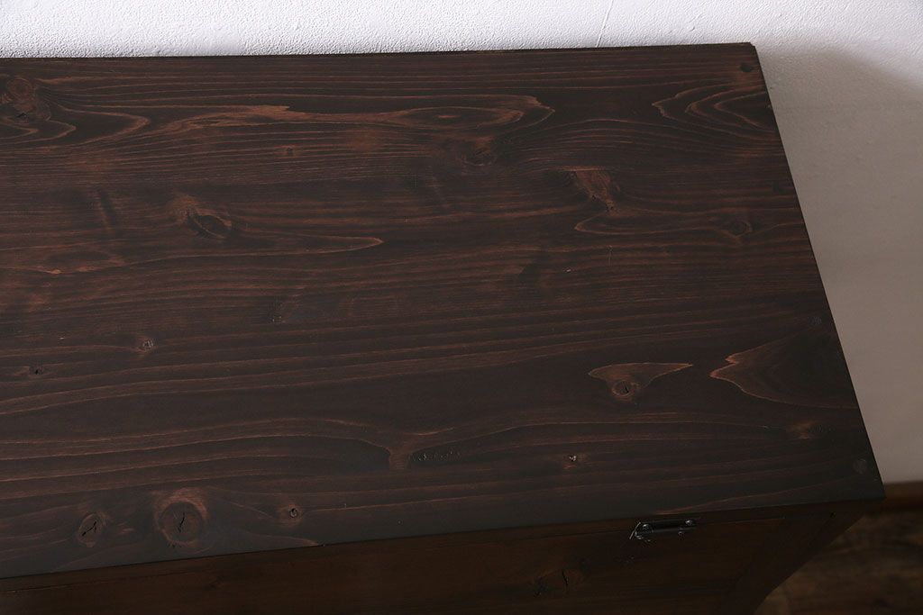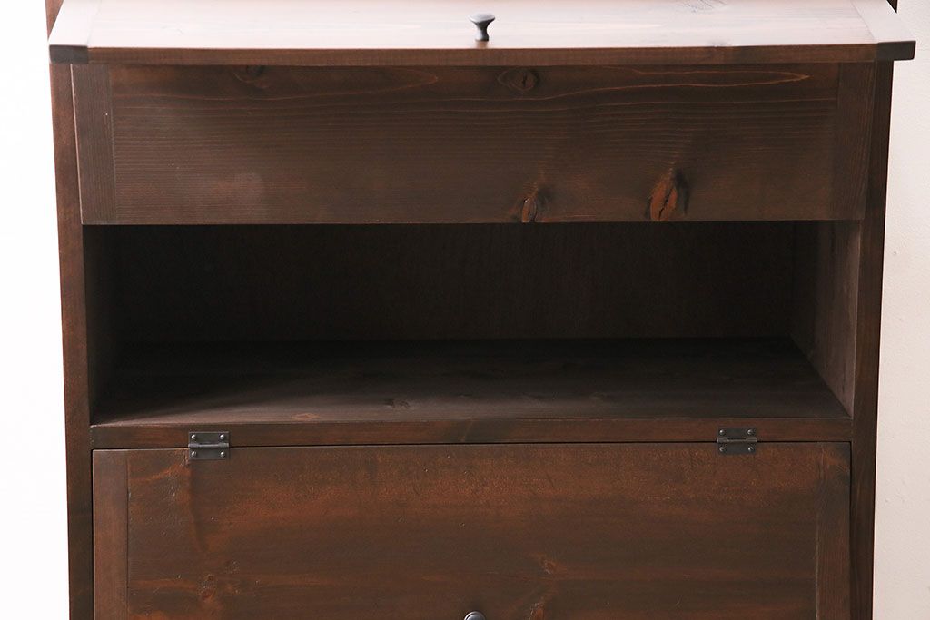 ワードローブ・ロッカー > パタパタ扉の下駄箱を新規製作!本体はヒノキ無垢材、前板は古材を使用。取っ手を取り付け。濃い茶色で着色し仕上げ。(収納棚、戸棚、キャビネット、ロッカー)