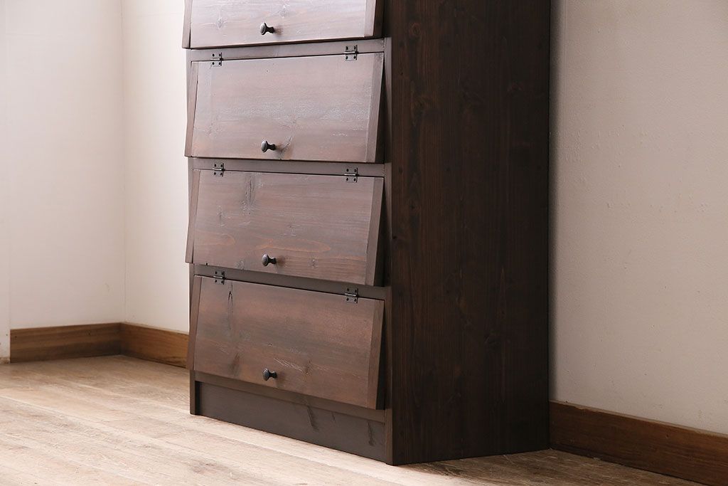 ワードローブ・ロッカー> ロッカー > パタパタ扉の下駄箱を新規製作!本体はヒノキ無垢材、前板は古材を使用。取っ手を取り付け。濃い茶色で着色し仕上げ。(収納棚、戸棚、キャビネット、ロッカー)