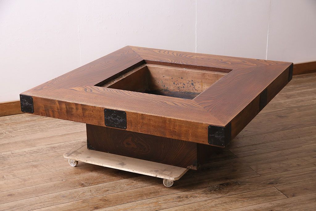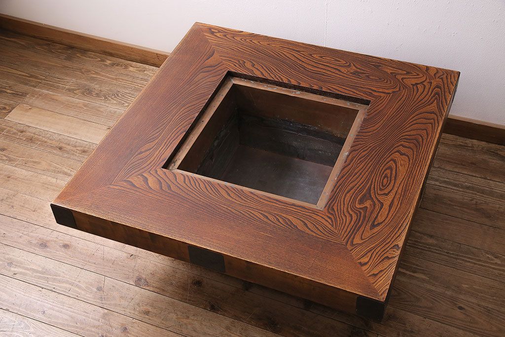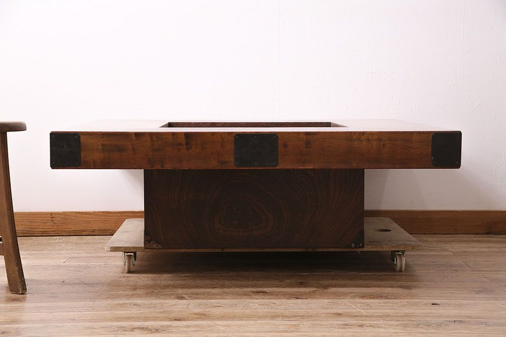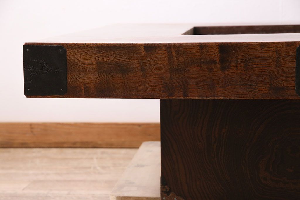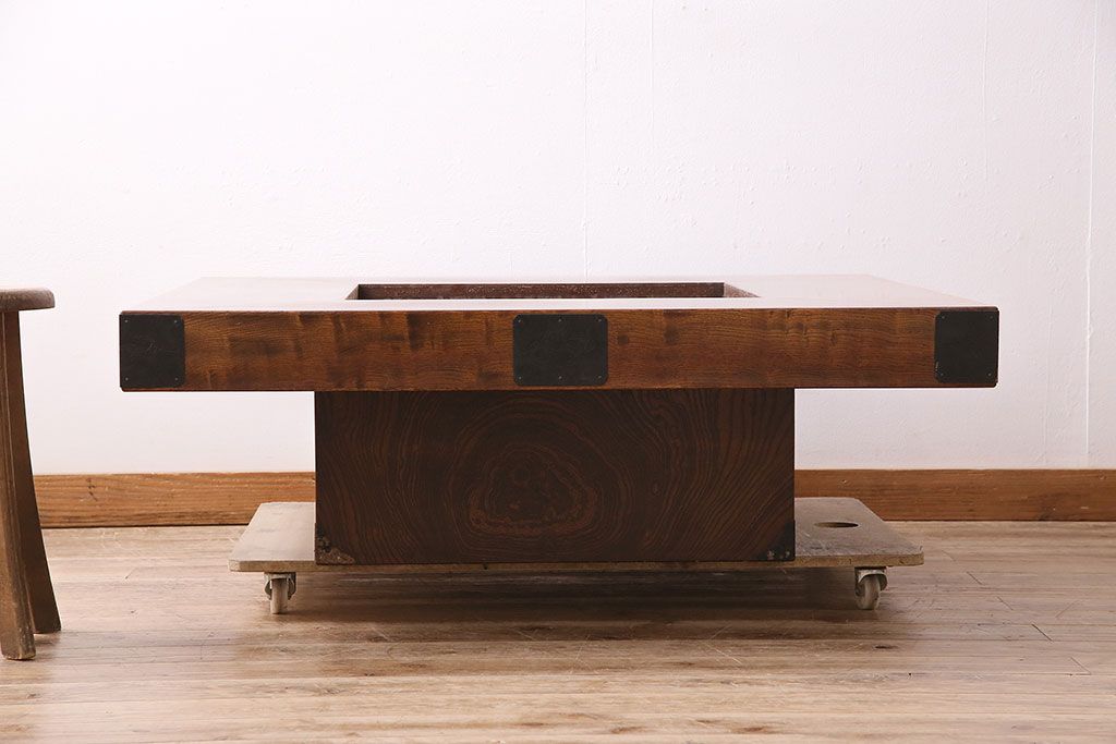 中古 民芸家具 ケヤキ材の迫力ある杢目が楽しめる重厚感抜群の木製火鉢(囲炉裏)(R-047394)