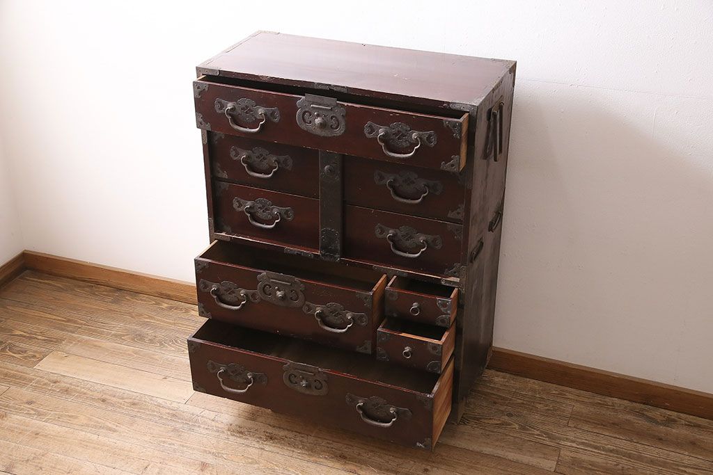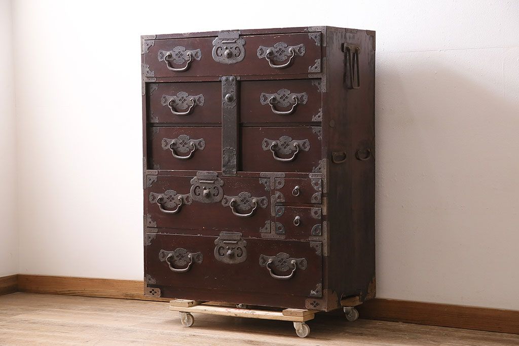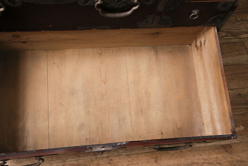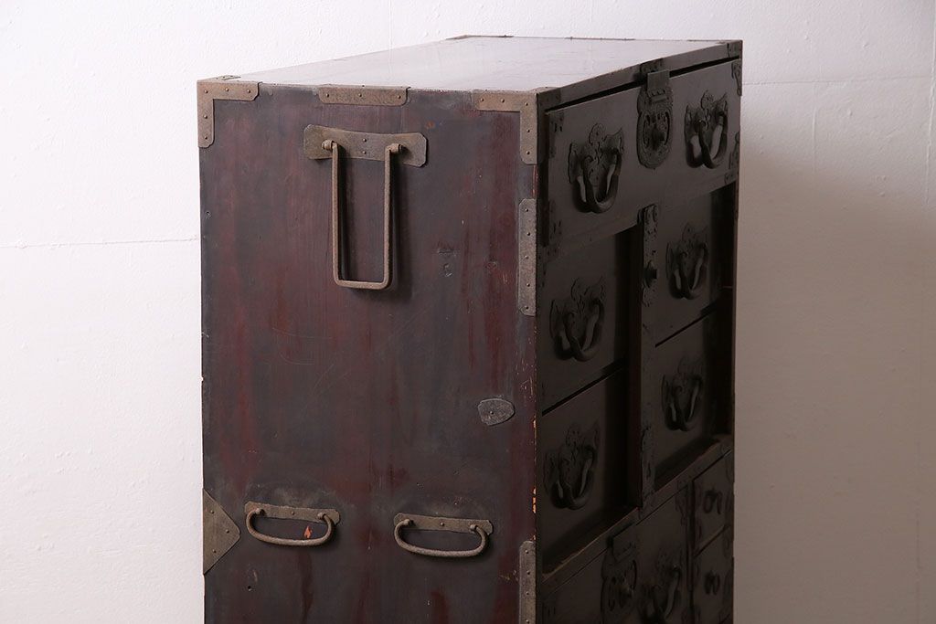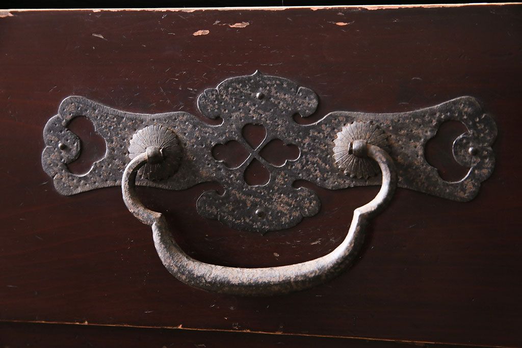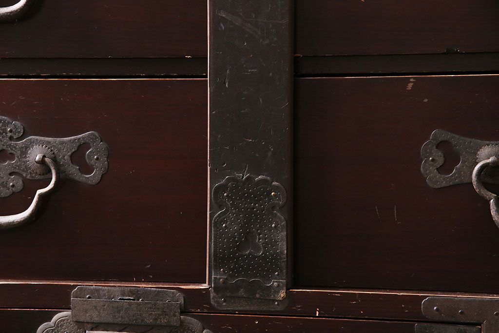 和箪笥 > 和製アンティーク 閂(かんぬき)付き 重厚な金具が目を引く漆塗りの松本衣装箪笥(引き出し、チェスト)(R-047406)
