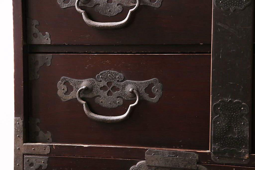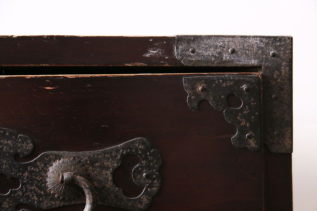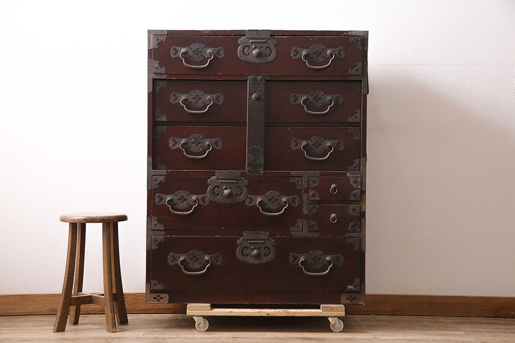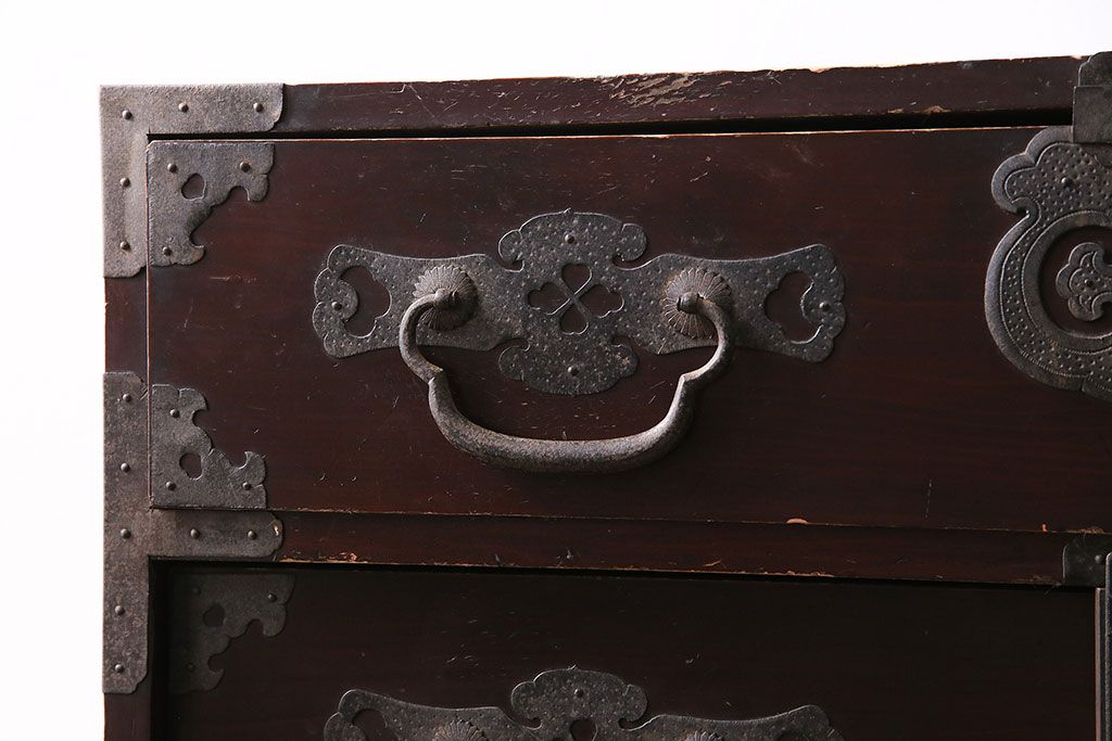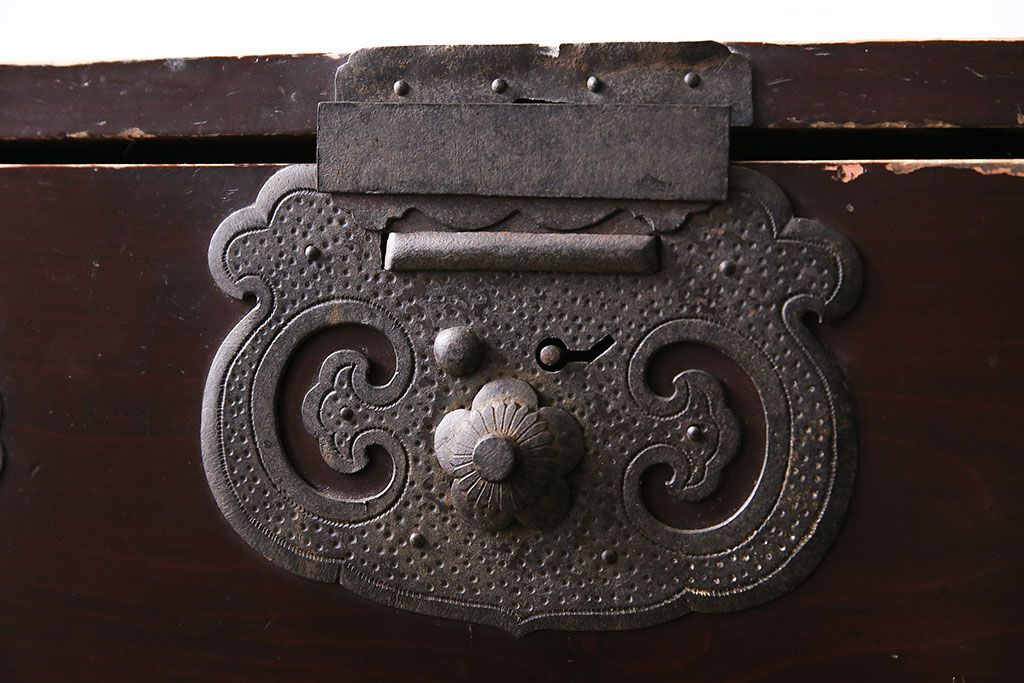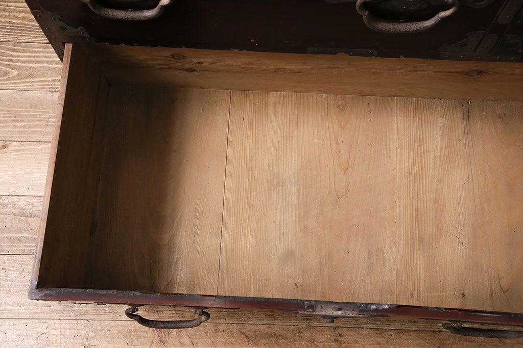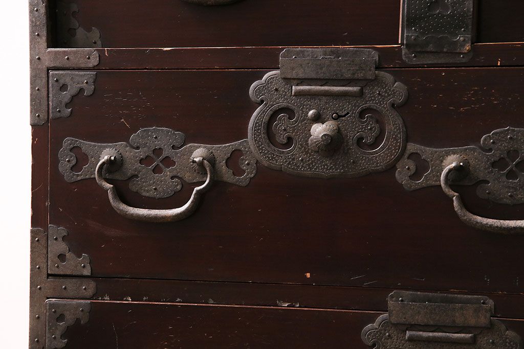 和箪笥 > 和製アンティーク 閂(かんぬき)付き 重厚な金具が目を引く漆塗りの松本衣装箪笥(引き出し、チェスト)(R-047406)