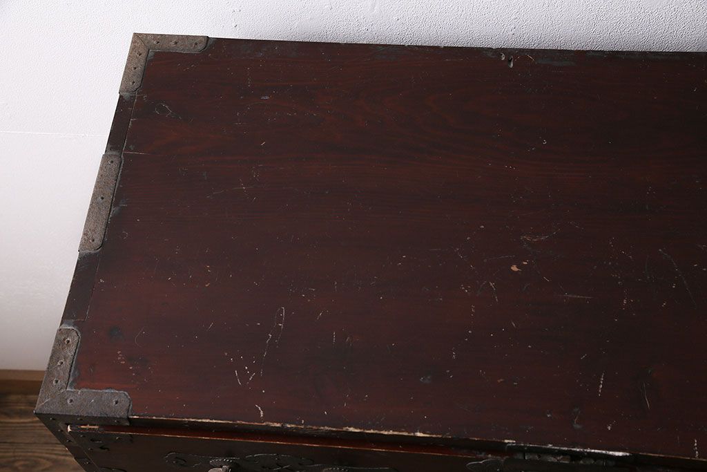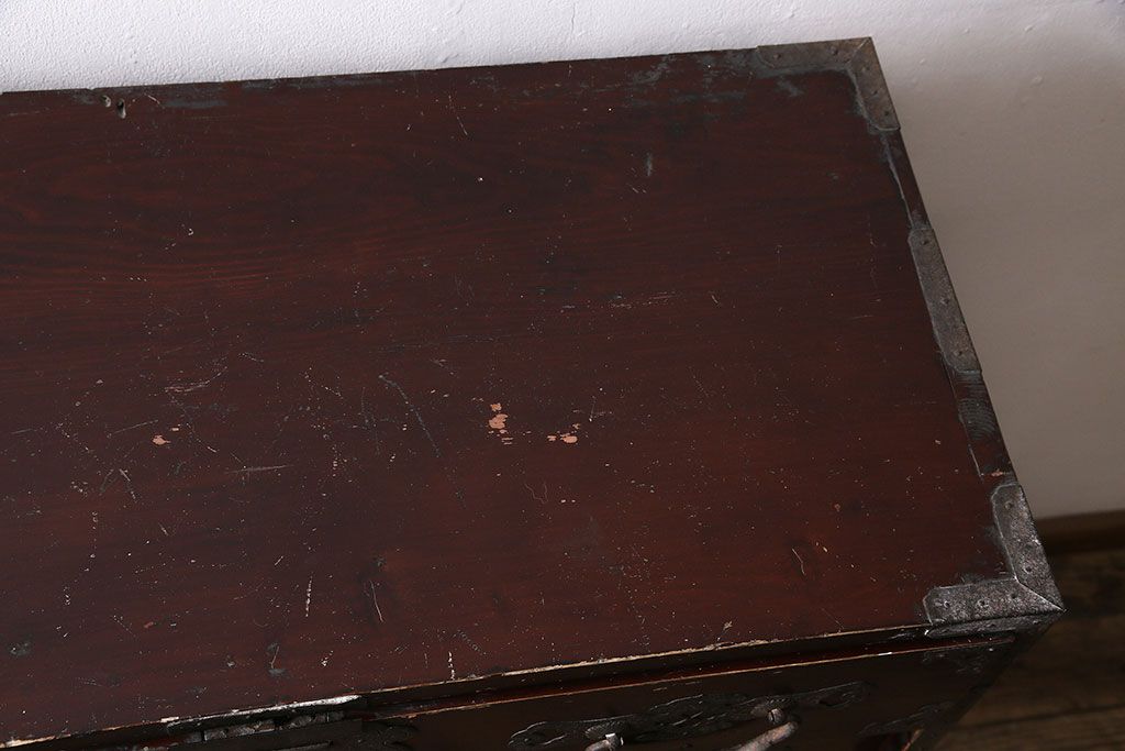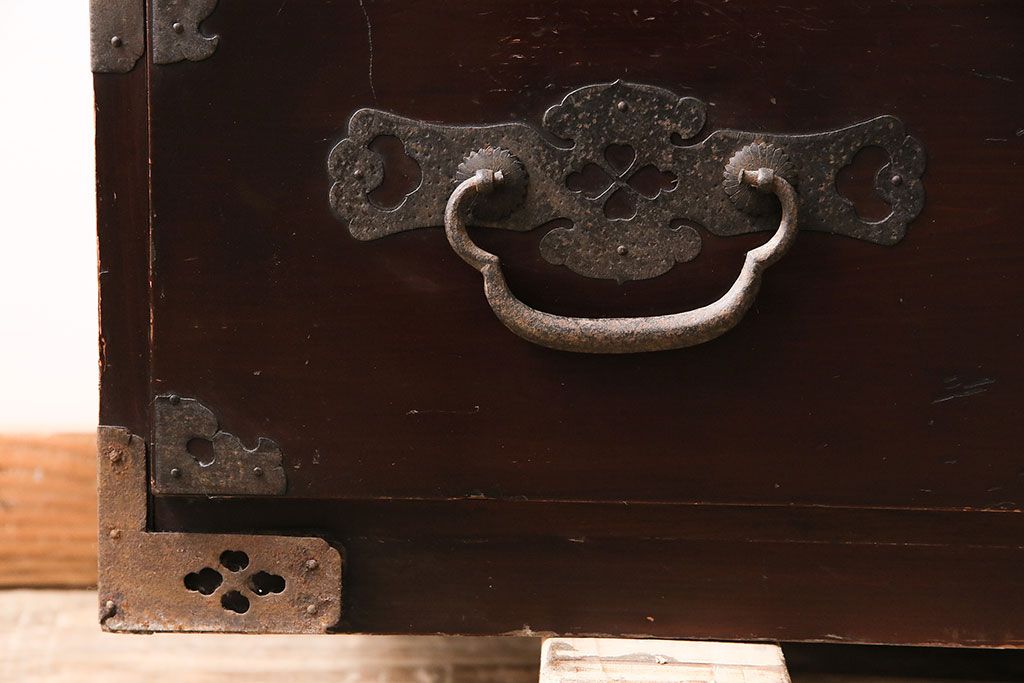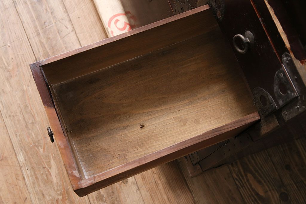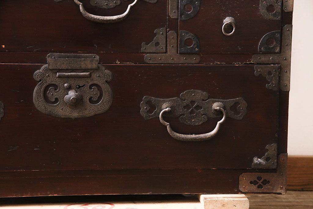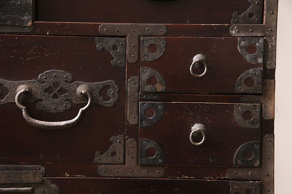和箪笥 > 和製アンティーク 閂(かんぬき)付き 重厚な金具が目を引く漆塗りの松本衣装箪笥(引き出し、チェスト)(R-047406)