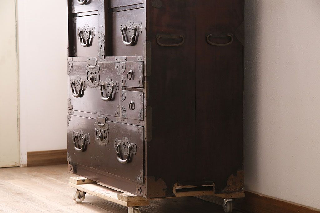 和箪笥> 衣装箪笥 > 和製アンティーク 閂(かんぬき)付き 重厚な金具が目を引く漆塗りの松本衣装箪笥(引き出し、チェスト)(R-047406)