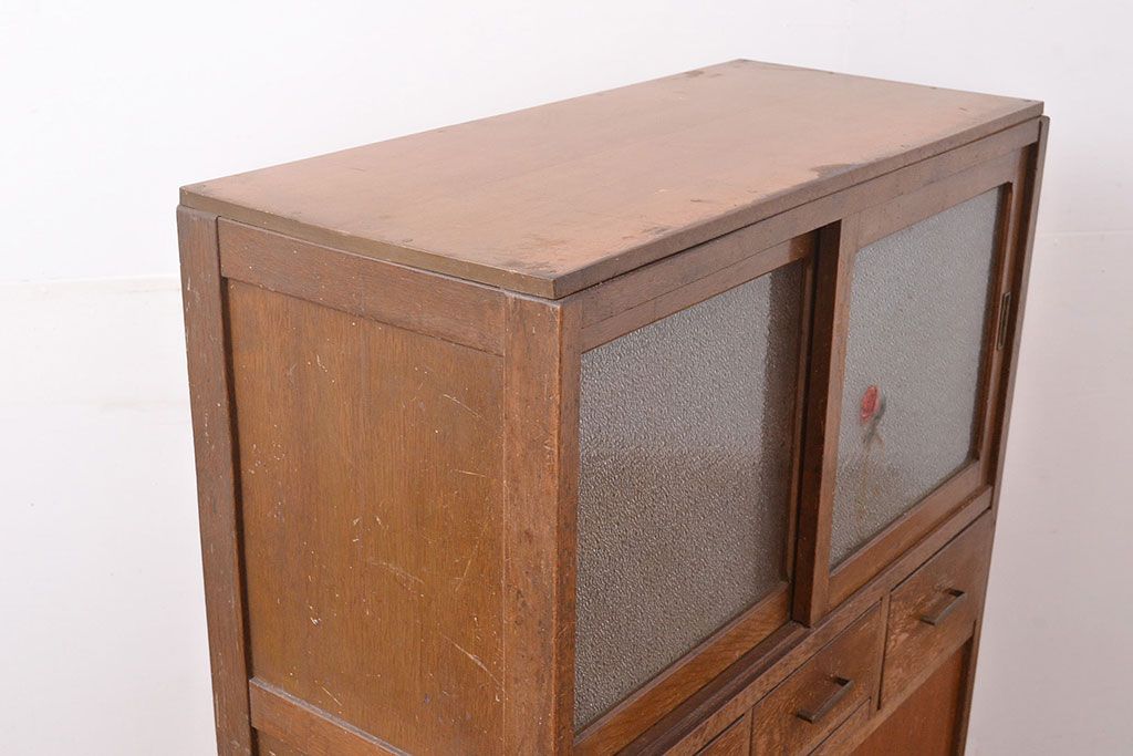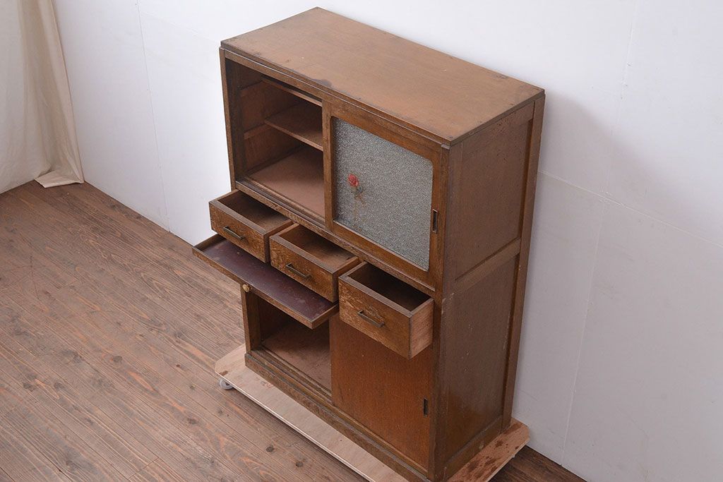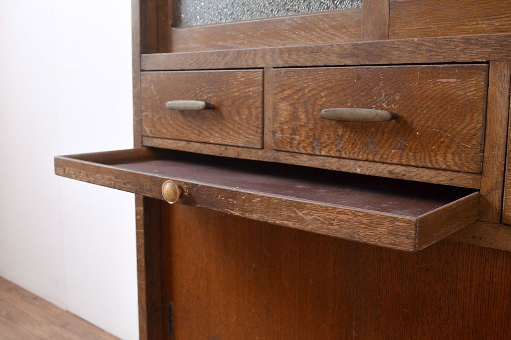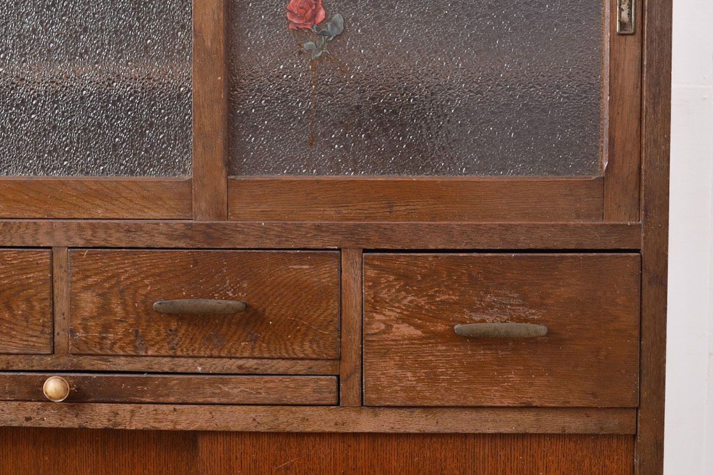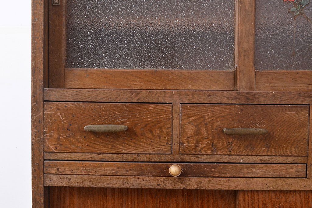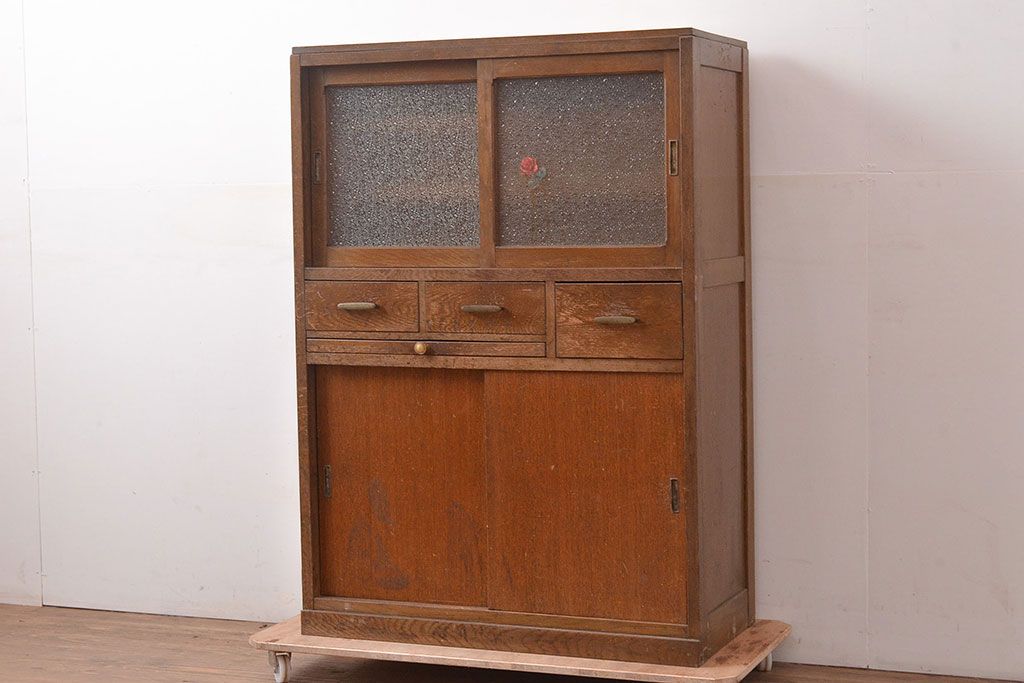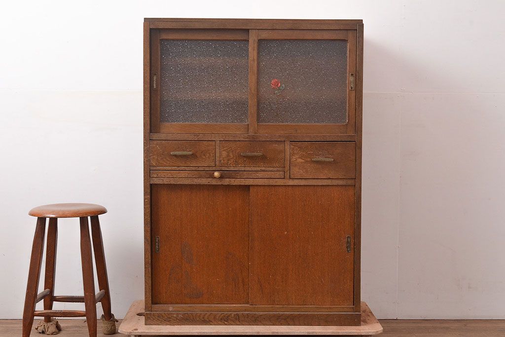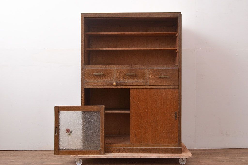 昭和中期 ダイヤガラスが魅力的なナラ材製の作業台付き食器棚(戸棚、収納棚、キャビネット)(R-047497)