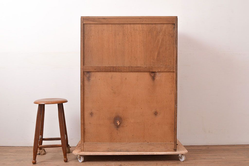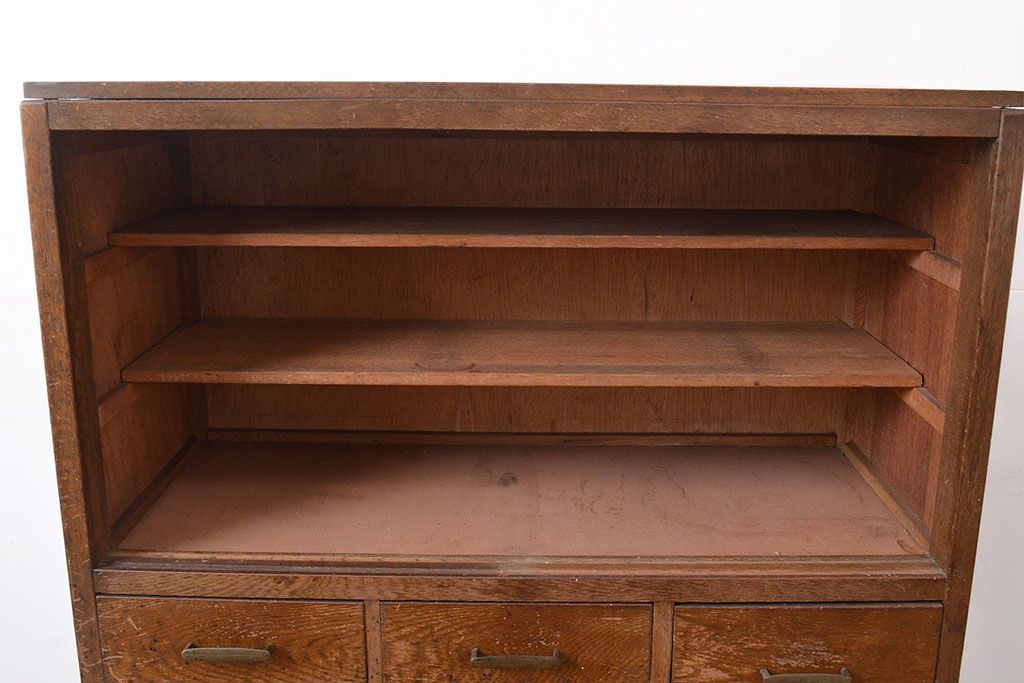 昭和中期 ダイヤガラスが魅力的なナラ材製の作業台付き食器棚(戸棚、収納棚、キャビネット)(R-047497)です。