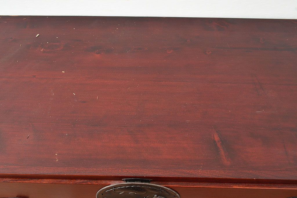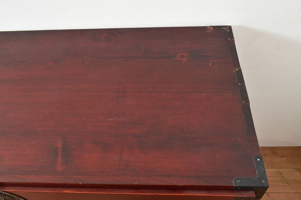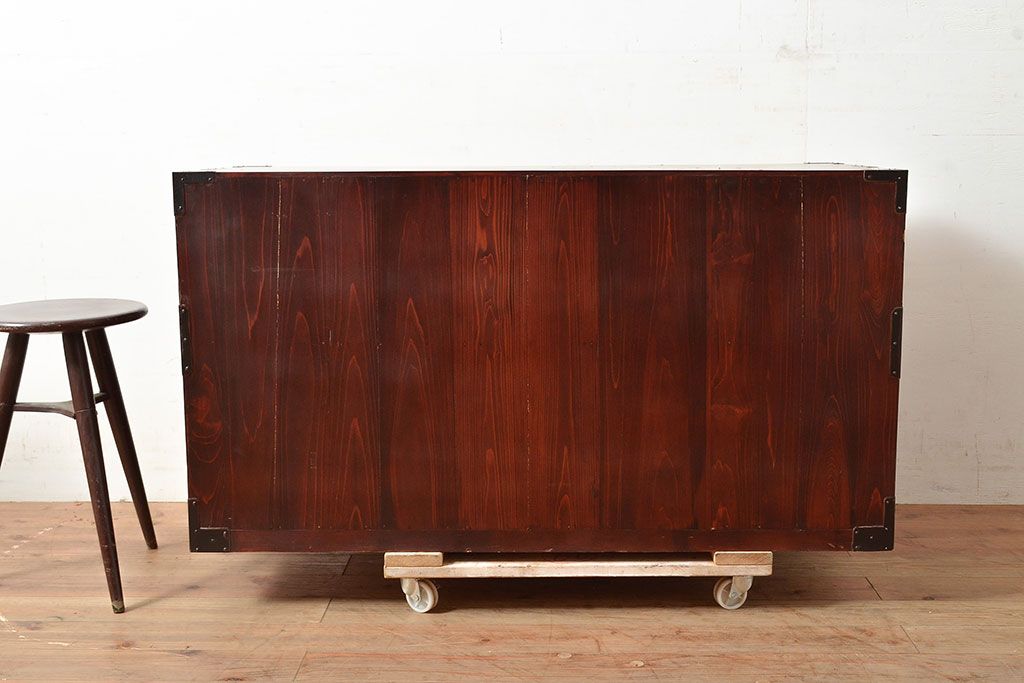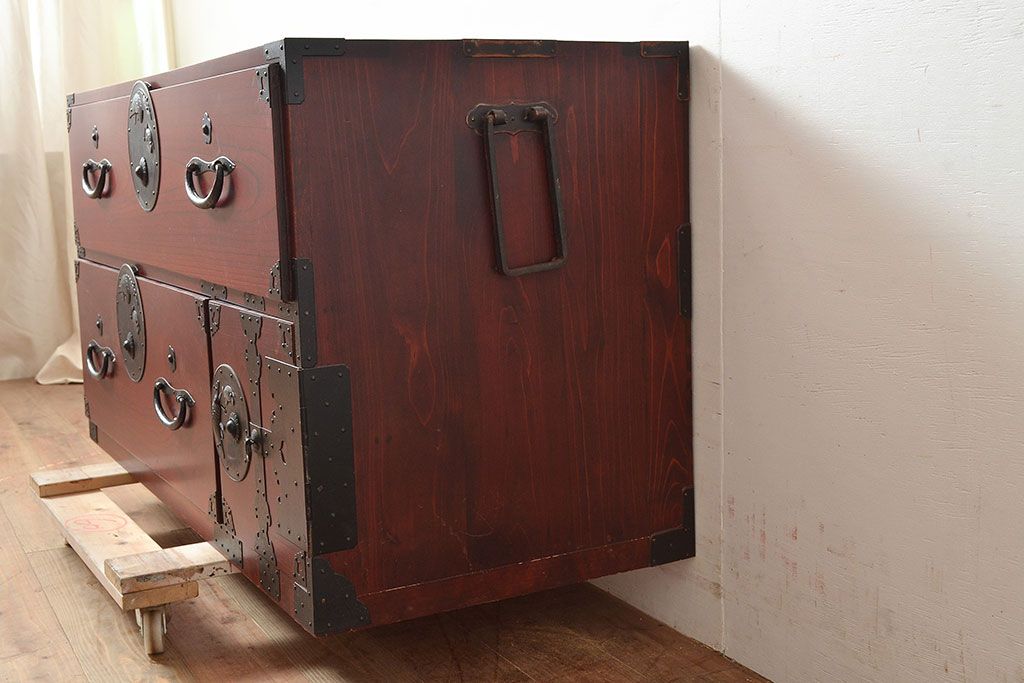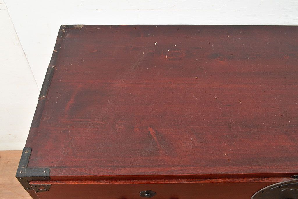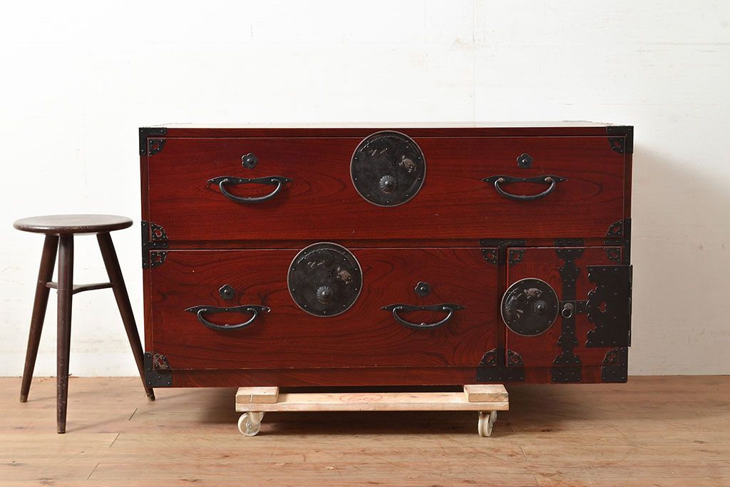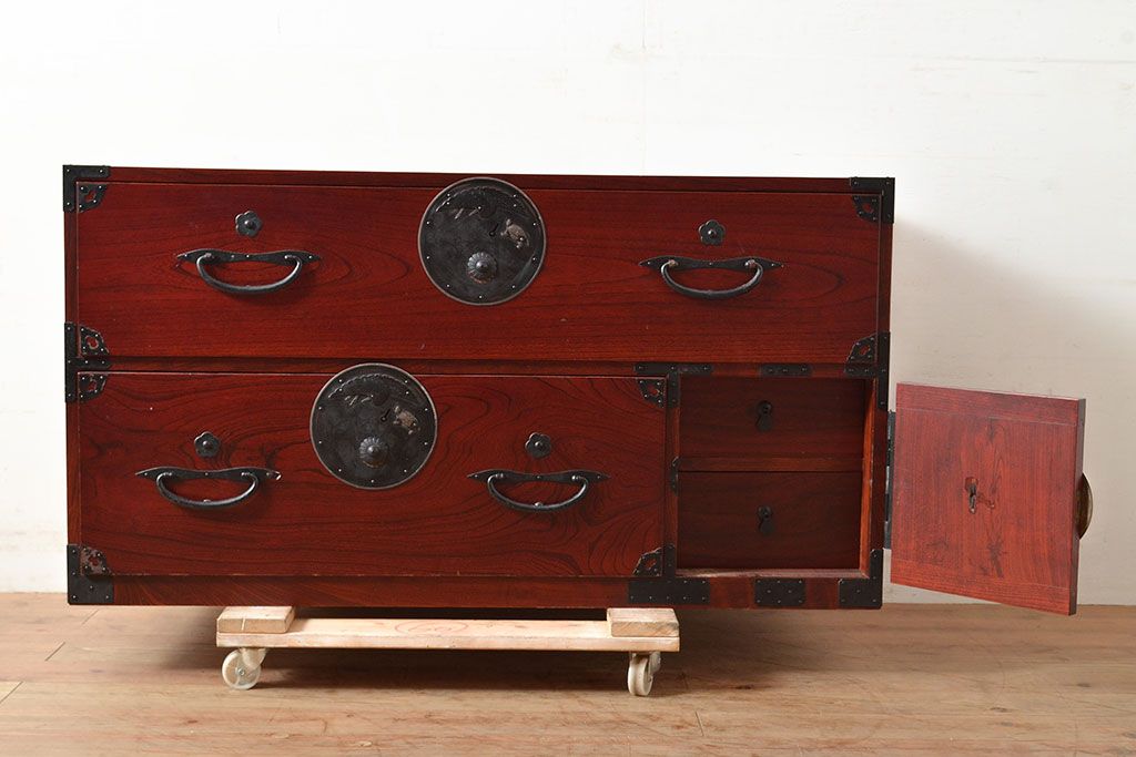 アンティーク 鶴亀金具 赤みが美しい前面欅材製の二本松箪笥ローボード(ローチェスト、衣装箪笥、整理箪笥、引き出し)(R-047420)です。