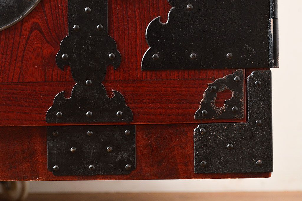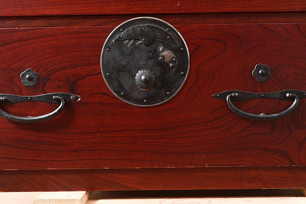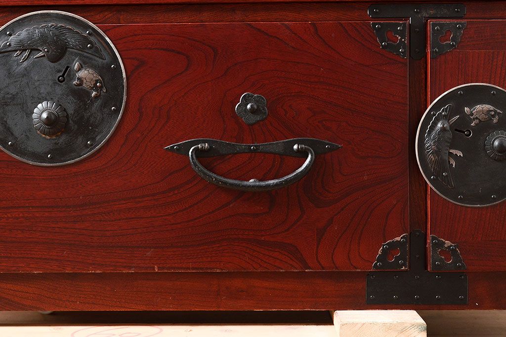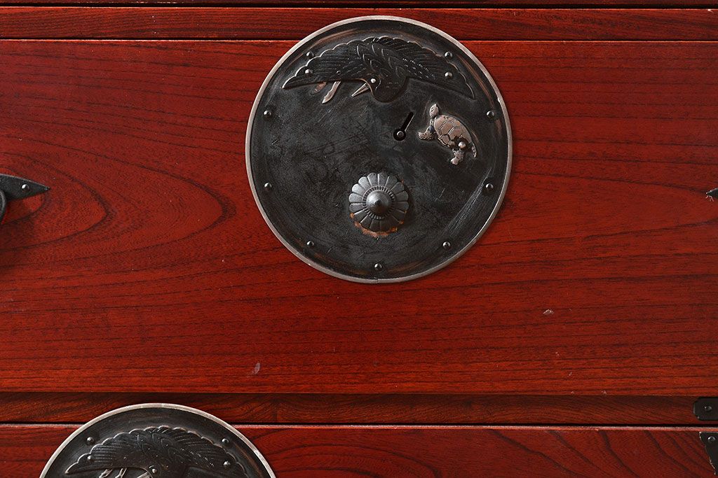 アンティーク 鶴亀金具 赤みが美しい前面欅材製の二本松箪笥ローボード(ローチェスト、衣装箪笥、整理箪笥、引き出し)(R-047420)