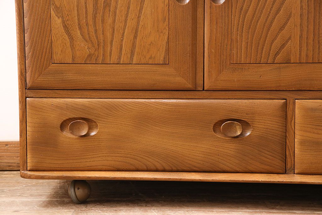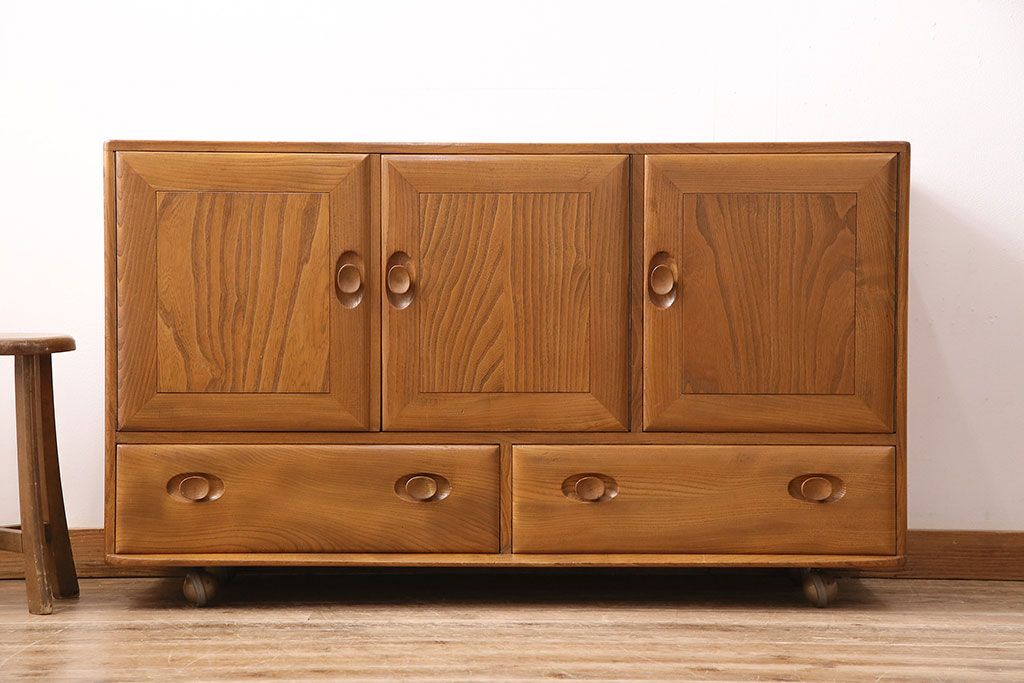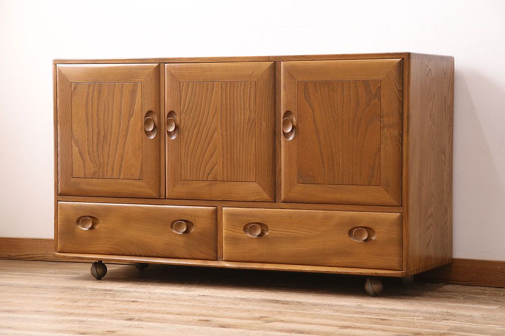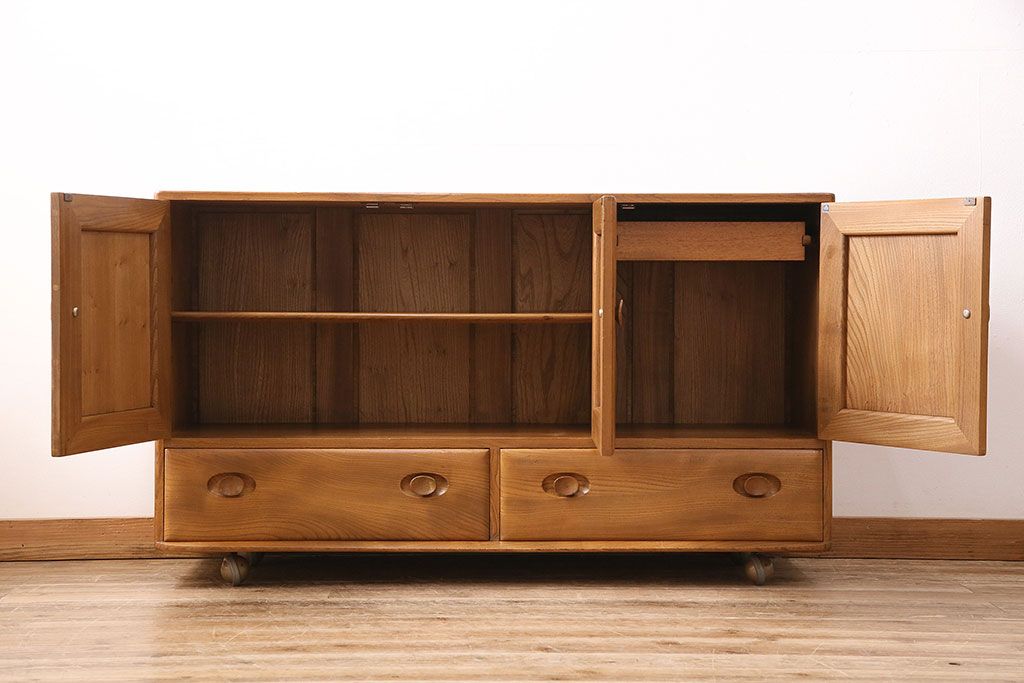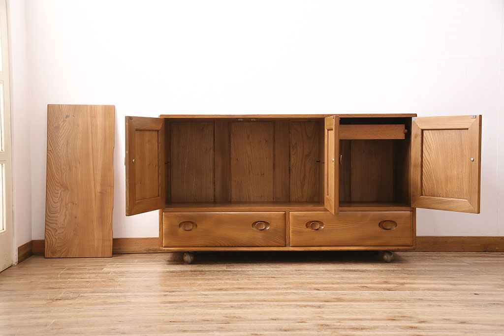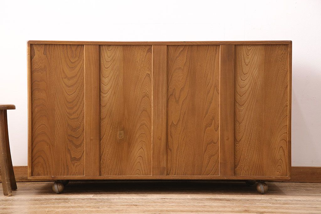 ヴィンテージ 楡材 ERCOL(アーコール) イギリスから届きました!温もり溢れるキャスター付きサイドボード(収納棚、キャビネット、ビンテージ)(R-047684)